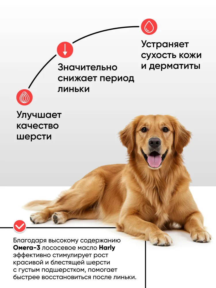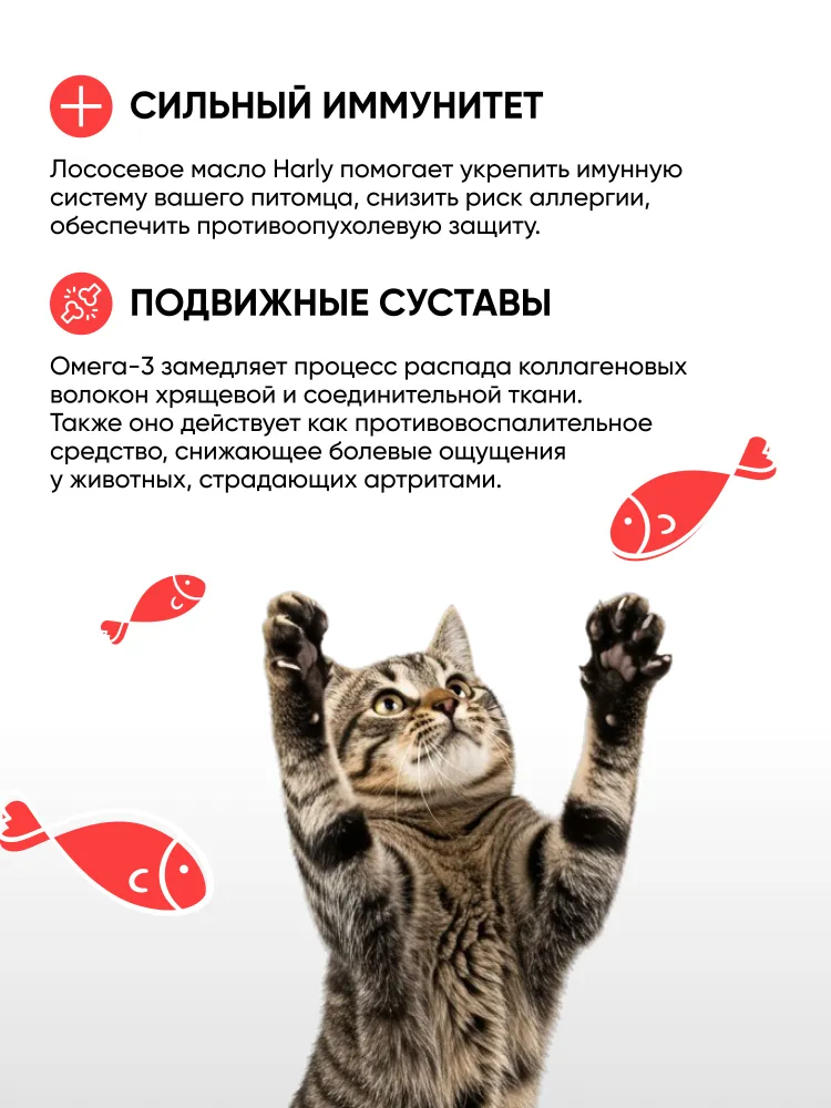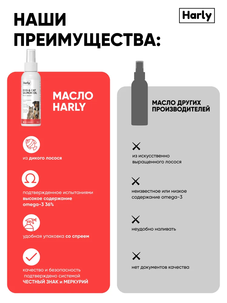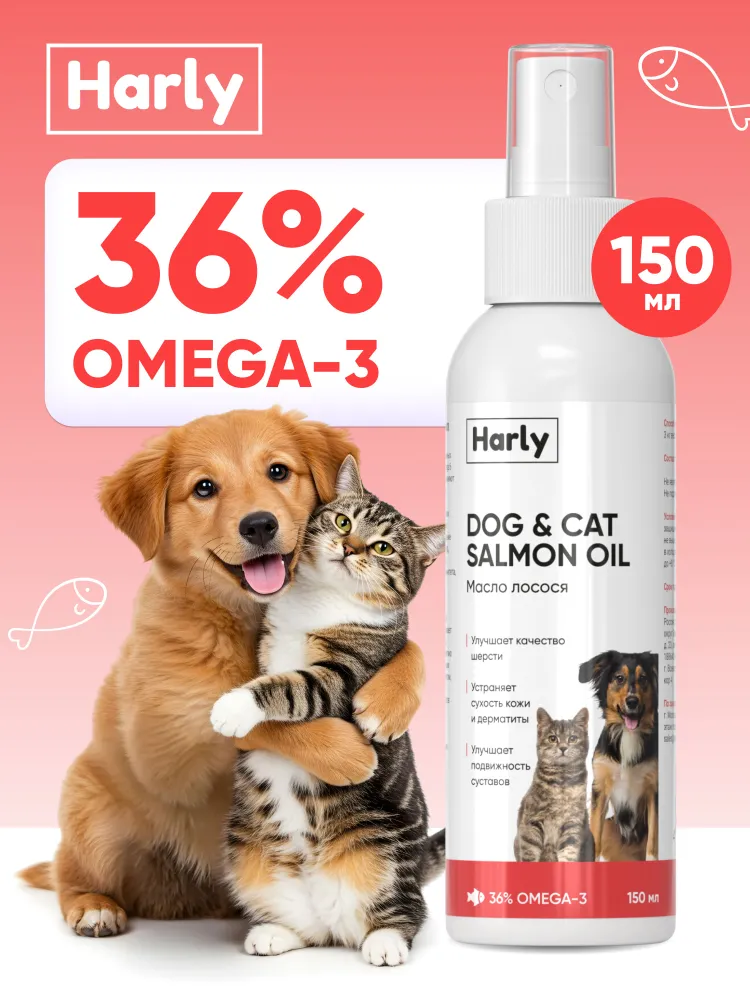 Лососевое масло для собак и кошек Harly объемом 150 мл - это натуральный продукт, получаемый из дикого лосося, обитающего в экологически чистых водах Тихого океана. Масло лосося улучшает качество шерсти собаки и значительно снижает период линьки, устраняя сухость кожи и дерматиты. Добавление масла лосося в рацион вашего питомца, омега 3 для собак и кошек помогает укрепить иммунную систему, снизить риск аллергии. Омега 3 для животных, замедляет распад коллагеновых волокон, способствуя поддержанию здоровья хрящей и соединительных тканей. Лососевое масло для собак и кошек витаминная добавка для животных всех пород. Масло лосося с omega 3 подходит для щенков и для взрослых питомцев, включая собак мелких пород. Использование рыбьего жира для собак и кошек становится все более популярным товаром для животных среди владельцев домашних питомцев, благодаря его многочисленным преимуществам. С помощью омега 3 для животных ваши питомцы получат необходимые витамины и будут чувствовать себя на все 100%.