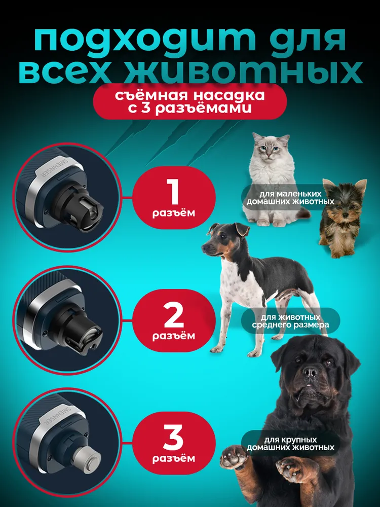Уход за лапками стал проще и безопаснее!Каждый хозяин знает, как сложно подстригать когти питомцу. Кошки или собаки часто нервничают, а процесс может быть неудобным и даже опасным. Но теперь есть решение — электрический гриндер для когтей , который превратит этот рутинный процесс в легкую и комфортную процедуру для вас и вашего любимца.✨ Почему стоит выбрать именно этот гриндер?🌟 Безопасность: Насадка бережно обрабатывает когти, исключая риск повреждений. Ваш питомец будет чувствовать себя спокойно, а вы — уверенно.⚡ Эффективность: Быстро и качественно стачивайте когти.🐾 Универсальность: Подходит для большинства видов домашних животных — от маленьких кошек до крупных пород собак. Независимо от размера и толщины когтей, этот гриндер справится с задачей.💨 Низкий уровень шума: Благодаря продуманной конструкции устройство работает практически бесшумно, что особенно важно для пугливых питомцев.🔋 Долгое время работы: Встроенный аккумулятор обеспечивает автономную работу до 3 часов после полной зарядки. Забудьте о проводах и ограничениях по месту использования!💡 Как это работает?Включите гриндер. Аккуратно поднесите коготь питомца к вращающейся насадке.Плавно стачивайте кончик когтя, следуя естественной форме.Теперь уход за когтями станет приятной процедурой, которую ваш питомец будет воспринимать спокойно.🔒 Качество и надежность :Изготовлен из высококачественных материалов, этот гриндер прослужит долгие годы. Его эргономичная форма и легкий вес делают использование максимально удобным даже для длительных сеансов.🎁 Что входит в комплект?ГриндерUSB-кабель для зарядки