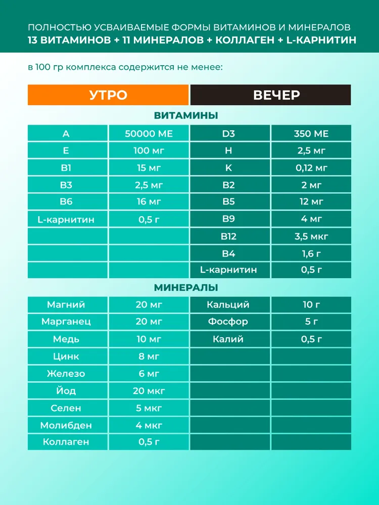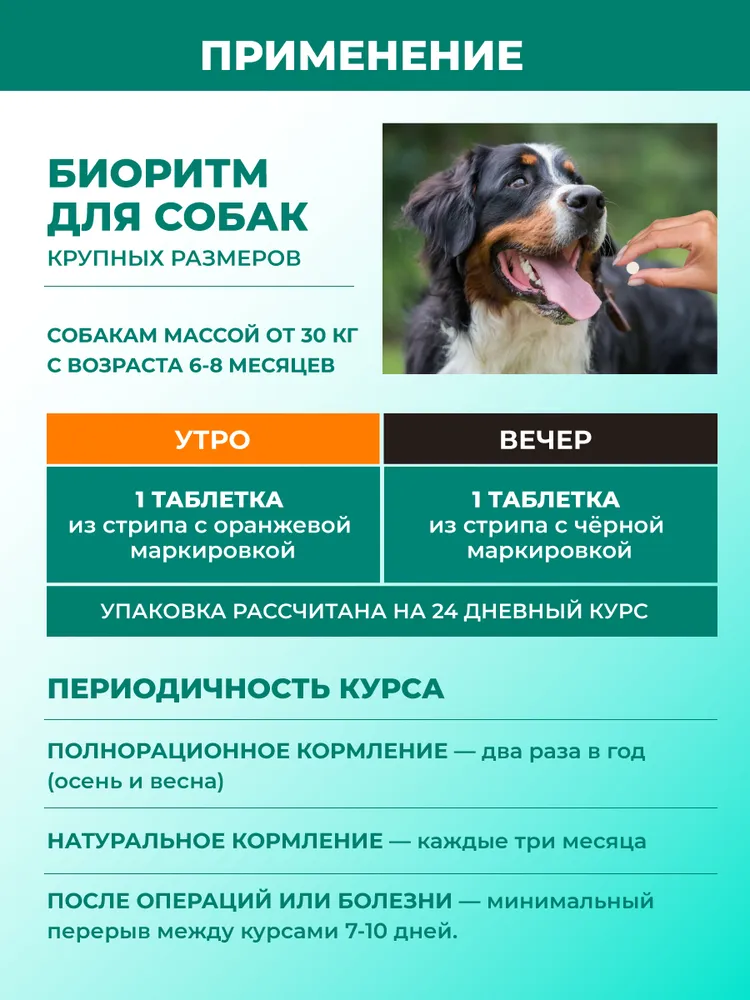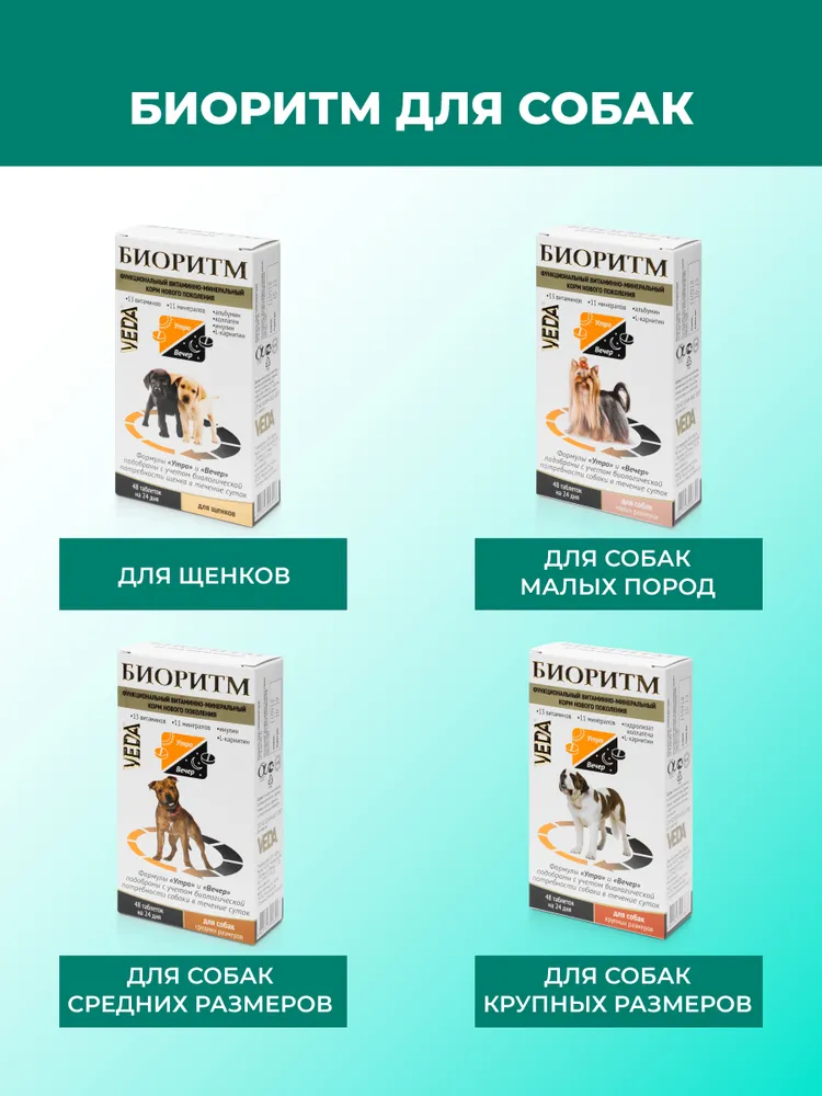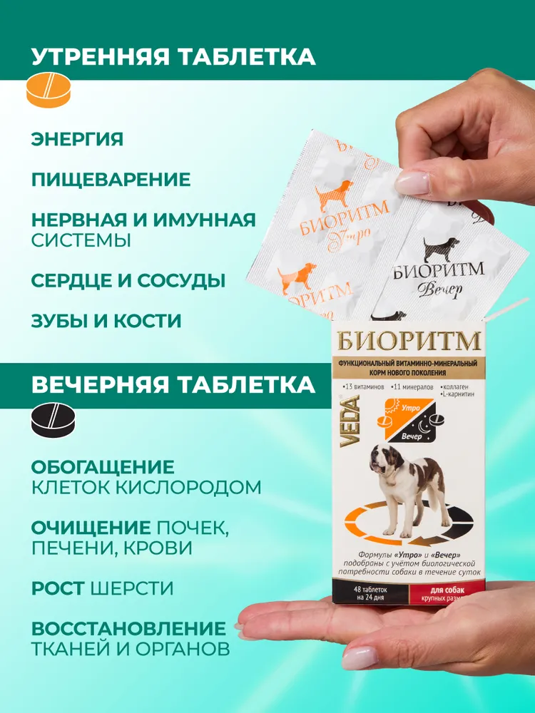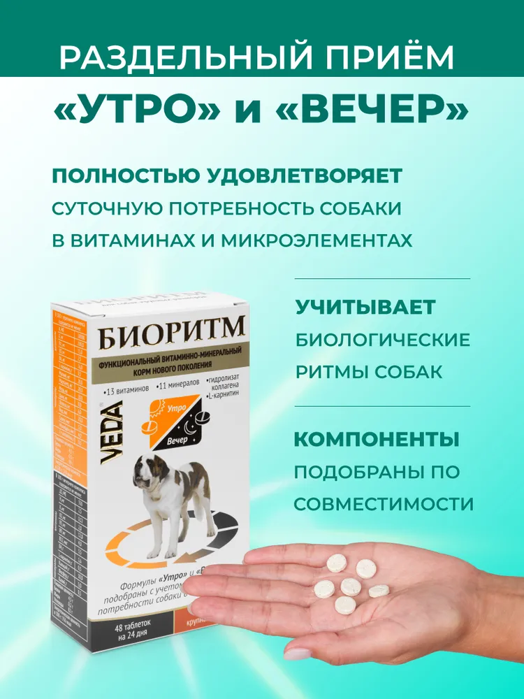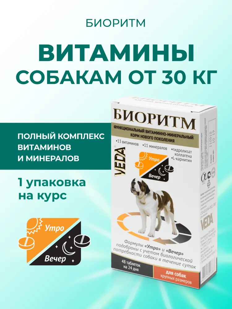 Биоритм для собак крупных размеров (более 30 кг) – витаминно-минеральный комплекс из 13 витаминов, 11 минералов, L карнитина и гидролизата коллагена. Мультивитаминный комплекс удовлетворяет суточную потребность собак крупных пород в витаминах и микроэлементах.-Разделение на утренний и вечерний прием учитывает биологические ритмы собак.- Состав подобран с учетом размера собаки.- Полезные вещества скомпонованы по совместимости.-Полностью усваиваемые формы витаминов и минералов.-L-карнитин обеспечивает правильный метаболизм жиров, приток энергии, силу мышц, помогает здоровой работе сердца и печени.Мультикомплекс Биоритм разработан с учетом потребностей различных групп питомцев: от молодых активных до пожилых, стареющих собак, для беременных и кормящих (при кормлении) сук. Средство поддерживает в норме состояние организма животного в целом, обладает общеукрепляющими и профилактическими свойствами, содержит витамины А, группы В, Д3, Е, Н, минеральные элементы.Применение препарата:-По одной таблетке 2 раза в день перед кормлением.-Утром - таблетка из стрипа с оранжевой маркировкой.-Вечером - таблетка из стрипа с черной маркировкой.Формулы «Утро» и «Вечер» разработаны с учетом биологической потребности организма больших собак и в соответствии с рекомендациями по раздельному и совместному приему полезных веществ. В результате эффективность витаминной профилактики повышается на 30–50%.Упаковка рассчитана на 24-дневный курс. После перерыва 7-10 дней можно проводить повторный курс.Витаминно-минеральная добавка дополнит собачий рацион при любом способе кормления: натуральная пища, сухие или влажные корма.Линейка продуктов БИОРИТМ от российского производителя ВЕДА - это зоотовары высокого класса, которые содержат наиболее эффективные компоненты премиум качества для здоровья и красоты домашних питомцев.