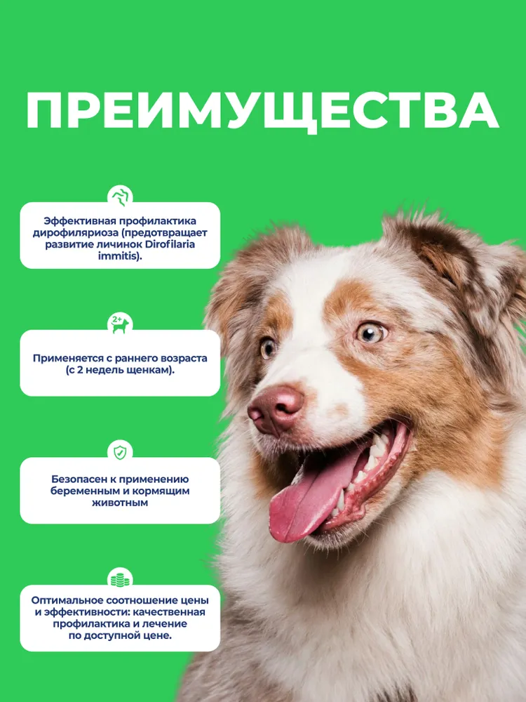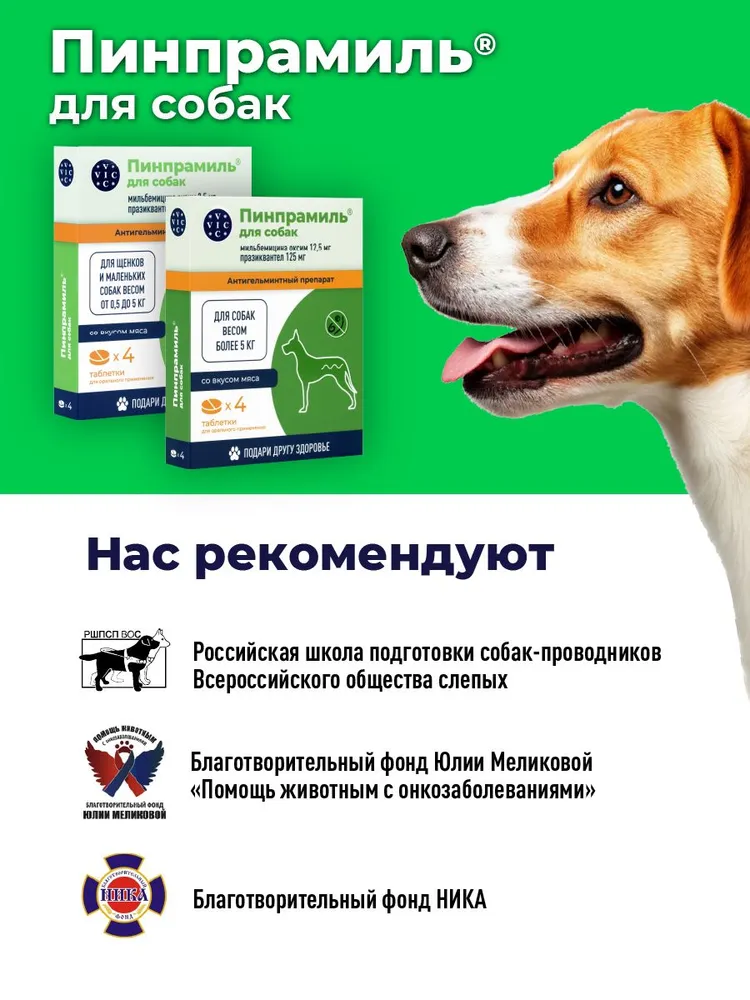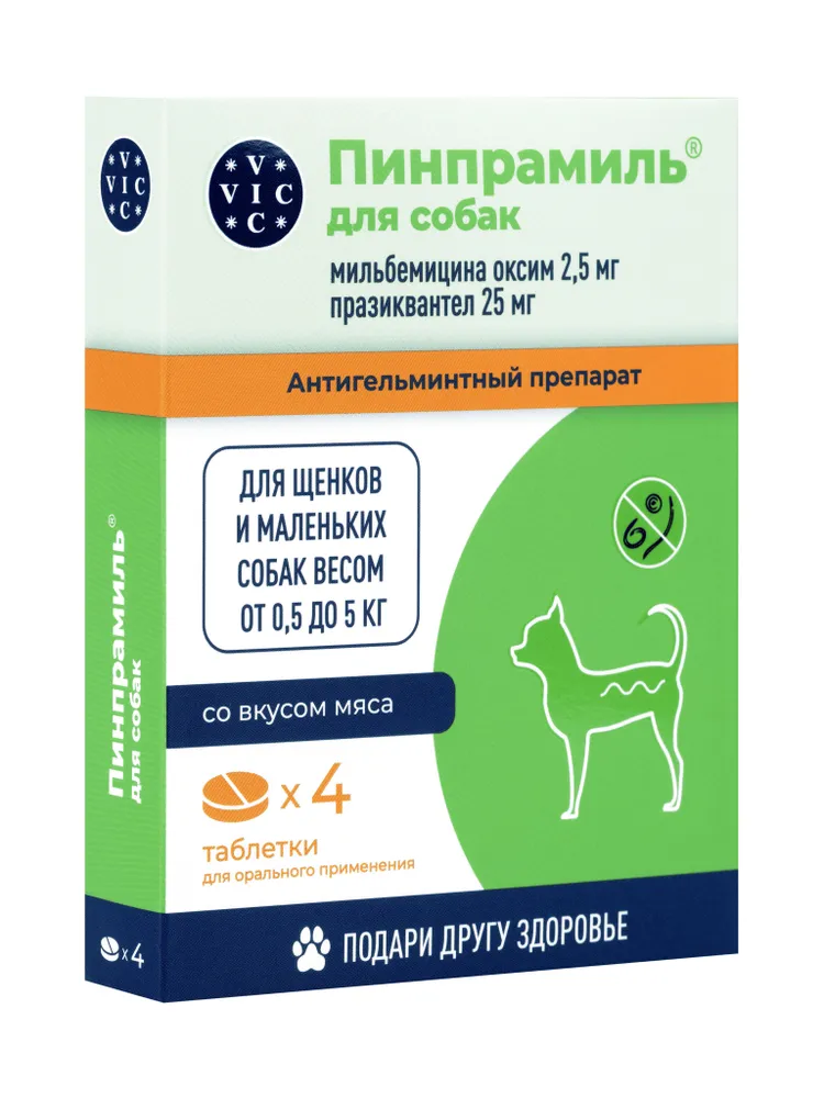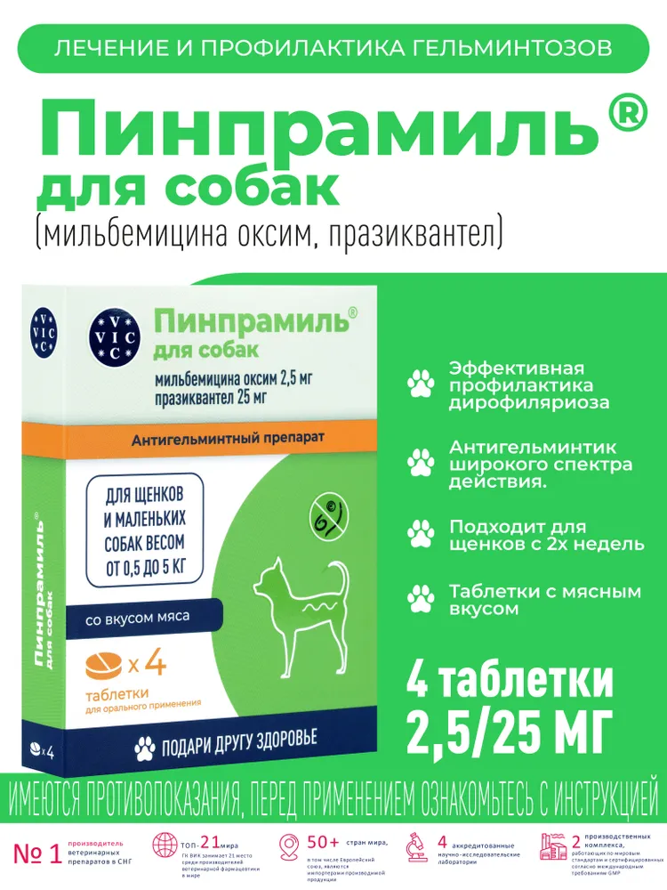 Пинпрамиль – это высокоэффективный антигельминтный препарат, разработанный специально для щенков и собак мелких пород. Российский аналог препарата Мильбемакс, средство для борьбы с паразитами. Пинпрамиль помогает бороться с различными видами гельминтов, обеспечивая здоровье и комфорт вашего питомца. Глистогонное средство в большой упаковке (4 таблетки) удобно для курсового применения и длительной защиты.Преимущества:Универсальность: эффективен против круглых и ленточных червей.Безопасность: разрешен для применения у щенков с 2-недельного возраста, а также у беременных и кормящих собак.Удобство: таблетки с привлекательным вкусом и ароматом, которые легко давать питомцу.Экономичность: большая упаковка (4 таблетки) идеальна для курсового применения.Показания к применению:Лечение и профилактика гельминтозов.Профилактика дирофиляриоза (при ежемесячном применении в сезон комаров).Дегельминтизация при инвазиях, вызванных Angiostrongylus vasorum и Thelazia callipaeda.Применение:Дозировка:Собаки весом 0,5–1 кг – ½ таблетки.Собаки весом 1–5 кг – 1 таблетка.Собаки весом 5–10 кг – 2 таблетки.Режим применения:Для профилактики гельминтозов – 1 раз в 3 месяца.Для профилактики дирофиляриоза – ежемесячно в сезон комаров (начиная за месяц до начала лёта и заканчивая через месяц после его окончания).Для лечения инвазий – по рекомендации ветеринара (например, четырехкратно с интервалом 7 суток).Особенности:Не требует предварительной голодной диеты или применения слабительных средств.Совместим с селамектином (другие макроциклические лактоны требуют консультации ветеринара).Побочные эффекты: Побочные явления встречаются редко, но возможны:Вялость, атаксия, тремор мышц.Рвота или диарея.При передозировке: угнетенное состояние, слюнотечение, шаткая походка (симптомы проходят самостоятельно в течение суток).Важно!При появлении побочных эффектов прекратите применение препарата и обратитесь к ветеринару.Перед началом курса дегельминтизации проконсультируйтесь с ветеринарным врачом, особенно при подозрении на дирофиляриоз.Этот препарат рекомендован ветеринарией как глистогонка. Таблетки от глистов удобны в применении и помогают справиться с различными видами паразитарных инфекций.