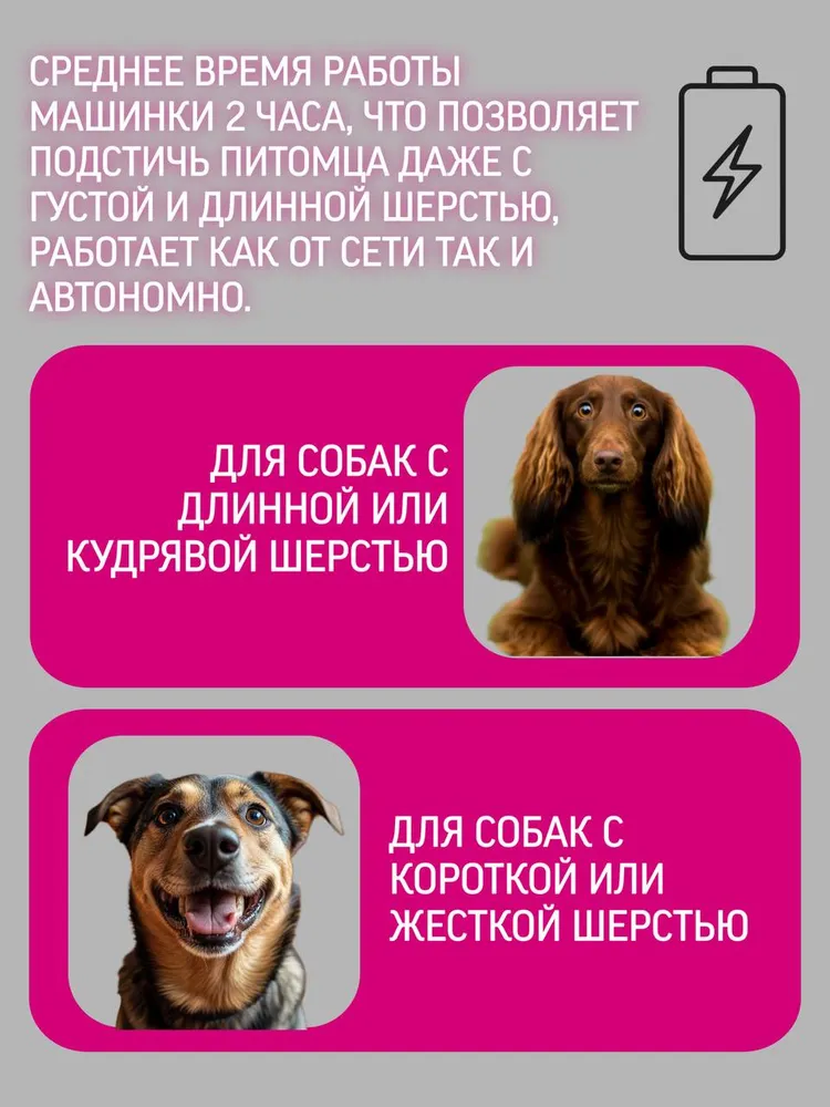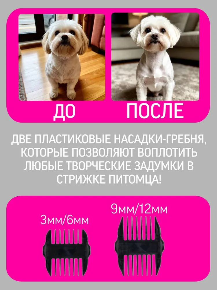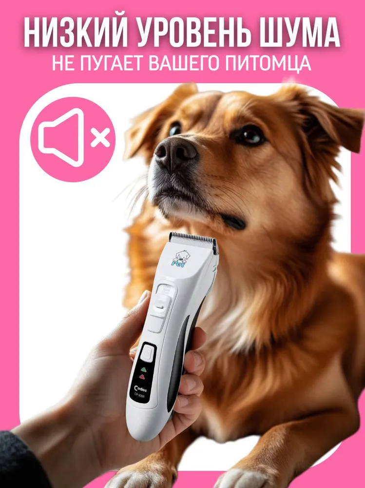 Профессиональная машинка для стрижки животных Codos СР9200 удобная - идеально подходит для гигиенической стрижки любого типа волос и шерсти. Мощная машинка для стрижки домашних животных прекрасно справится и с жесткой, и с мягкой шерстью, и с "колтунами". Электрическая машинка для стрижки волос подойдет для стрижки, окантовки и подравнивания бороды. Li-ion аккумулятор машинки для груминга заряжается 1,5 часа и 2 часа работает без проводов. Триммер для стрижки собак Кодос может работать от сети. В комплекте 2 пластиковые насадки при помощи, которых можно регулировать 4 варианта длины стрижки: 3 мм, 6 мм, 9 мм и 12 мм, также регулируется длина стрижки ножом. Бесшумная работа машинки для стрижки собак и кошек снизит стресс и уровень тревожности животных. Острый металлокерамический нож триммера для стрижки домашних животных при необходимости можно сменить на новый. У машинки для ухода за шерстью нужно регулярно чистить съемный нож и смазывать специальным маслом (идут в комплекте).