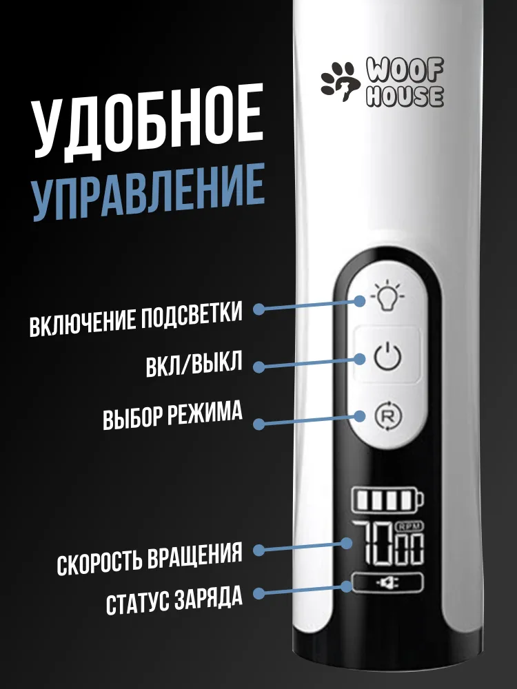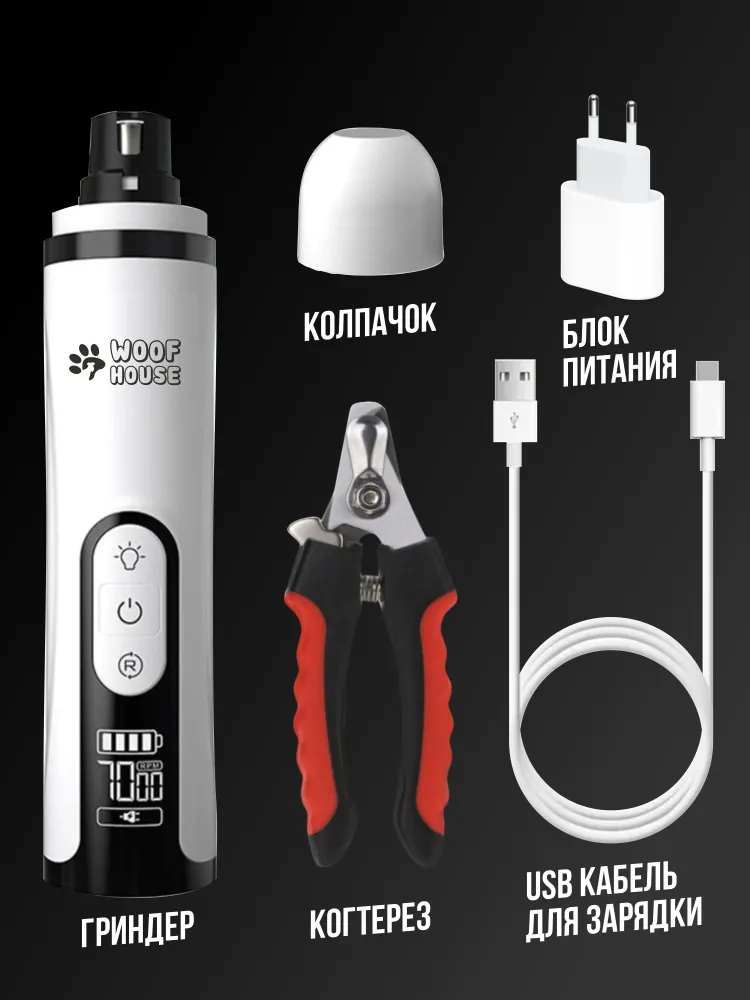 Гриндер для обточки когтей и когтерезка - незаменимая вещь в арсенале каждого владельца питомцев.Набор делает процесс ухода за лапками животного безопасным, подразумевая аккуратную механическую обточку когтей, а когтерез - помогает безболезненно срезать когтище у домашних любимцев. Гриндер для кошек и собак имеет 2 встроенных диода для подсветки, благодаря которым полностью исключена возможность снять лишние миллиметры и нанести травму вашему любимцу. Мотор с тремя режимами работы, позволит выбрать оптимальную скорость вращения шлифовки, которая достигает 9000 оборотов в минуту. Точильный камень имеет алмазное напыление, что увеличивает его срок эксплуатации. В комплекте есть колпачок-насадка на шлифовочный камень с отверстиями, для обтачивания ногтей животных разных размеров. Аппарат не будет пугать вашего питомца благодаря низкому уровню шума (до 40 дб). Девайс оснащен встроенным аккумулятором, время автономной работы до 8 часов, а USB провод с зарядным блоком для РФ розеток позволит зарядить электрическую пилку где угодно.Режущая часть ножниц для стрижки когтей выполнена из высокопрочной стали, лезвия когтерезки со временем не затупляются. Когтерезка со стопором не раскроется при перевозке или переносе, а прорезиненные ручки удобно зафиксируются и не выскользнут из рук, навредив тем самым лапке пушистому другу. Кусачки для подстригания оснащены ограничителем благодаря которому не получится обрезать лишнюю длину коготка.