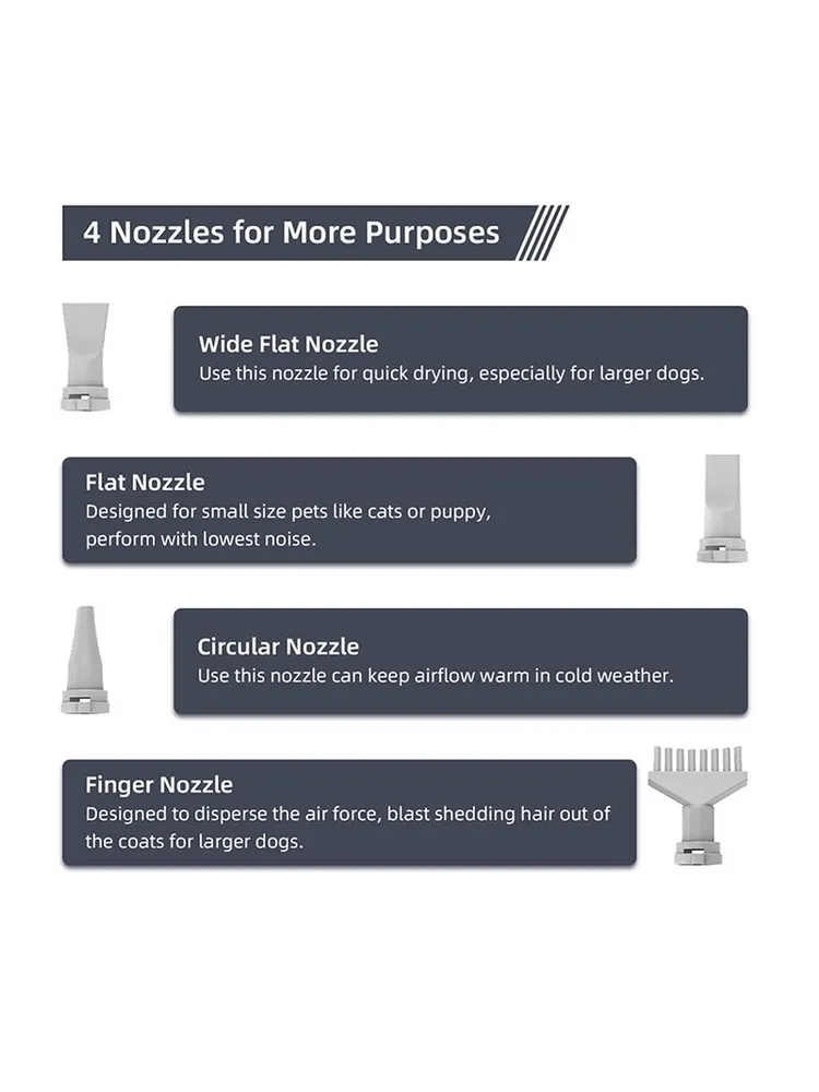 Комплектация:1 * Фен для домашних животных1 * Утолщенный воздуховод3 * Сменная насадка для выдувания
