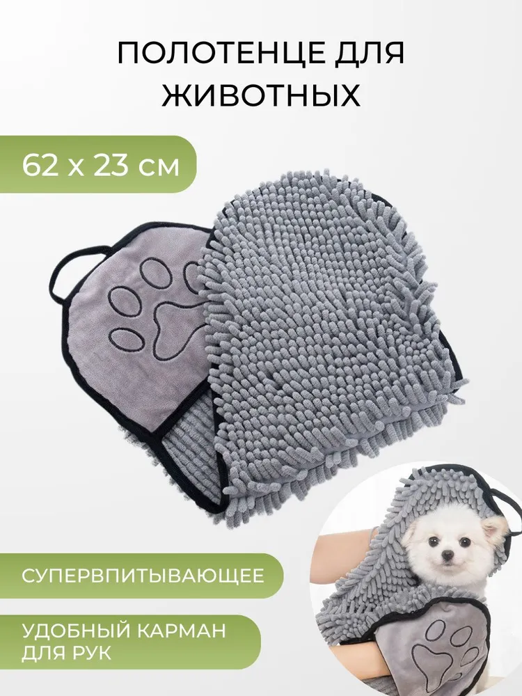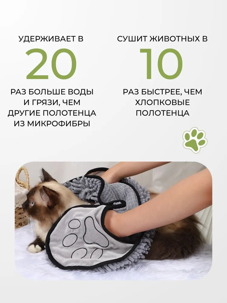 Преимущества, которые вы оцените🌟 Инновационная технология впитывания: наше полотенце способно удерживать в 20 раз больше воды и грязи по сравнению с обычными полотенцами из микрофибры. Забудьте о множестве мокрых полотенец после одного купания!⚡ Молниеносная сушка: полотенце высушит вашего питомца в 10 раз быстрее обычных хлопковых полотенец. Больше никакого дискомфорта для вашего любимца!👐 Удобные карманы для рук: обеспечивает максимальное удобство использования. Теперь вы можете легко контролировать процесс вытирания даже самого активного питомца.