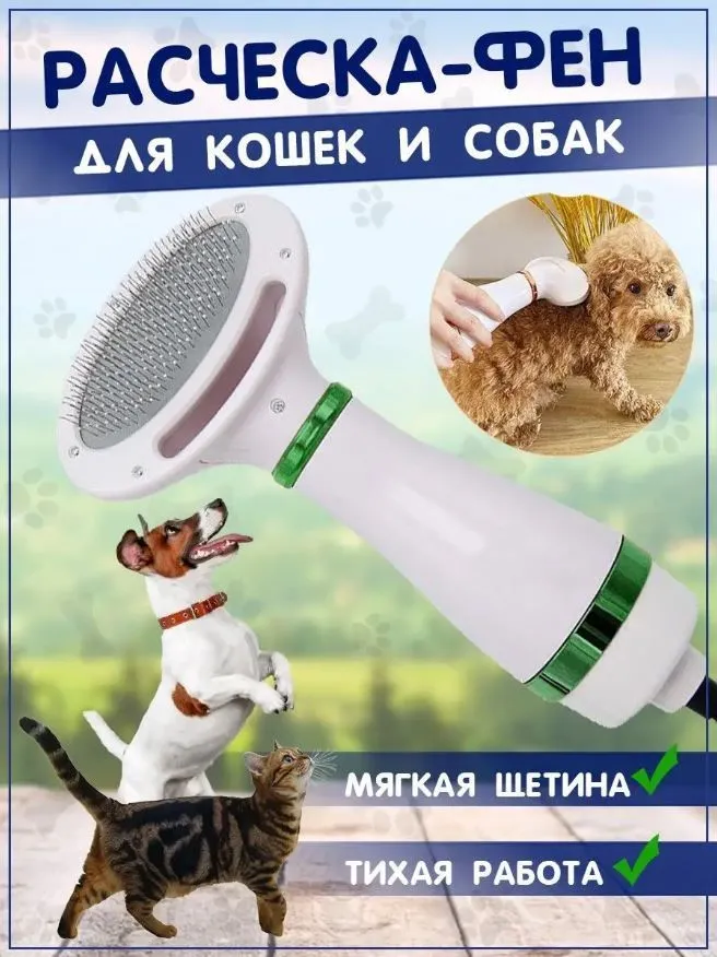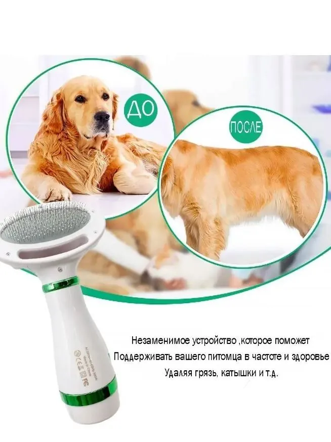 Щетка + фен 2в1 для животных PET GROOMING DRYER 2 в 1 - фен для домашних животных и фурминатор, предназначен для ухода за шерстью домашних животных, с помощью которого можно не только быстро высушить животное после купания, но и удалить излишний подшерсток. Щетка- фурминатор состоит из мягких булавок из нержавеющей стали с защитным загнутым кончиком, позволяющим глубоко дотянуться до подшерстка вашего питомца, не царапая кожу. Три энергосберегающих цикла нагрева обеспечивают высокую и слабую температуру, чтобы помочь вам быстро и максимально комфортно высушить своих пушистиков. Фен имеет низкий уровень шума - менее 60 д