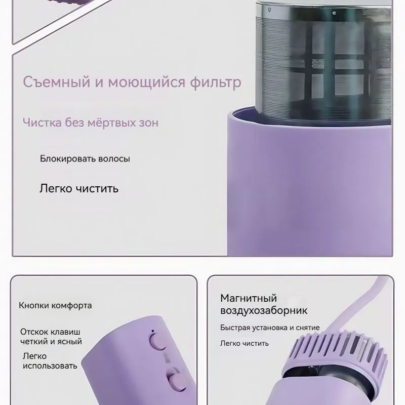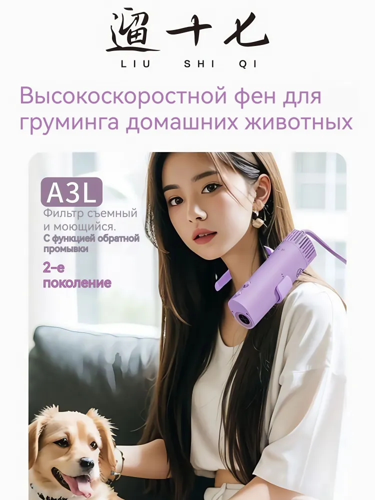Б обеспечивает комфортную сушку без стресса для чувствительного слуха питомцев.Удобство и Функции:8 Настроек: Легко регулируйте температуру воздуха и скорость потока под нужды вашего питомца.Обратный Обдув (Самоочистка): Уникальная функция "одна кнопка реверса" помогает автоматически очищать фильтр от шерсти во время работы, предотвращая засоры.Съемный Фильтр: Фильтр легко снимается и моется, обеспечивая долгий срок службы и постоянную мощность обдува.Магнитная Защитная Сетка: Быстро снимается для легкой очистки от шерсти и пыли.Эргономичные Кнопки: Удобные кнопки с четким срабатыванием.Ключевые Характеристики:Модель: LSQ-A3LЦвет: Фиолетовый