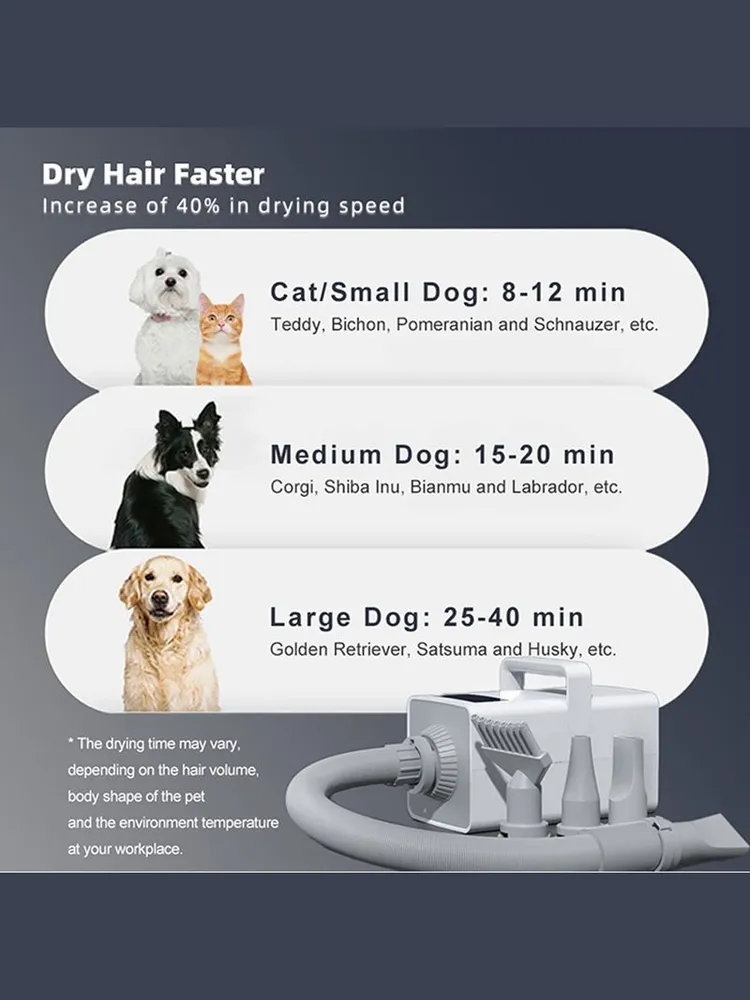 Комплектация:1 * Фен для домашних животных1 * Утолщенный воздуховод3 * Сменная выдувная головка