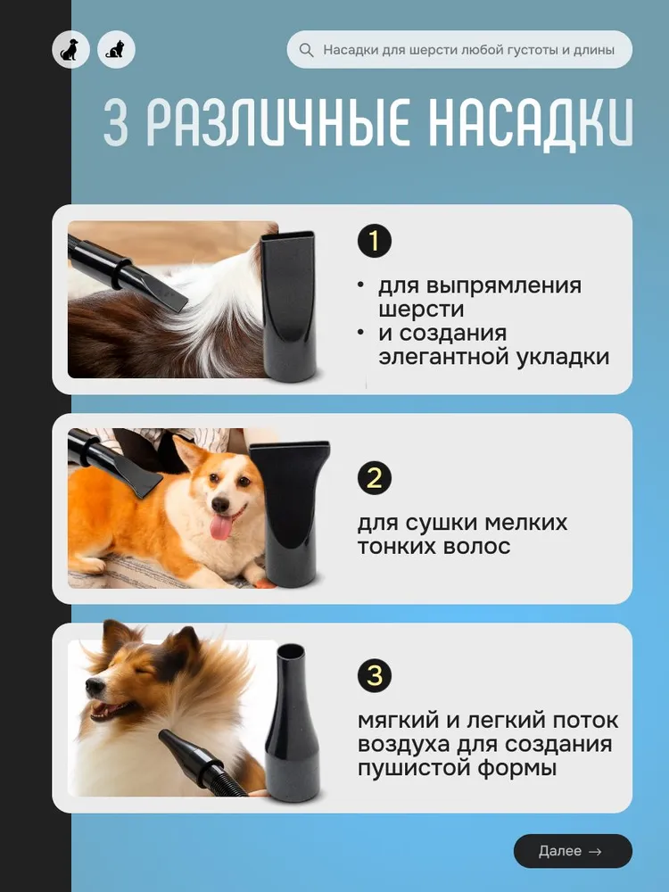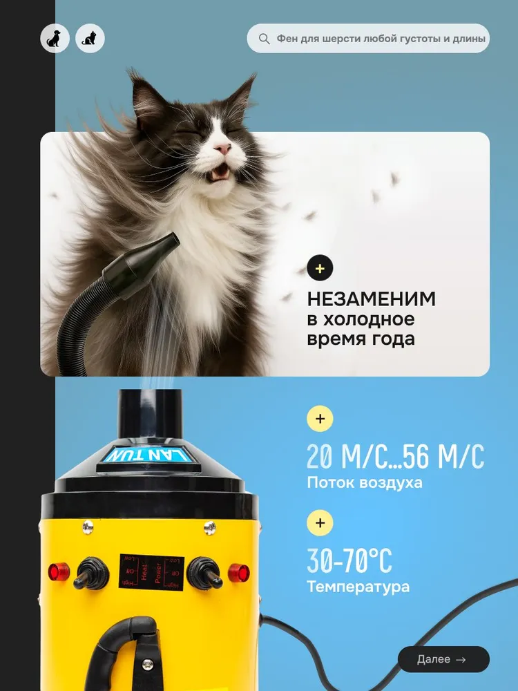 Фен компрессор для животных Lantun LT-1090 специально предназначен для сушки шерсти домашних животных после водных процедур. Он в равной степени эффективно подойдет для собак и кошек с шерстяным покровом любой густоты и длины. Турбосушка обладает номинальной мощностью 2400 Вт, что позволяет нагнетать сильный воздушный поток и расправлять сложившиеся комки шерсти, вычищать засохший песок, грязь.Турбо сушилка для кота абсолютно безопасна в применении, не причиняет болевых ощущений и не наносит повреждений коже животного. Профессиональный фен компрессор для сушки допускается использовать в бытовых условиях или закупать в салон по уходу за домашними питомцами. Большинство пользователей отмечают в изделии удобство эксплуатации, надежность и долговечность. Благодаря специальным интегрированным тумблерам пользователю предоставляется возможность регулировать температуру воздушных масс, выбирать оптимальный режим для шерсти кота с учетом его физиологических особенностей.Устройство оснащено плавной регулировкой воздушного потока. Скорость воздуха на выходе может быть в диапазоне 20-56 м/с. Несмотря на то, что домашний фен компрессор для груминга достаточной мощный, он не отличается высоким уровнем шума (всего 75 Дб).Допустимый температурный диапазон воздушных масс на выходе составляет от 30 до 70°С. Питание фена компрессора осуществляется, как от электросети переменного тока напряжением 220 В с частотой 50 Гц, так и автономно от аккумуляторных батарей.Корпус изделия выполнен из пластика высокой категории прочности с металлическими вставками. Данное гарантирует отсутствие трещин, вмятин, царапин в результате внешних механических воздействий или непреднамеренного падения. Устройство от линьки котов имеет компактные габаритные размеры (380*160*240 мм) и незначительную номинальную массу (5 кг), что облегчает транспортировку. По заверениям изготовителя, степень защиты, обеспечиваемая оболочкой, составляет IP67. Подобный факт позволяет не опасаться, что груминг, сушка и уход за животными пройдут без попадания под корпус прибора шерсти и других инородных веществ. Комплект поставки предусматривает непосредственно сам фен компрессора Lantun LT 1090 для дома, так и руководство по эксплуатации.Характеристики:Мощность: 2400 Вт.Поток воздуха: oт 20 м/с дo 56 м/с.Шум: 75 дб.Температура: 30-70°С.Корпус: пластик + металл.Габариты: 38х16х24 см.Цвет: желтый.Вес: 5 кг.