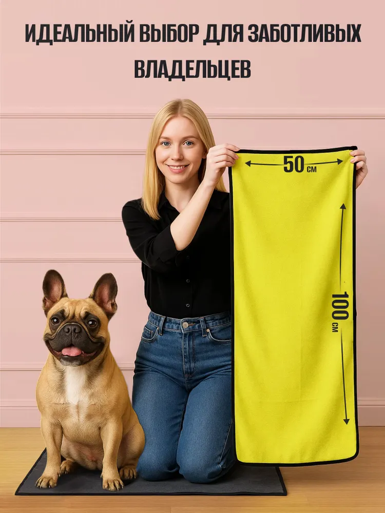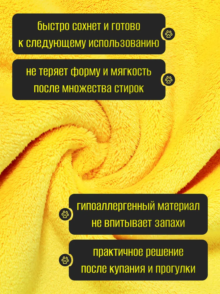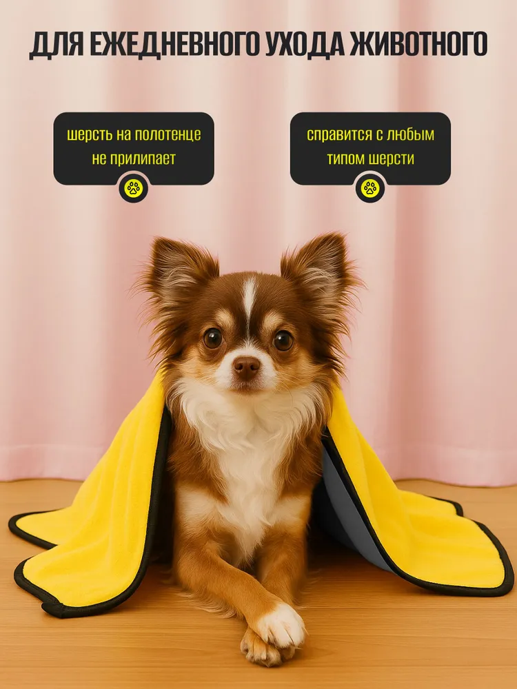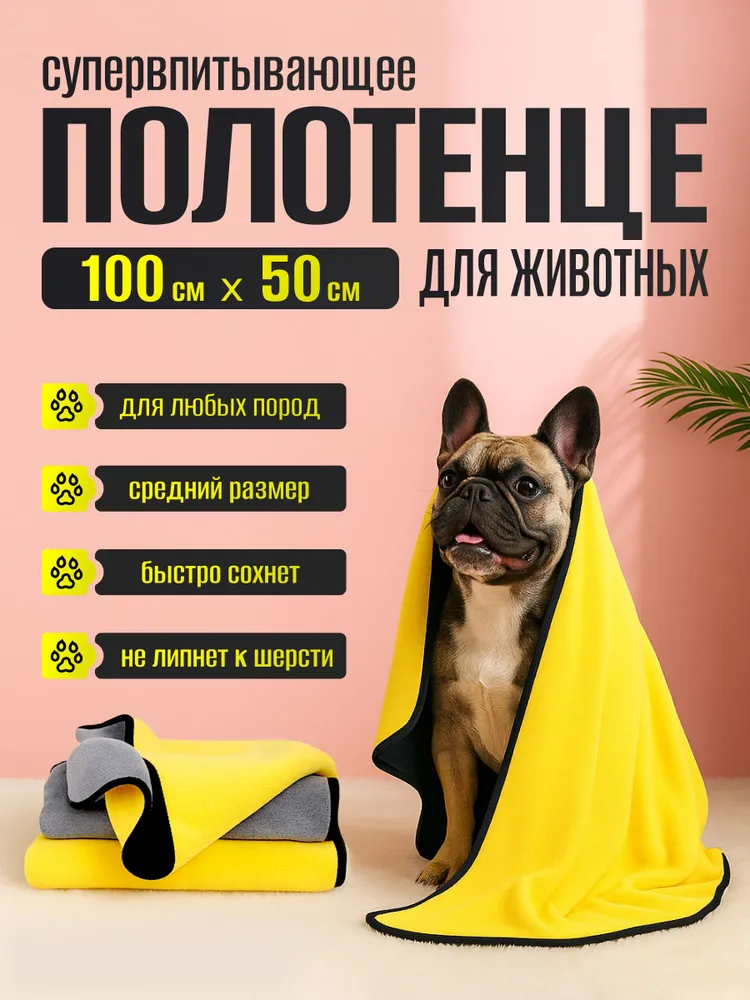 Устали от бесконечной сушки после купания или прогулки под дождем? Полотенце для собак и для кошек супервпитывающее из микрофибры размером 100 х 50 см — идеальное решение для быстрого и комфортного ухода за вашим питомцем!Полотенце для собак супервпитывающее изготовленное из ультрамягкой микрофибры повышенной плотности, оно сочетает в себе невероятную впитывающую способность и приятные тактильные ощущения.Преимущества:Мгновенное впитывание: уникальная технология микроволокна позволяет полотенцу впитывать до 560% влаги от собственного веса!Быстрая сушка: полотенце для животных эффективно удаляет влагу с шерсти.Универсальный размер: оптимальный размер 100 х 50 см идеально подходит как для маленьких, так и для крупных пород, обеспечивая максимальный комфорт и покрытие. Плотность - 400 г/м2.Чистота без усилий:Полотенце для мытья собак легко удаляет грязь и пыль с шерсти, поддерживая гигиену вашего питомца.Полотенце для мытья лап предотвращает беспорядок: питомец больше не будет разбрызгивать воду вокруг себя!Уход полотенца для собак супервпитывающее :Не рекомендуется использовать кондиционер для белья, чтобы сохранить превосходные впитывающие свойства.