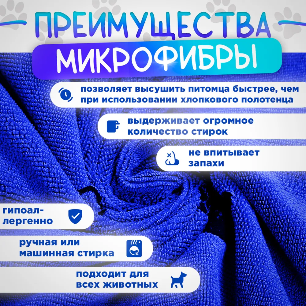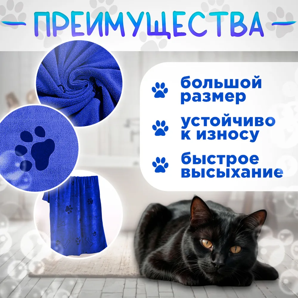 Преобразите уход за своим питомцем с супервпитывающим полотенцем из микрофибры, специально созданным для собак и кошек. Этот уникальный аксессуар поможет быстро и эффективно высушить шерсть после купания, прогулки под дождем или водных забав.Изготовленное из высококачественной микрофибры, полотенце обладает невероятной впитывающей способностью, что делает его идеальным решением для домашних любимцев.Полотенце прекрасно справляется с влагой, впитывая ее в несколько раз лучше, чем обычные ткани.Это позволит вам значительно ускорить процесс сушки вашего питомца, сохранив его комфорт и здоровье.Благодаря своему большому размеру, оно идеально подходит как для небольших, так и для крупных собак, обеспечивая полное покрытие даже в самых труднодоступных местах.Легкость и компактность изделия делают его удобным для хранения и транспортировки. Вы сможете взять полотенце с собой в поездки, на природу или в ветеринарную клинику, что обеспечит быструю помощь вашему любимцу в непредвиденных ситуациях.Микрофибра легко стирается, что позволяет поддерживать изделие в идеальном состоянии и продлевает срок его службы.Кроме того, полотенце отлично подходит для высушивания лап собак и кошек, что особенно актуально после прогулок в дождливую погоду или по глубокому снегу. Не дайте вашему питомцу замёрзнуть или стать грязным после активных игр на улице — используйте это практичное и стильное полотенце.Обеспечьте своему любимцу комфортный уход с помощью высококачественного супервпитывающего полотенца из микрофибры, которое идеально подходит для собак и кошек.Надежный помощник в уходе за животными, который облегчит вашу жизнь и сделает заботу о питомце ещё более приятной и эффективной.Размеры полотенца: 100х60 см.