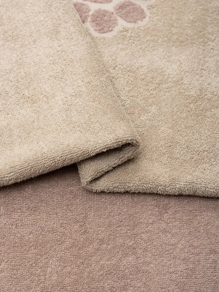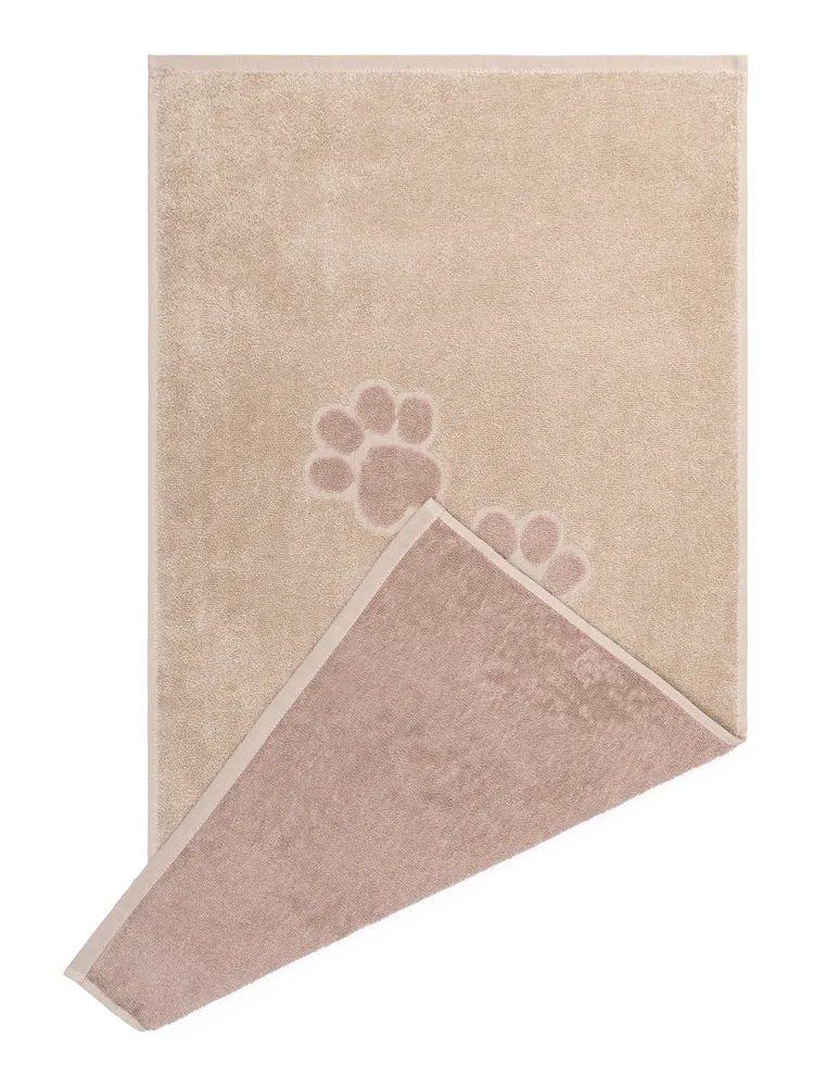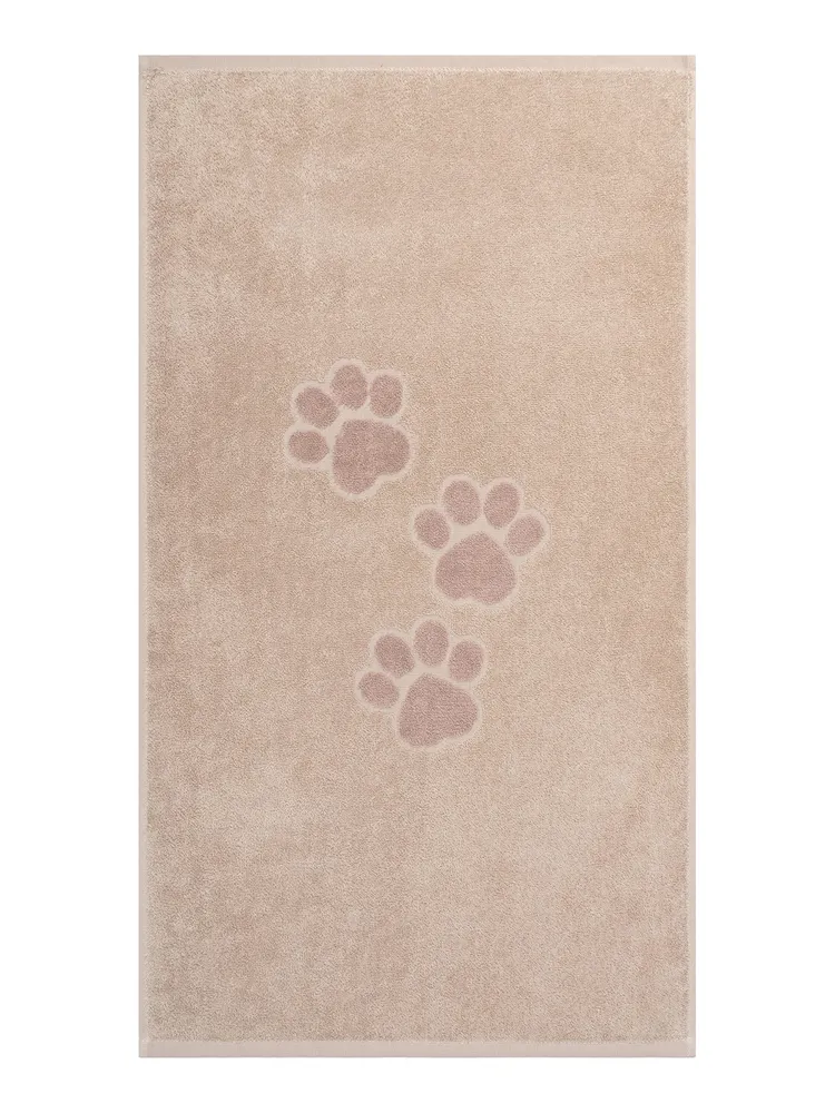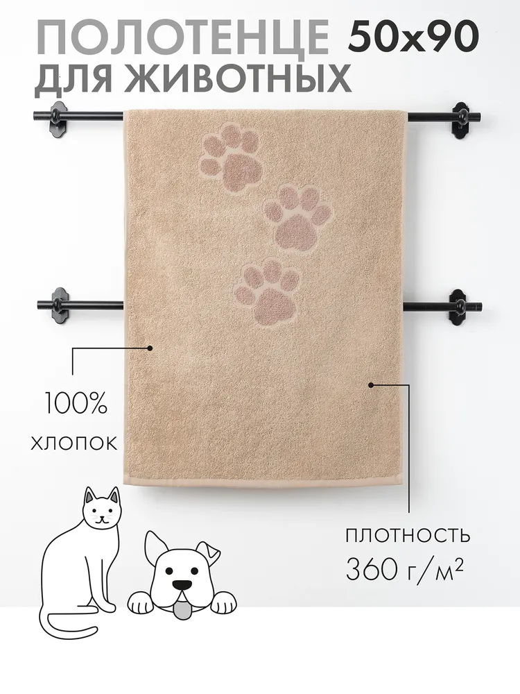 Махровое полотенце для животных из 100%-ного хлопка марки "Твоя эмоция" - то что нужно после активной прогулки вашего питомца! Изделие размером 50х90 см подойдет для ухода за собаками мелких (мопс, шпиц) и средних (корги, такса) пород. Оно легко удаляет грязь, а также благодаря оптимальной плотности 360 г/м2 моментально впитывает влагу с пушистой, тонкой, гладкой, жесткой шерсти и быстро сохнет.\nПолотенце российского производства от компании «ОНЛАЙН ТЕКС» выполнено в немарких бежевых оттенках с рельефным рисунком лапок. В отличие от аналогичных изделий хлопковое полотенце для собак Paws будет эстетично смотреться даже в дорогих интерьерах ванных комнат. Отсутствие посторонних запахов у ткани, мягкая и нежная фактура не доставят питомцам дискомфорта. Кроме сушки шерсти после мытья, полотенце для собак справится с функцией уютного покрывала, домашнего коврика или подстилки для переноски. Также компактное и легкое изделие удобно брать на прогулку, хранить для пса в машине или пользоваться им в качестве лежанки в автомобильном путешествии. Этот зоотовар из махровой ткани – незаменимый помощник после груминга. Специалисты оценят по достоинству: отлично впитывающее полотенце из натурального хлопка не электризуется, легко отстирывается, не теряет насыщенность цвета и внешний вид даже после многократного применения. Изделие можно использовать и для других домашних любимцев: кошек, которые купаются с удовольствием, например, мейн-кунов, кроликов, шиншилл, морских свинок и других. Подарите любовь и заботу милым питомцам вместе с качественными махровыми полотенцами!