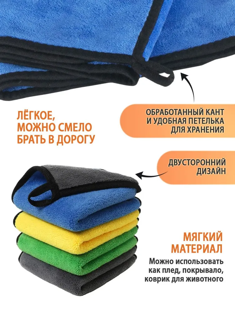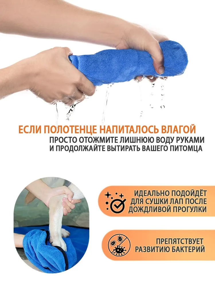 Полотенце из микрофибры идеально для ухода за любимыми питомцами. Легкое, компактное, впитывает влагу в 7 раз больше собственного веса. Подходит для животных с густой, длинной шерстью. Не маркие, в них не задерживается грязь и не остаётся пятен. Гиппоаллергенный материал, используются стойкие и не токсичные красители. Износостойкое, не теряет цвет и форму после многочисленных стирок. Отлично удаляет грязь. Благодаря наночастицам серебра в полотенце не задерживаются и не размножаются бактерии и запахи. Полотенце идеально для шерсти животных, придает блеск и мягкость. Сохнет быстрее обычных полотенец в 3-4 раза. Подходит для вытирания лапок, живота после прогулки. Плотность 500 г/м2. Обработано по периметру бейкой. Для удобства оснащено петелькой. Очень мягкая и комфортная текстура. Может использоваться в качестве подстилки или одеяла. Используйте супер впитывающее полотенце везде - в автомобиле, дома, на природе, в поездках. Гарантия 30 дней.