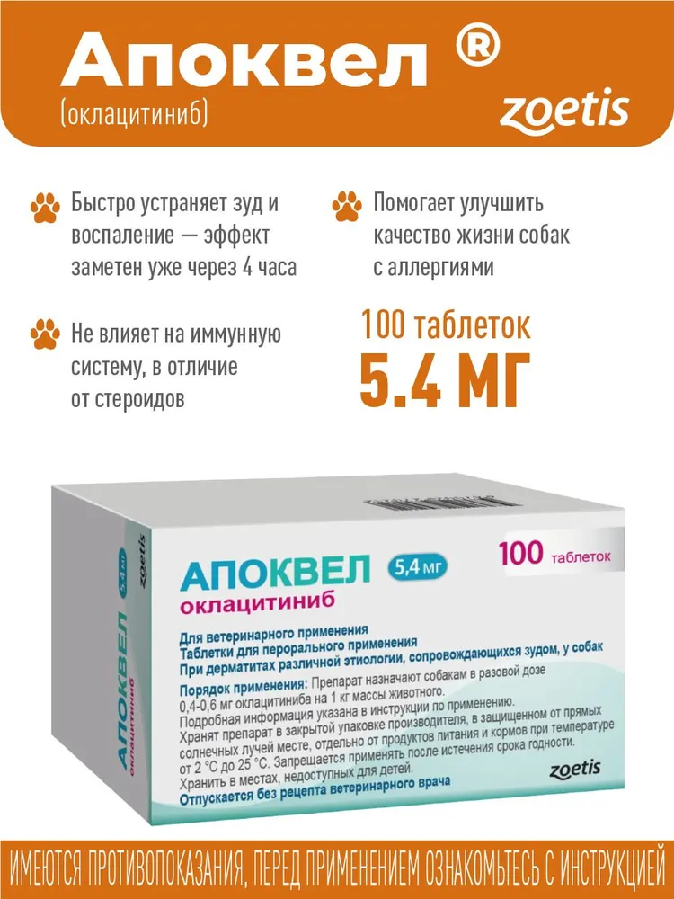 Апоквел — это препарат в таблетках для собак, предназначенный для контроля симптомов зуда и воспаления кожи при дерматите, ассоциированном с аллергией (контактной, пищевой, паразитарной), а также для лечения и профилактики рецидивов атопического дерматита.Показания:Дерматит, ассоциированный с аллергией (контактный, пищевой, паразитарный)Устранение зуда и уменьшение очаговых изменений кожи