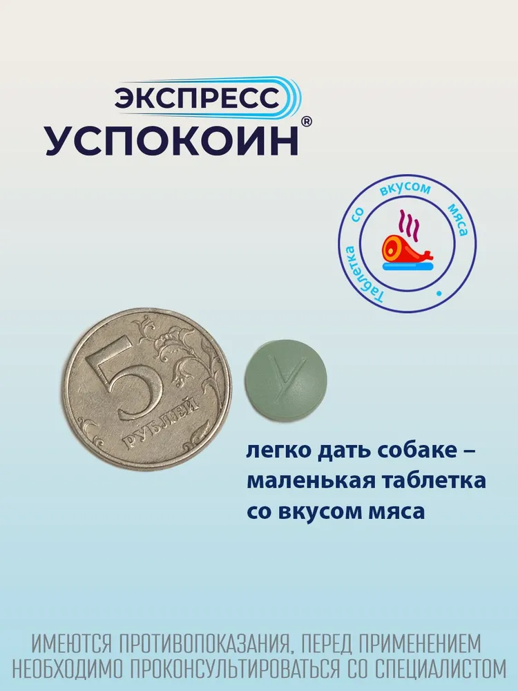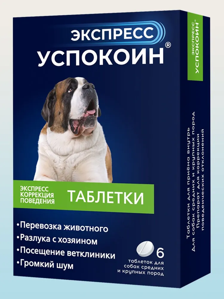ИМЕЮТСЯ ПРОТИВОПОКАЗАНИЯ. ПЕРЕД ПРИМЕНЕНИЕМ НЕОБХОДИМО ПРОКОНСУЛЬТИРОВАТЬСЯ СО СПЕЦИАЛИСТОМ.\n \nЭкспресс Успокоин – это успокоительное для кошек и собак в виде таблеток с мясным вкусом. \nУспокоительное средство Экспресс Успокоин помогает подавлять страх и беспокойство у домашних животных и снимает чувство тревоги. Также он борется с излишним слюноотделением, вокализацией (лаем и мяуканьем), деструктивным поведением и агрессией со стороны животных.\nУспокоительное Экспресс Успокоин начинает действовать через 30 минут после приема, а эффект от препарата сохраняется в течение 6-8 часов. \n\nСфера применения успокоительных таблеток Экспресс Успокоин.\nЭкспресс Успокоин – это успокоительное, которое используют для решения основных поведенческих проблем у кошек и собак:\n– при транспортировке домашних животных в машине, поезде, самолёте;\n– для нейтрализации последствий шума и громких звуков (гроза, салют, взрывы петард, ремонт, шум пылесоса);\n– при посещении ветеринарного врача (уколы, вакцинация, медицинские процедуры итд)\n– при посещении грумера(стрижка шерсти, стрижка когтей, обработка, вычесывание итд);\n– при расставании с хозяином;\n– в случае оставления питомца на передержке;\n– при появлении нового члена семьи.\n\nКак применять Экспресс Успокоин\nТаблетки от стресса дают животным в пасть однократно, на корень языка за 1 час до еды или через 2-4 часа после кормления.\nДля коррекции поведения питомца перед тревожным событием необходимо дать Экспресс Успокоин за 1-2 часа до мероприятия.\nДействие успокоительного для кошек и собак наступает уже в течение 30-40 минут после приема и достигает полного эффекта через 60 минут\n\nКомплектация\n6 шт\n\nСостав\nОсновное действующее вещество успокоительного средства – сукцинат тразодона, это оригинальная запатентованная разработка производителя. Дозировка\nРазовые дозы препарата Экспресс Успокоин таблетки для собак:\nМасса собаки 9,1 – 12,0 кг – ½ таблетки\nМасса собаки 12,1 – 21,0 кг – 1 таблетка\nМасса собаки 21,1 – 30,0 кг - 1 ½ таблетки\nМасса собаки 30,1 – 40,0 кг - 2 таблетки\nМасса собаки свыше 40,0 кг – 2 + ½ таблетки на каждые 10 кг массы тела кошки\n\nСостав Экспресс Успокоин таблетки для собак (масса таблетки 515 мг) – 120 мг сукцината тразодона на таблетку.\n\nПротивопоказания\nПротивопоказанием для применения являются: повышенная индивидуальная чувствительность животного к компонентам препарата, в том числе в анамнезе, заболевания сердечно-сосудистой системы и эпилепсия. Клинических исследований у животных с нарушениями функции печени и почек не проводилось. Не следует применять препарат самкам в период беременности и вскармливания приплода, а также новорождённым.