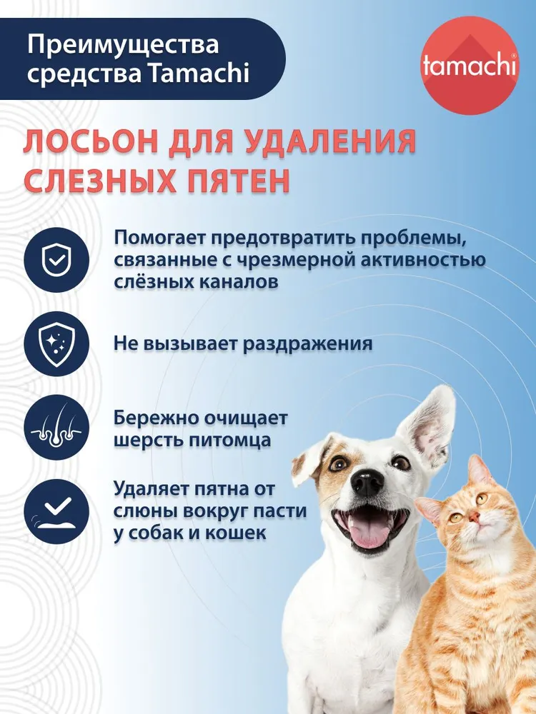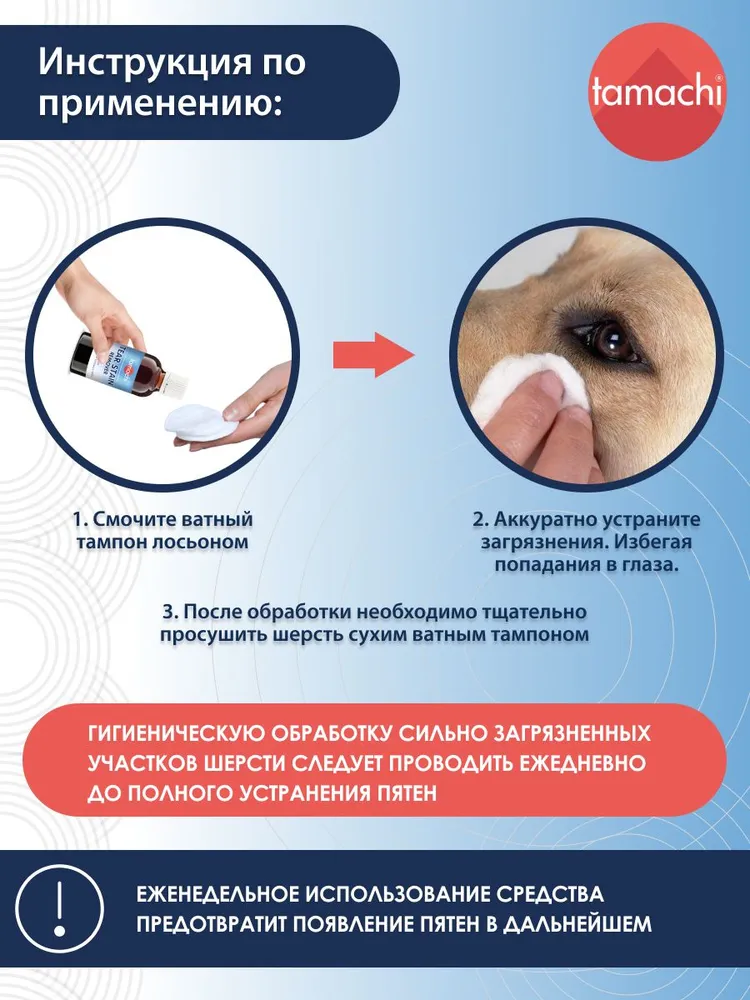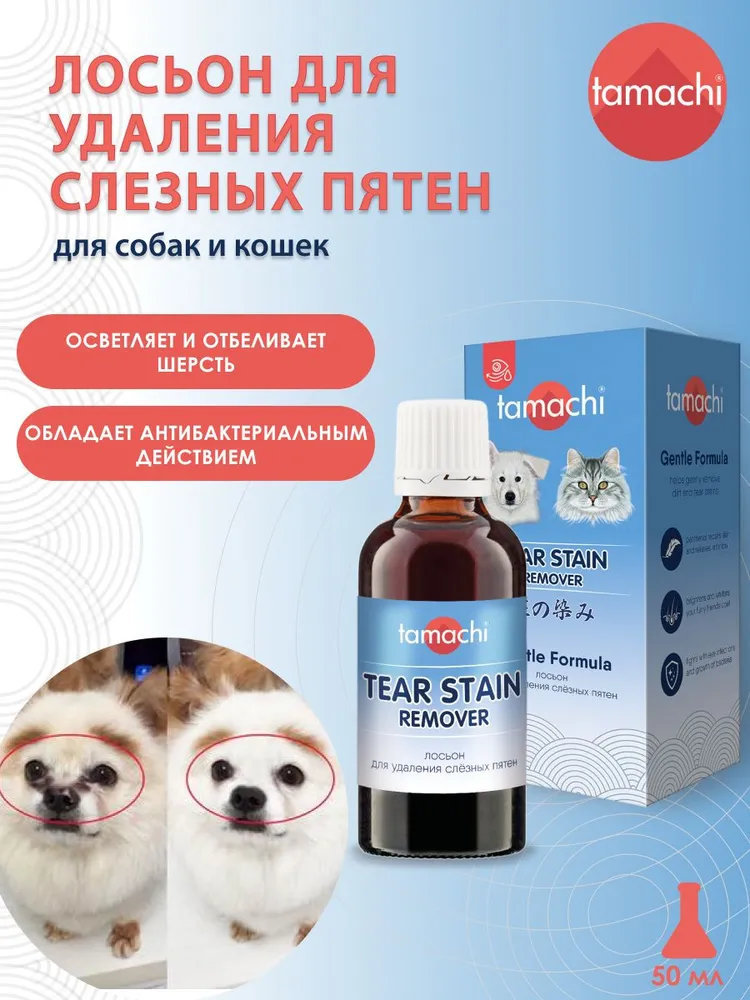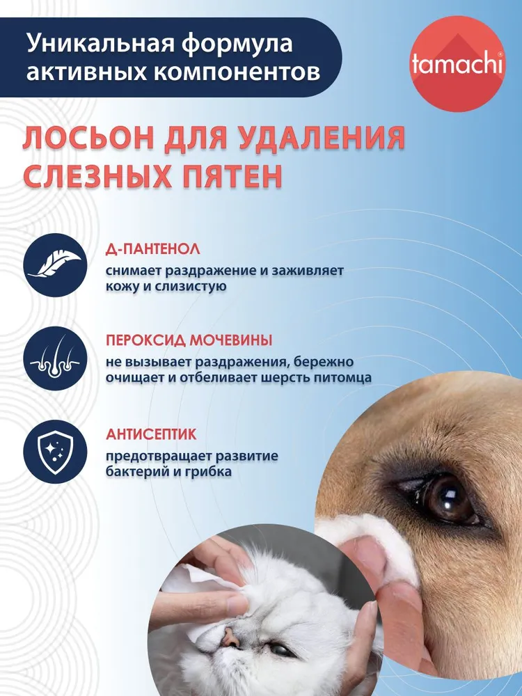 Тамачи Лосьон капли для глаз для удаления слёзных пятен помогает предотвратить проблемы, связанные с чрезмерной активностью слёзных каналов. Не вызывает раздражения и бережно очищает шерсть питомца. Уникальная формула активных компонентов: бензалкония хлорид обладает высокой антисептической способностью, пероксид мочевины отбеливает шерсть, Д-пантенол снимает раздражение и заживляет кожу и слизистую. Состав: Вода питьевая, ПЭГ — 400, борная кислота, пероксид мочевины, натрий хлорид, Д-пантенол, трилон Б, бензалкония хлорид 50%. Способ применения: Применяют собакам и кошкам для удаления пятен от слёз под глазами. Обработку проводят ватным тампоном, смоченным лосьоном, аккуратно устраняя выделения и избегая попадания в глаза. После обработки необходимо тщательно просушить шерсть сухим ватным тампоном. Гигиеническую обработку сильно загрязненных участков шерсти следует проводить ежедневно до полного устранения пятен. Еженедельное использование средства предотвратит появление пятен в дальнейшем. Средство подходит для удаления пятен от слюны вокруг пасти у собак и кошек. У чувствительных животных в очень редких случаях возможны аллергические реакции. В этих случаях применение лосьона прекращают. Условия хранения: Хранят средство в закрытой упаковке производителя, в защищённом от прямых солнечных лучей месте, отдельно от продуктов питания и кормов при температуре от 2 °C до 25 °C. Хранить в недоступном для детей и животных месте. Срок годности 2 года.