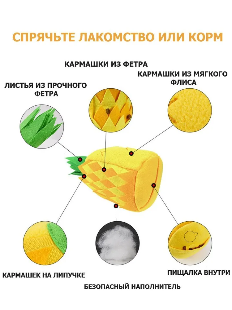 Нюхательная игрушка-головоломка для дома.Мягкая тканевая игрушка для собак из плотного флиса и фетра.Относятся к развивающим игрушкам и одному из способов обогащения среды для питомца - внутрь спрячьте лакомство или корм, собака должна их найти при помощи нюха.Подготовка в интеллектуальной игре займет пару минут вашего времени, а вот питомец еще долго будет возиться с заданием и не станет пробовать на вкус новые ботинки, пока вы готовите ужин.Игрушка для собак с пищалкой.