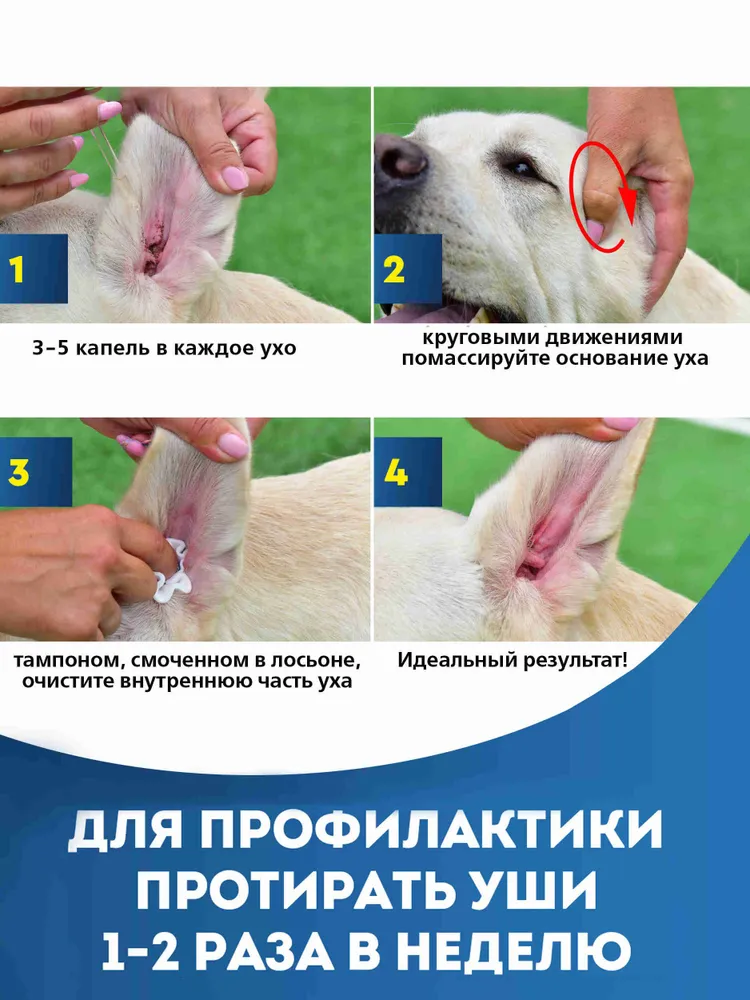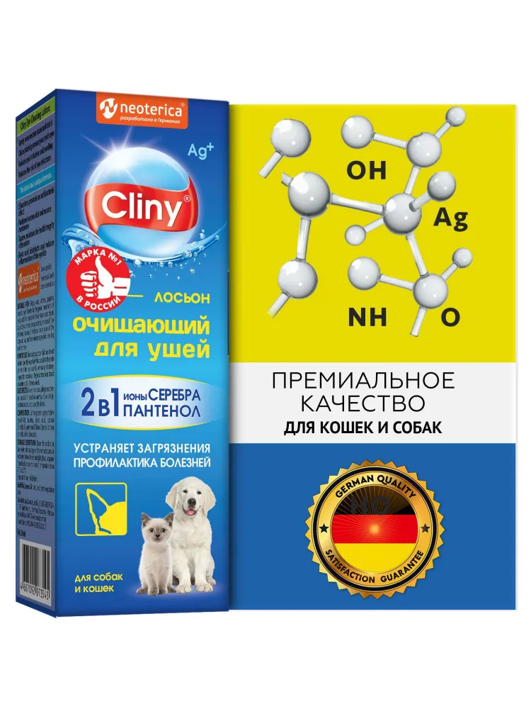 Кажется, что наши питомцы справляются сами с уходом за ушами. Однако домашняя пыль, загрязнённый городской воздух и низкая влажность в квартирах плохо влияют на уши. Частички пыли оседают на ушной раковине, провоцируют образование густой ушной серы — питомцу сложнее ухаживать за собой, ушная сера скапливается, может возникать раздражение. Даже здоровые уши нуждаются в дополнительном уходе. А если у вашего питомца наблюдается активное выделение ушной серы — гигиенические обработки глаз должны быть регулярными.\nДля ухода за ушами питомца используйте лосьон для ушей Cliny.\nCliny — это первая серия по уходу за животными с ионами серебра. Ионы серебра обладают мощным бактерицидным действием широкого спектра, не вызывают аллергии. Cliny — и гигиена, и профилактика болезней. \nЛосьон для ушей Cliny подходит для регулярного ухода за ушами питомца и легко удаляет даже засохшие корочки. Большой флакон и стеклянная пипетка делают его экономичным и удобным в использовании. Лосьон имеет приятный запах и не оставляет масляных пятен.\n\nЛосьон для ушей Cliny:\n✔ Бережно устраняет загрязнения и выделения\n✔ Снимает зуд и раздражение\n✔ Профилактирует болезни ушей\n✔Смягчает кожу ушного прохода\n✔ Снижает риск инфекционных заболеваний\n✔ Не оставляет масляных пятен\n\nИспользуйте лосьон для ушей Cliny:\n✔ Кошкам и собакам\n✔ Кроликам и хорькам\n✔ 1–2 раза в неделю для гигиены\n\nАктивные компоненты:\n● Ионы серебра обладают бактерицидной активностью\n● Яблочная кислота обладает противоспалительным и противоотёчным действием\n● Бензаклония хлорид проявляет антисептическое, противогрибковое действие\n● Пантенол заживляет и смягчает кожу\n● Экстракты алое вера и ромашки обладают противовоспалительным, увлажняющим, успокаивающим и регенерирующим действием\n\nПорядок применения:\nЗакапайте 3–5 капель лосьона в ухо животному и круговыми движениями помассируйте основание ушной раковины. Затем ватным тампоном, смоченным в лосьоне, протрите внутреннюю поверхность ушной раковины и наружный слуховой проход. \n\nСостав разработан компанией Neoterica (Германия).