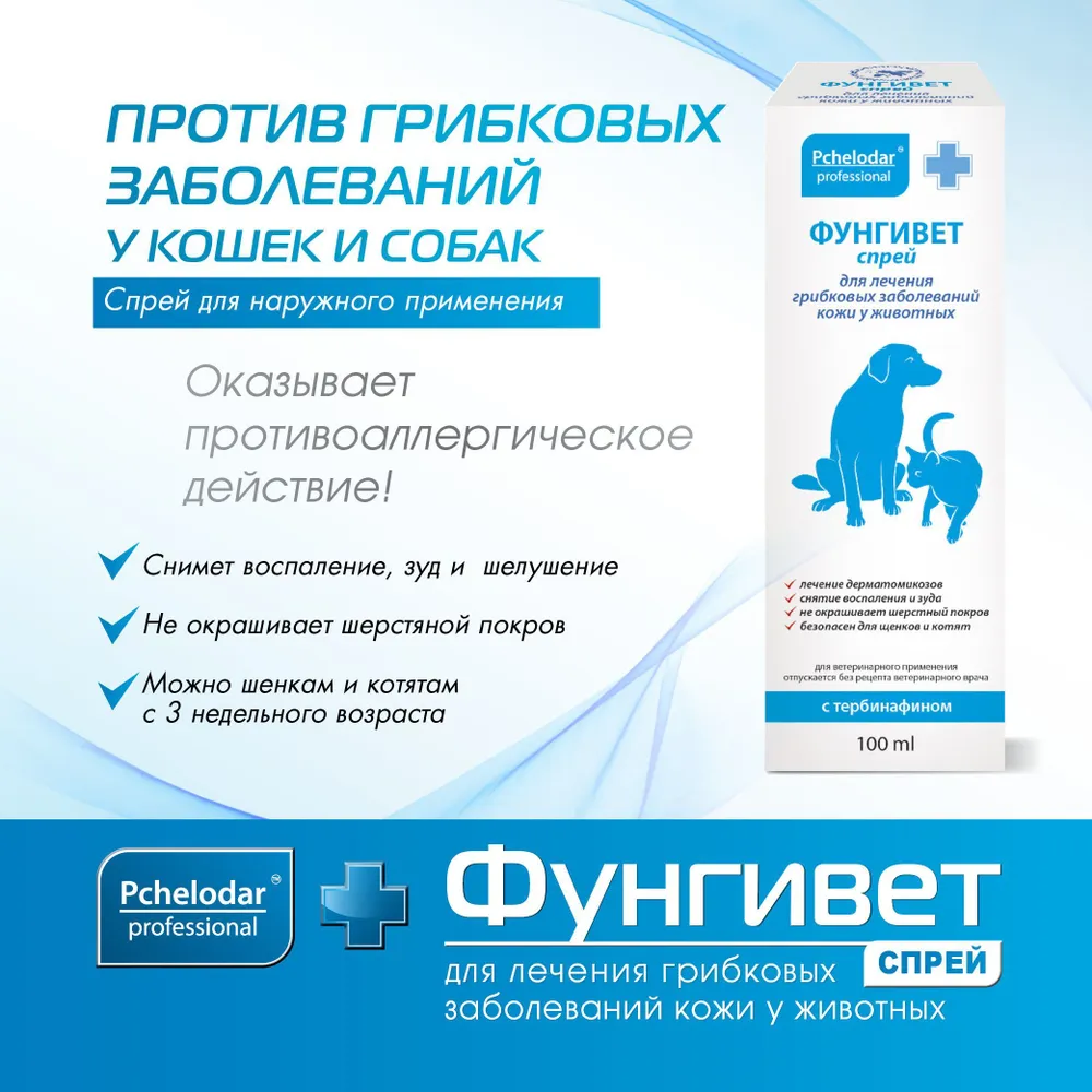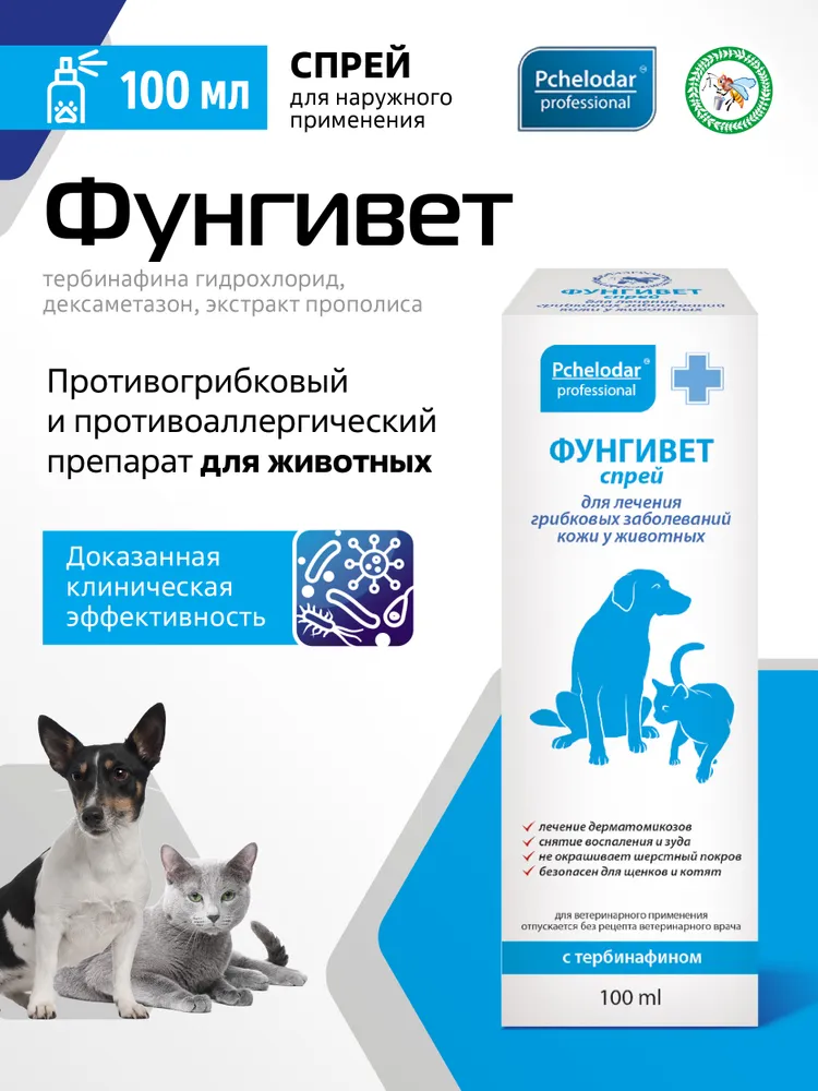 Фунгивет - это уникальное средство от грибка для животных, представленное в форме спрея. Разработанное компанией Пчелодар, оно обеспечивает надежную защиту от грибковых инфекций у вашего питомца.Средство Фунгивет содержит целебные компоненты, которые позволяют эффективно бороться с грибковыми заболеваниями у животных. Благодаря своей уникальной формуле, спрей легко наносится на пораженные участки кожи, обеспечивая быстрое и эффективное воздействие.Благодаря использованию средства Фунгивет от Пчелодар, ваш питомец избавится от зуда, раздражения и других неприятных симптомов, вызванных грибковыми инфекциями. Спрей обладает приятным запахом и не вызывает дискомфорта у животного.Не откладывайте заботу о здоровье вашего питомца на потом. При первых признаках грибковой инфекции обратитесь к ветеринару и примените средство Фунгивет от Пчелодар. Обеспечьте своему любимцу надежную защиту и заботу, используя только качественные продукты от проверенных производителей.Сделайте правильный выбор в пользу здоровья и комфорта вашего питомца - выберите средство Фунгивет от Пчелодар. Вашему животному будет комфортно и безопасно, а вы сможете наслаждаться его здоровым и счастливым поведением. Не жертвуйте качеством - выбирайте лучшее для своего питомца!Гель с противогрибковым и обезболивающим действием