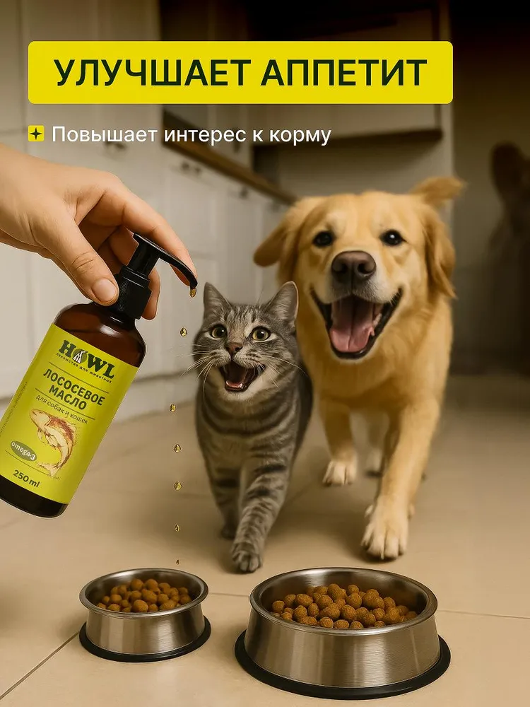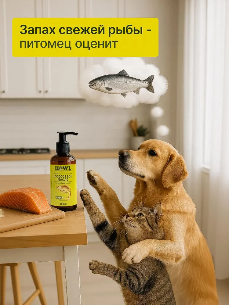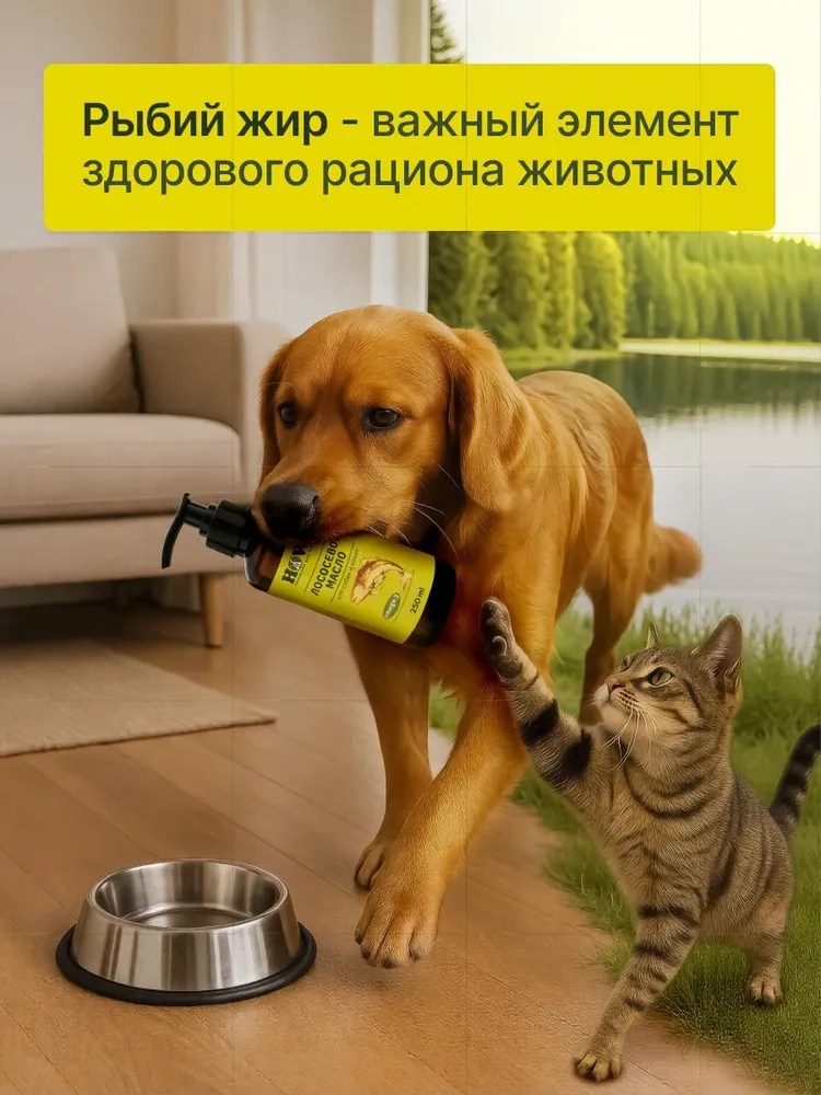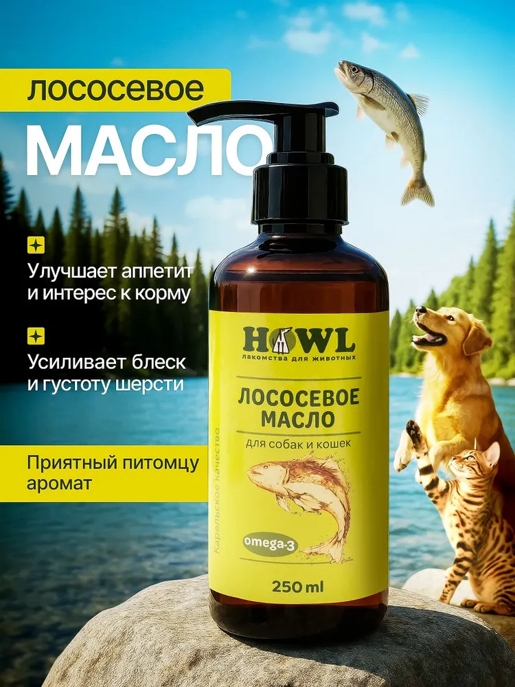 Пищевая добавка для самых разных животных всех пород и возрастов, особенно ценное для щенков и для котят.Лососевое масло для собак это всем известный рыбий жир для животных, содержащий Омега 3 6 9. Уровень Омеги в нашем масле лосося 27%! Оно отличается высокой чистотой и качеством.Применяют масло лосося в жидком виде, его насыщенный вкус и аромат повышает привлекательность корма и стимулирует аппетит даже у избалованных в еде животных. Масло из лосося может употребляться животным, как в чистом виде, так и в виде натуральной добавки в любимый корм для собак и кошек, а также добавляться в сухой, влажный или жидкий корм или паштет. Также можно нанести несколько капель масла на лакомства для собак или вкусняшки для котов и собак.Лососевое масло для кошек - настоящая ветаптека для животных. Для здоровой кожи, для блестящей шерсти, дополнительно к повседневному корму. Содержащиеся в нём Omega 3-6-9 замедляют процесс распада коллагена и способствуют восстановлению хрящевой и соединительной ткани. Жирные кислоты омега 3-6-9 и витамины, содержащиеся в масле, участвуют во многих биохимических процессах организма. Но чаще всего ветеринары назначают его как мультивитамин и средство для устранения проблем с шерстью у животного. После курса масла значительно улучшается качество шерсти, зарастают лысины, исчезает зуд, шерсть становится мягкой и блестящей. Употребление масла в период смены волосяного покрова (линьки) способствует более быстрому восстановлению состояния и усилению цвета шерсти. Это также отличные витамины для котов от линьки.В отличие от обычного рыбного жира, масло лосося содержит мощный антиоксидант – астаксантин (в природе встречается только в водорослях, которыми питается лосось). Рыбий жир для собак рекомендовано давать перед случкой, для беременных кошек и для беременных собак, а также кормящим животным.Масло лососевое для собак можно давать в период активного роста и развития начиная уже с трёхмесячного возраста, это настоящие витамины для котят, витамины для щенков, ведь все малыши нуждаются в полноценном питании. Это отличные витамины для собак мелких пород, витамины для кошек, витамины для крыс, а также других ваших любимых грызунов, для попугаев и сельскохозяйственных домашних животных.Для наилучшего результата добавляйте лососевое масло в рацион питомца не меньше месяца в соответствии с возрастом, весом и состоянием животного. Лососевый жир для собак и прочих животных - прекрасный выбор для хозяев, заботящихся о своих питомцах. Не содержит добавок и консервантов.Произведено в России из местной рыбы, это натуральный российский продукт.
