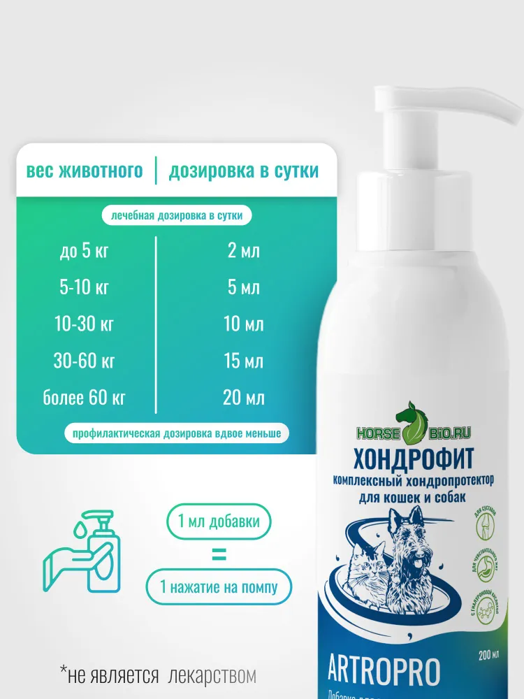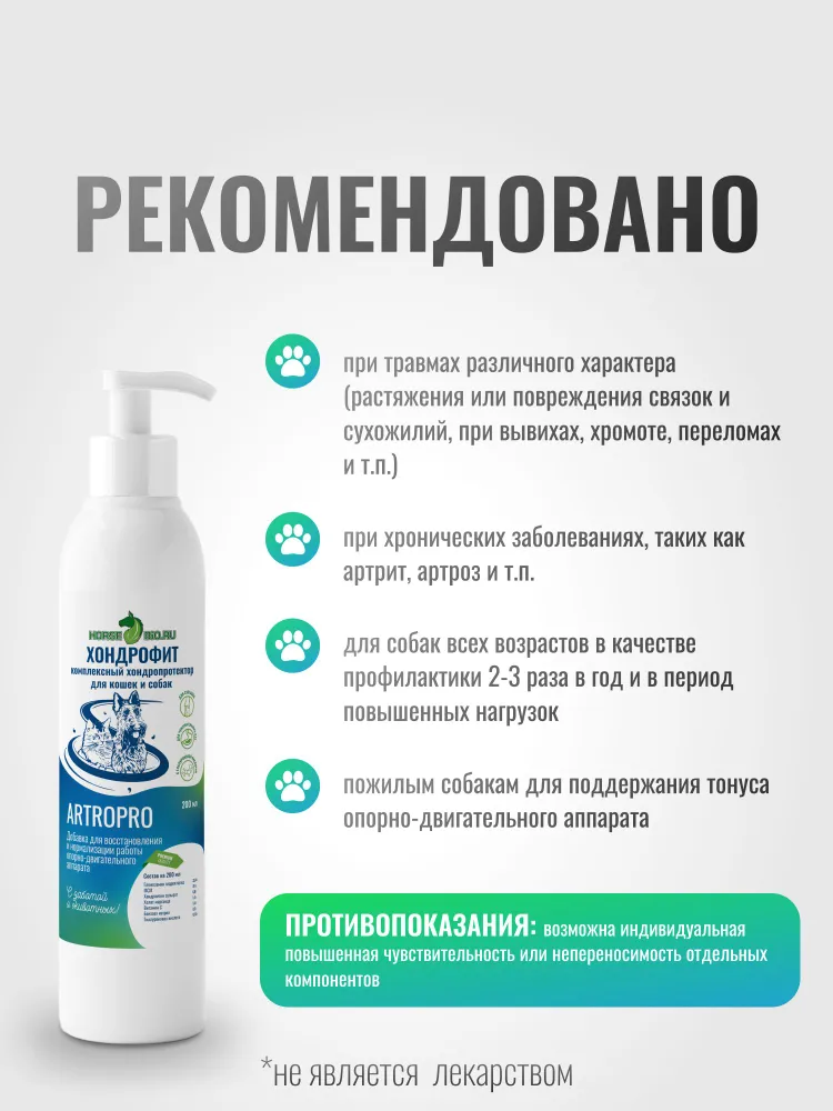 Интенсивно восстанавливает связки и хрящи при хронических заболеваниях или травмах опорно-двигательного аппарата, поддерживает организм собаки во время интенсивных физических нагрузок.Ингибирует ферменты, нарушающие структуру и функции суставного хряща, останавливает процессы дегенерации и придает эластичность хрящевой ткани, способствует регенерации хрящевых поверхностей и суставной сумки.Нормализует продукцию внутрисуставной жидкости, увеличивает подвижность и уменьшает болезненность суставов, снимает боли в состоянии покоя и при движении.Дозировка и способ применения