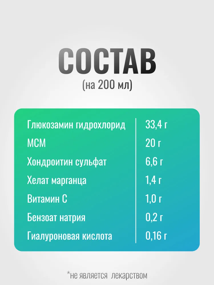 Состав на 200 мл:Глюкозамин гидрохлорид - 33,4 г