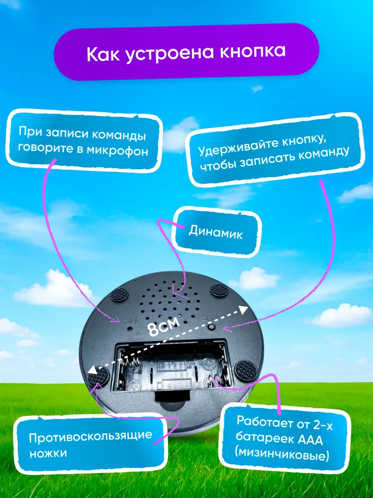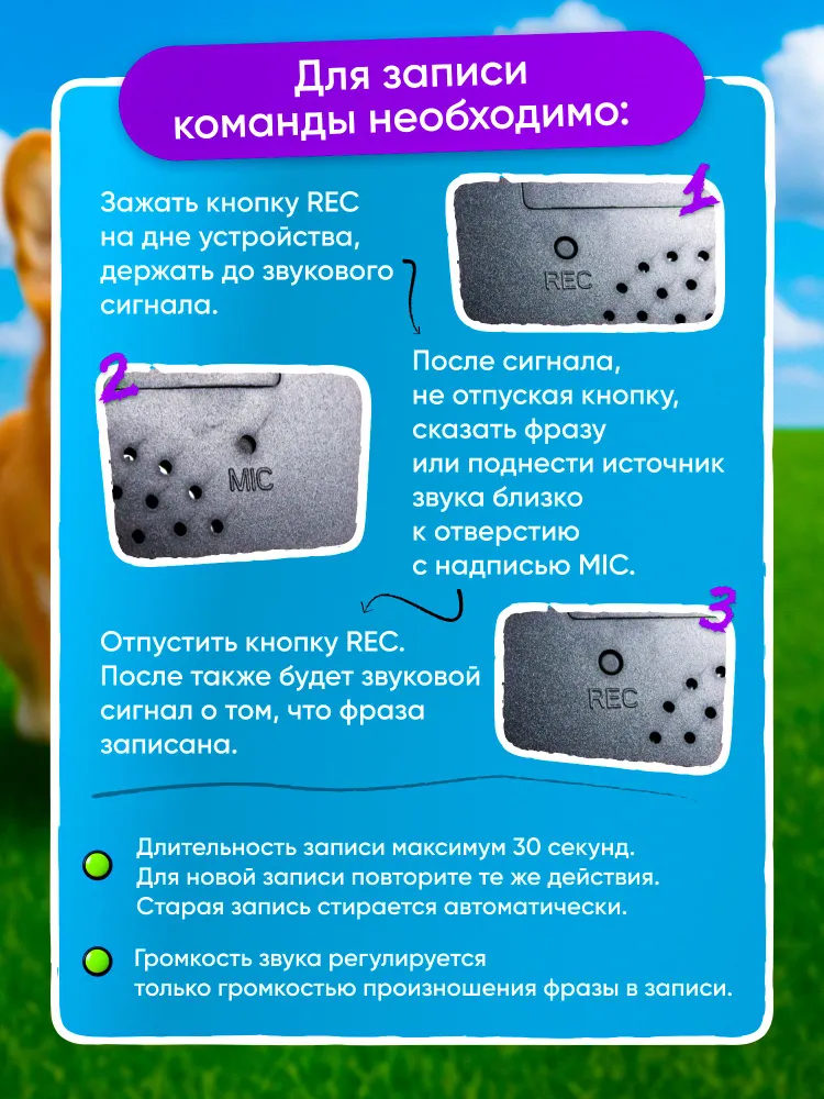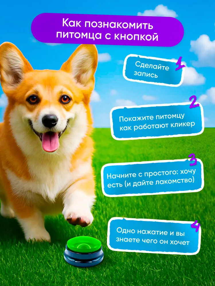 Вашему верному четвероногому другу нужен способ легко и весело взаимодействовать с вами? Представляем вам нашу инновационную игрушку для собак с голосовой кнопкой! Эта умная игрушка не только обеспечит вашего питомца часами радости, но и станет незаменимым помощником в процессе дрессировки и общения.Особенности:Голосовая Запись и Воспроизведение: С легкостью записывайте свои команды, веселые фразы или даже просто слова поддержки на специальную кнопку. Когда ваш питомец нажмет на нее, услышит ваш голос!Дрессировка и Обучение: Помогайте своему питомцу осваивать команды, устанавливая связь между звуками и действиями. Умная игра, которая развивает и обучает!Ключевые Фразы для Общения: Разместите игрушку рядом с миской и записывайте фразы вроде "Хочу кушать" или "Гулять!". Теперь ваш питомец может выразить свои потребности, нажимая на кнопку.Многоцелевое Использование: Отлично подходит для тренировок, обучения новым командам, а также для удовольствия и общения с вашим питомцем.Преимущества:Уникальное Взаимодействие: Создайте уникальный и веселый способ взаимодействия с вашим питомцем, укрепляя связь между вами.Качественные Материалы: Игрушка изготовлена из безопасных материалов, чтобы гарантировать долговечность и безопасность для вашего пушистого друга.Не упустите шанс сделать обучение и общение с вашим питомцем еще более увлекательными с "Голосовой Кнопкой" – вашим идеальным спутником в мире веселья и взаимопонимания!Инструкция