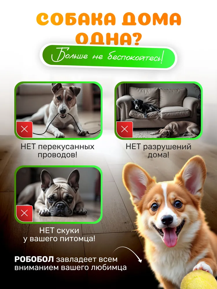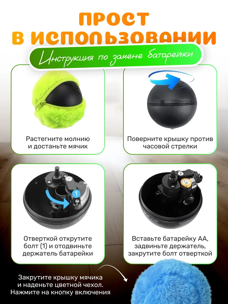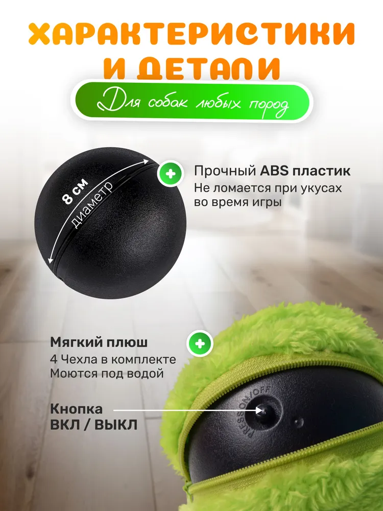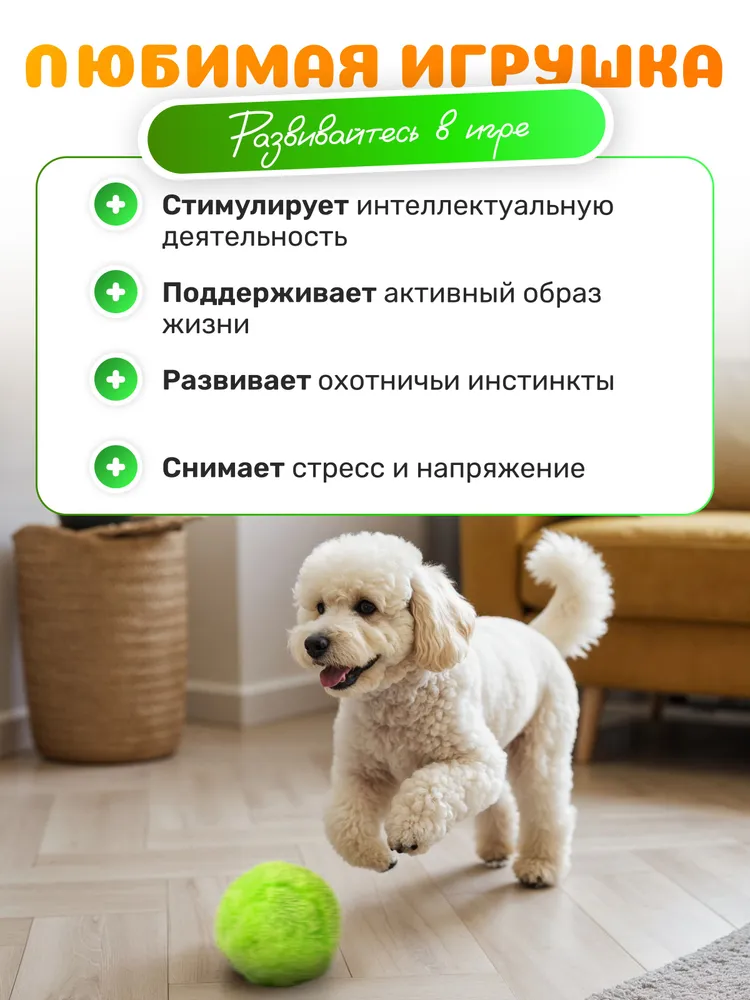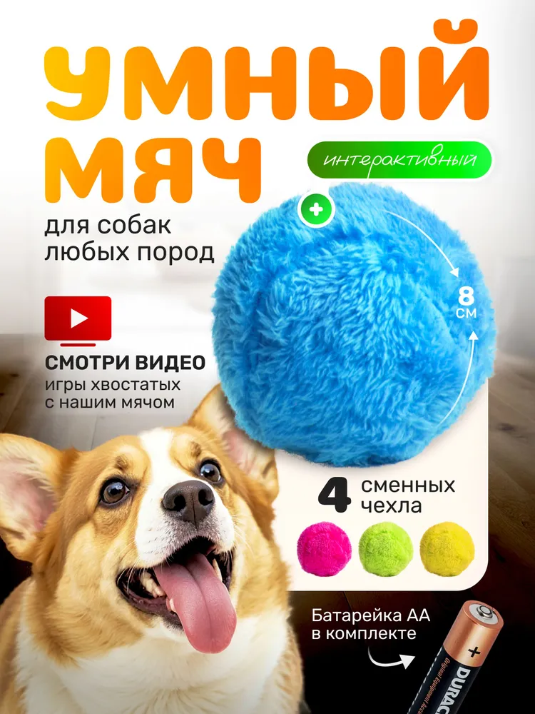 Умный мяч "Робобол"Умный мяч "Робобол" - идеальное развлечение для ваших любимых питомцев!Этот уникальный робот-мяч сделан специально для собак и принесет незабываемую радость вашим домашним любимцам.Он обладает всеми необходимыми характеристиками, чтобы гарантированно заинтересовать и порадовать питомца.Умный мяч "Робобол"Мяч оснащен четырьмя сменными чехлами из мягкого плюша, которые обеспечат дополнительный комфорт и приятные ощущения во время игры. Важно отметить, что мяч полностью безопасен для вашей собаки.С диаметром всего 8 см, мяч идеально подходит для игры как в помещении, так и на улице. Работает мяч от всего одной батарейки, что обеспечивает длительное время использования без необходимости постоянной замены.Умный мяч "Робобол"Основное преимущество "Робобол" - его способность самостоятельно кататься, превращая игру в увлекательное приключение.Питомцы будут в полном восторге от этого автоматического игрушечного друга, который точно сможет поднять им настроение и сделать их счастливыми.Приобретайте умный мяч "Робобол" и подарите своему питомцу незабываемые моменты радости и веселья!
