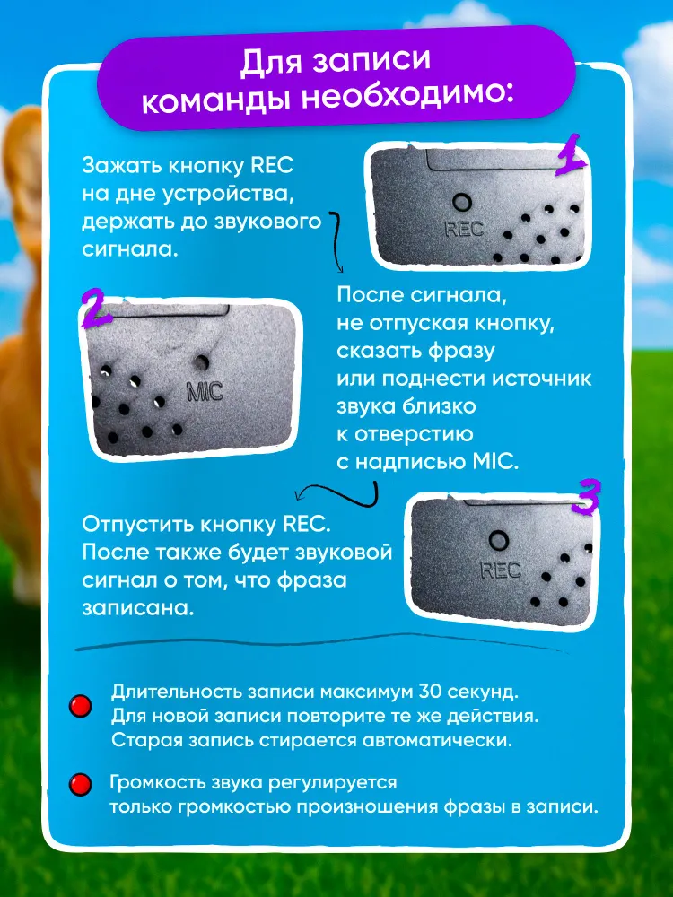 Запишите свой голос и помогите питомцу разобраться, нажимайте на кнопку и давайте корм, вскоре любимец поймет , что нужно делать.Инструкция