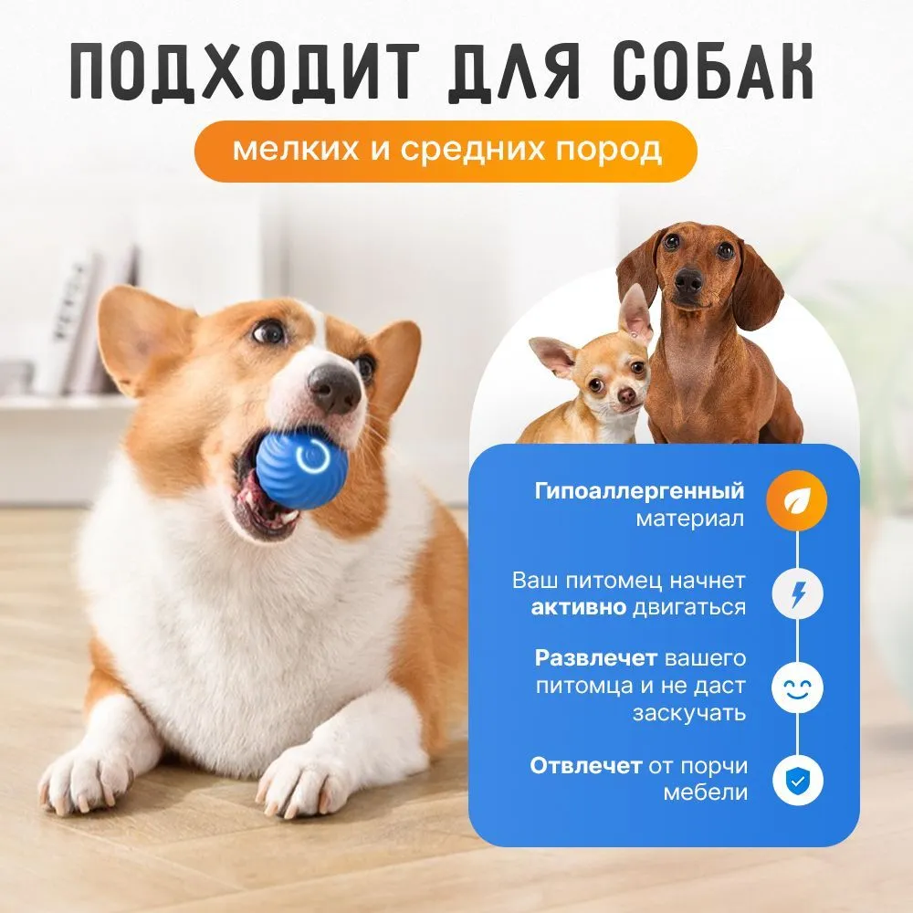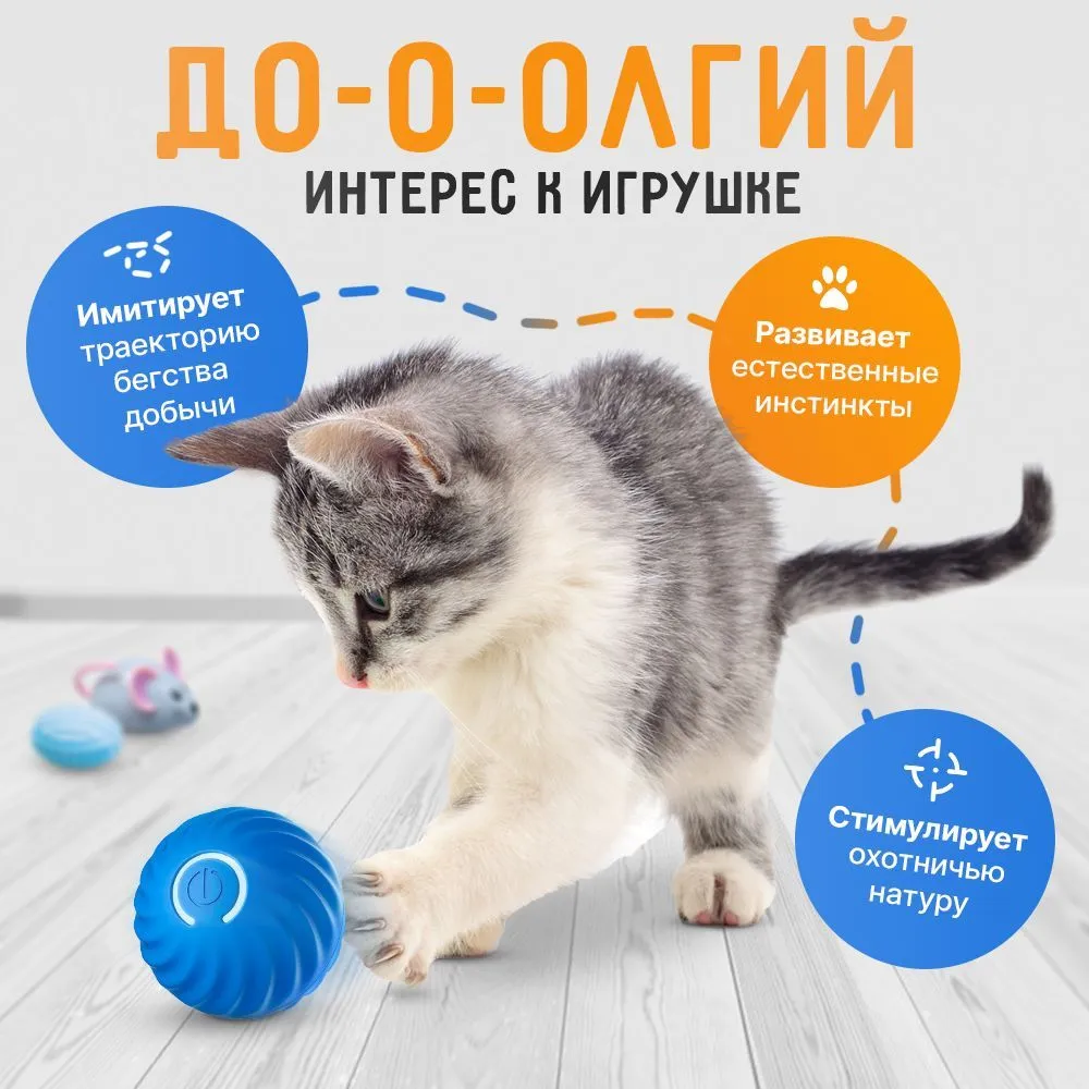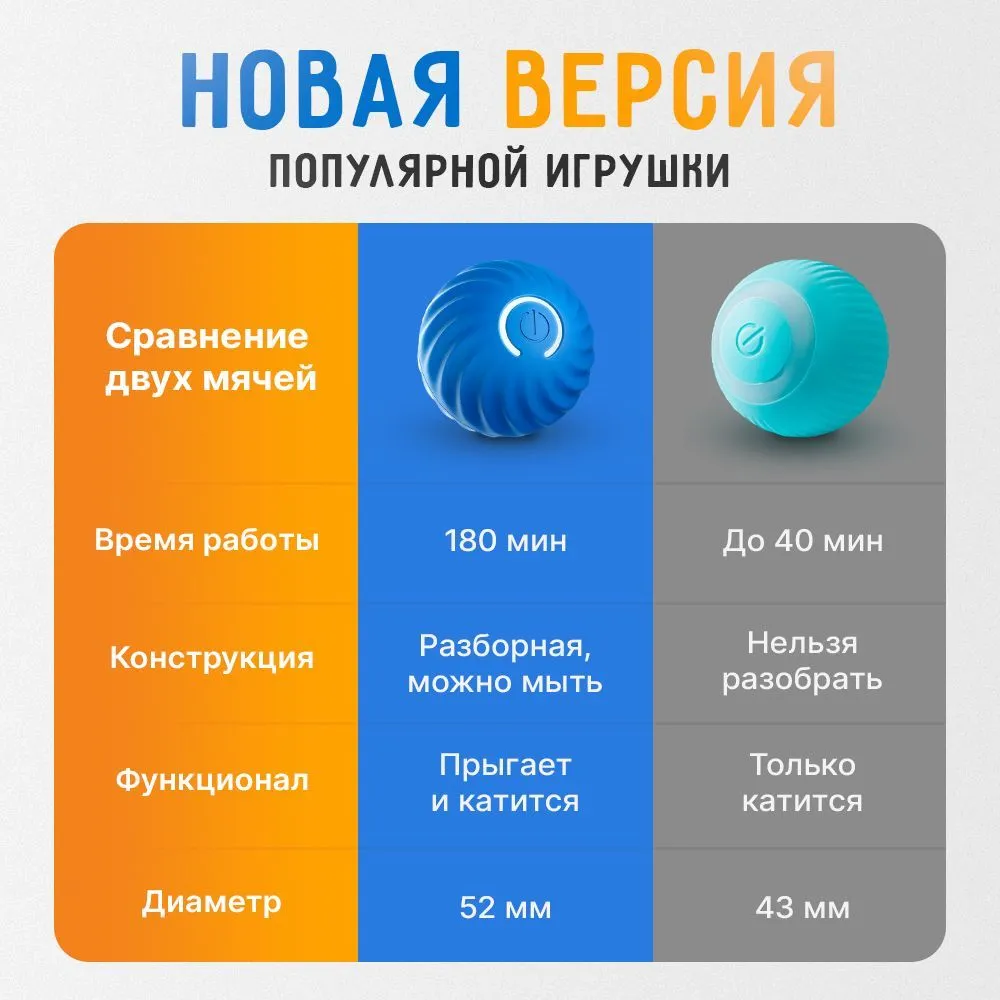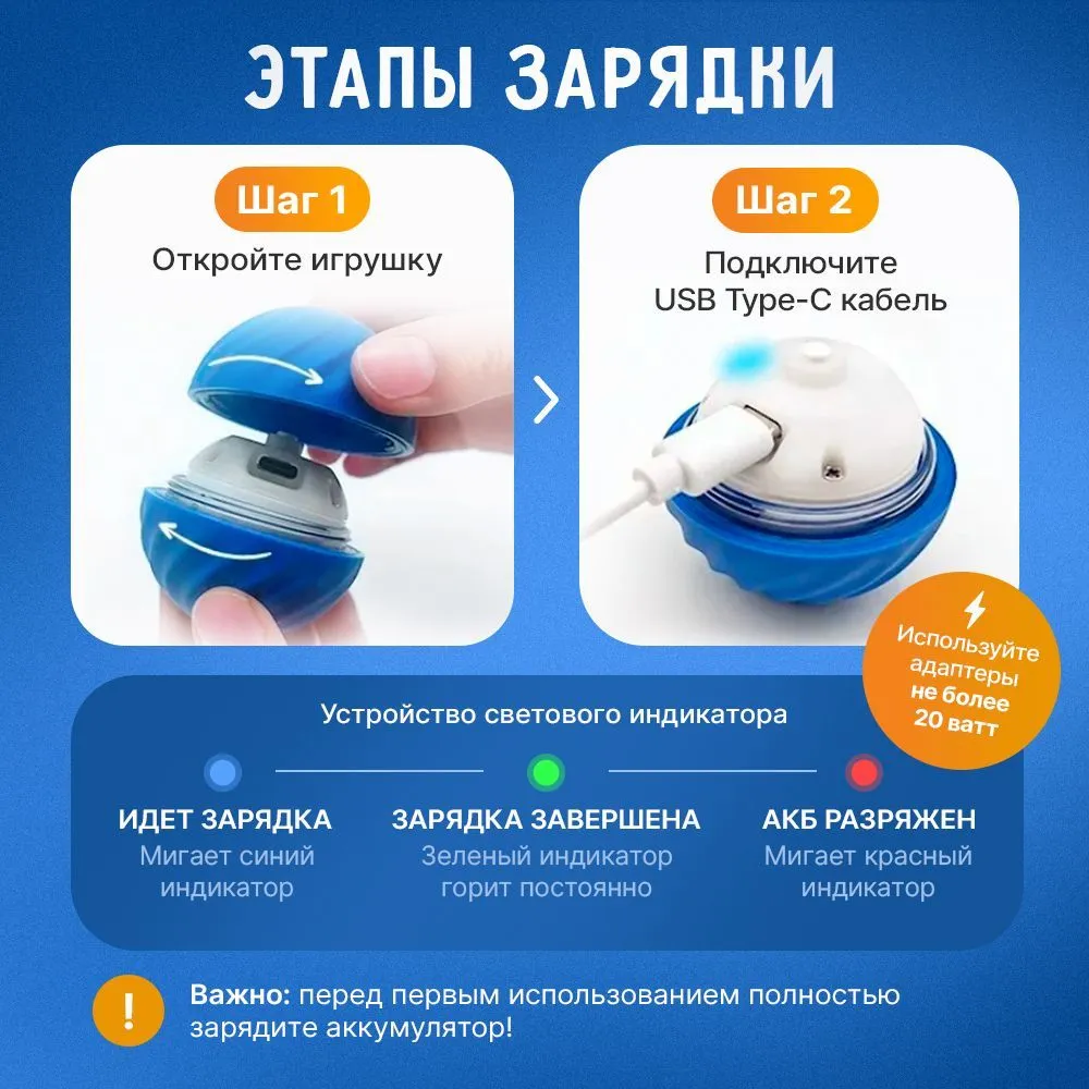 ШАРИК ПРЫГАЕТ, ПОЭТОМУ ДОСТАТОЧНО ШУМНАЯ, ОСОБЕННО НА ТВЕРДЫХ ПОВЕРХНОСТЯХ \n\n\nВстречайте новую уникальную игрушку для кошек - прыгающий мячич. Игрушка дразнилка для кошек и собак мелких пород, в виде умного автоматического мячика который двигается в разных направлениях и также прыгает, отлично подойдет для развлечения и развития домашнего питомца. Выполнен из высококачественных материалов – силиконовая резина. Безопасна для питомцев, они могут его даже грызть. Игрушка Шар имеет все, чтобы обеспечить много счастливых моментов и разбудить в ваших домашних животных настоящего охотника, не даст заскучать вашему коту или кошке. Умный мячик для кошек отвлечет вашего любимку от порчи мягкой мебели, избавит руки от острых когтей и подарит свободное время. Игрушка автоматически избегает препятствия, подходит не только для кошек, но и для мелких и средних собак.Внимание! Пожалуйста, полностью зарядите аккумулятор при первом использовании!Шарик постоянно меняет траекторию. Световой индикатор горит на протяжении всего времени работы.ВАЖНО: Игрушка выполнена из более прочных материалов, поэтому она шумнее. Учитывайте эту информация при покупке. Так же смотрите видео, на котором показано 2 шарика и какие они по шуму!!!ВАЖНО:1. Перед тем как включить игрушку, ее необходимо поставить на зарядку на 3 часа.2. ИГРУШКА НЕ БУДЕТ ЗАРЯЖАТЬСЯ ОТ ВЫСОКОМОЩНЫХ БЛОКОВ ПИТАНИЯ, ИСПОЛЬЗУЙТЕ БЛОКИ МАКСИМАЛЬНОЙ МОЩНОСТИ В 20 Вт3. Мячика хватает на 180 минут активной игры.4. У мячика 2 режима: внимательно ознакомьтесь с каждым!5 . Когда мячик остановился, то это не означает, что он разрядился. На 2 режиме он активируется касанием.Размеры игрушки: 52*52мм.РЕЖИМЫ РАБОТЫ:Включите игрушку с помощью кнопки «включение». При включении автоматически 3 секунды горит желтый индикатор. Шар будет работать 5 минут, после произойдет автоматическое выключение.Включите игрушку с помощью кнопки «включение». При включении автоматически 3 секунды горит желтый индикатор. Удерживайте кнопку включения еще 3 секунды, загорится синий индикатор, игрушка автоматически переходит в режим «ожидания» после каждых 5 минут работы, ее можно активировать одним касанием. Чтобы выключить игрушку, необходимо удерживать кнопку «выключения» в течение 3 секунд, индикатор сменится с синего на желтый, после еще раз нажмите на кнопку «выключения» и тогда игрушка будет выключена.Время работы: 180 минут