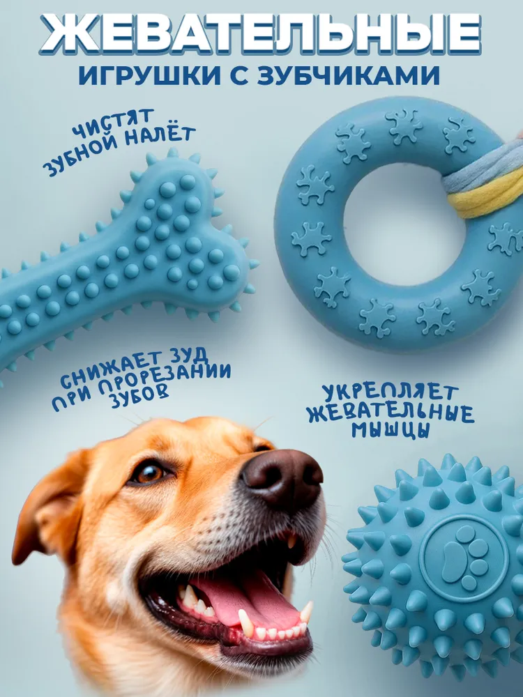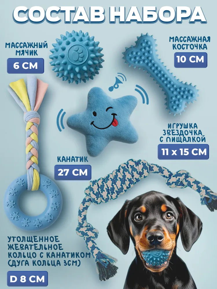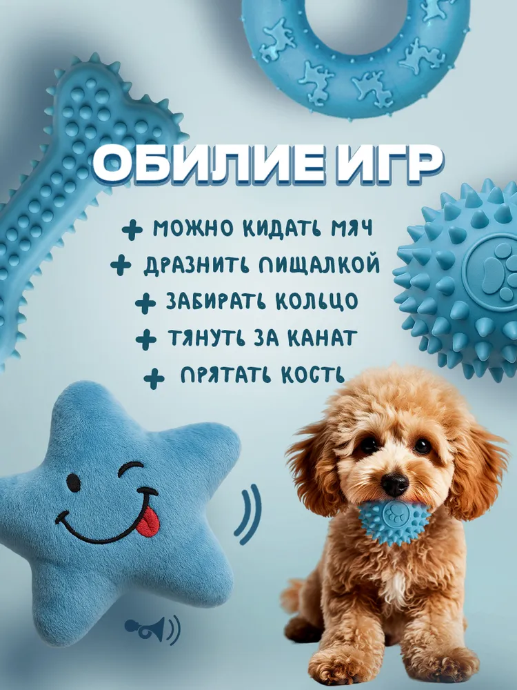Набор игрушек для щенков, собак мелких и средних пород-идеальное решение для активных и игривых питомцев. Вы будете спокойны за своего собакена купив по-настоящему прочный комплект игрушек, он отлично подойдет для активных игр, дрессировки и просто послужит заменителем ваших тапок, а уровень “счастливости” вашего хвостатого друга будет зашкаливать на целый день. Набор состоит из 5 игрушек для маленьких собак и щенков: канатный мяч, силиконовый пуллер с канатом, кость для чистки зубов, мягкая игрушка с пищалкой, когда грустно и утолщенный канат с двумя узелками для интенсивных игр. Игрушки выполнены из безопасных, гипоаллергенных материалов и не имеют каких-либо посторонних химических запахов. Для производства использовался 100% хлопок и высоко качественной резины (из него делают игрушки для детей, аналог силикона и латекса). Косточка, мячик, пуллер не имеют каких-либо пустот внутри, что делает игрушки особенно долговечными. Кость (палка) и пуллер с канатом (кольцо)—это игрушки для чистки зубов, массажа десен, укрепления и развития челюсти, а также просто что-то пытаться жевать, когда зубки только появляются. Мячик для собаки можно использовать для дрессировки такой команды как апорт и поиск (он отлично прыгает). Высокопрочный канат подойдет для игры в перетягивание (кто сильнее тот и перетянул, если собачка очень маленькая-нужно уметь проигрывать), а также выполнит роль дразнилки и кусалки. Игрушка с пищалкой нужна, когда собачка нацелена на Ваши тапки (а они Вам дороги), пищалка способна привлечь внимание и на долго отвлечь питомца. Набор игрушек для собак отлично подойдет для щенков от 2х месяцев, средних щенков, крупных щенков и мелких пород собак. Набор можно использовать как собачий антистресс так и для поддержания тонуса и физической формы Вашего питомца. Помните, они наши меньшие братья, не лишайте их маленьких радостей жизни.
