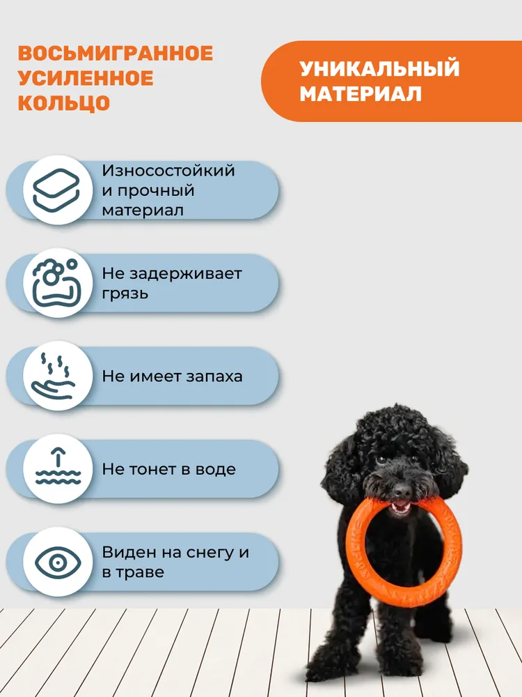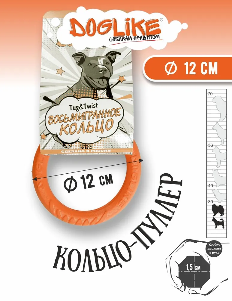 Кольцо для маленьких собак крохотное Doglike - отличный снаряд для аппортировки и игры с собакой. Кольцо изготовлено из композитного материала по усиленной формуле, прочное и износостойкое. Питомец обязательно оценит такую игрушку и ответит любовью, здоровьем и отличным настроением!· Снаряд не тонет в воде и имеет малый вес - это позволяет Вашему питомцу не только получать удовольствие от плавания, но и обеспечивает нагрузкой все группы мышц.· Разнообразие упражнений: перетягивание кольца, подвешивание на высоте, аппортирока, обучение командам: «дай», «взять» и т.д.· Яркое оранжевое кольцо хорошо заметно на снегу, воде и в траве· Восьмигранное сечение не позволяет кольцу прокручиваться в руке