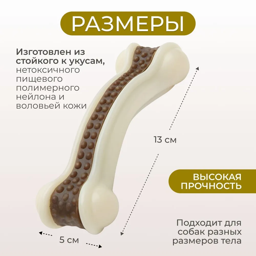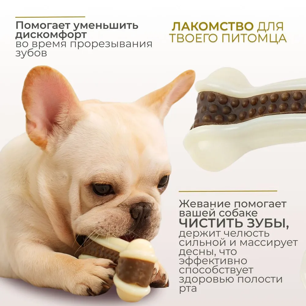 Жевательная игрушка — это самый лучший способ совместить приятное с полезным и занять своего питомца на долгое время во время чистки полости рта. Косточка выполнена из натурального нейлона с добавлением говяжьей съедобной кожи — ни одна собака не устоит перед таким вкусным угощением! Лакомства предназначены для мелких, средних и крупных пород, также подойдут и для щенков, у которых только начинают меняться зубы. Грызунок поможет вам не только провести тщательную гигиену зубов любимца, но и защитить мебель, напольное покрытие и двери от игр маленьких проказников. Зубочистка безопасна для животных, не травмирует зубы или нежную слизистую, не выделяет токсичных веществ и прекрасно справляется не только с налетом, но и зубными камнями. Зоотовары обладают высокой прочностью и с легкостью выдерживают многочасовое ежедневное жевание. Благодаря специальной изогнутой форме обеспечивается удобство — собака сможет обхватить изделие лапами и легко держать игрушку пастью. Вкусняшки привлекут даже самых требовательных любимцев — приятный мясной аромат никого не оставит равнодушным! Игрушка антигрызин станет большим помощником для тех, кто вынужден долго отсутствовать дома по работе или другим делам. Кость займет домашних животных на длительный период, и ваш пушистый друг даже не заметит вашей пропажи!