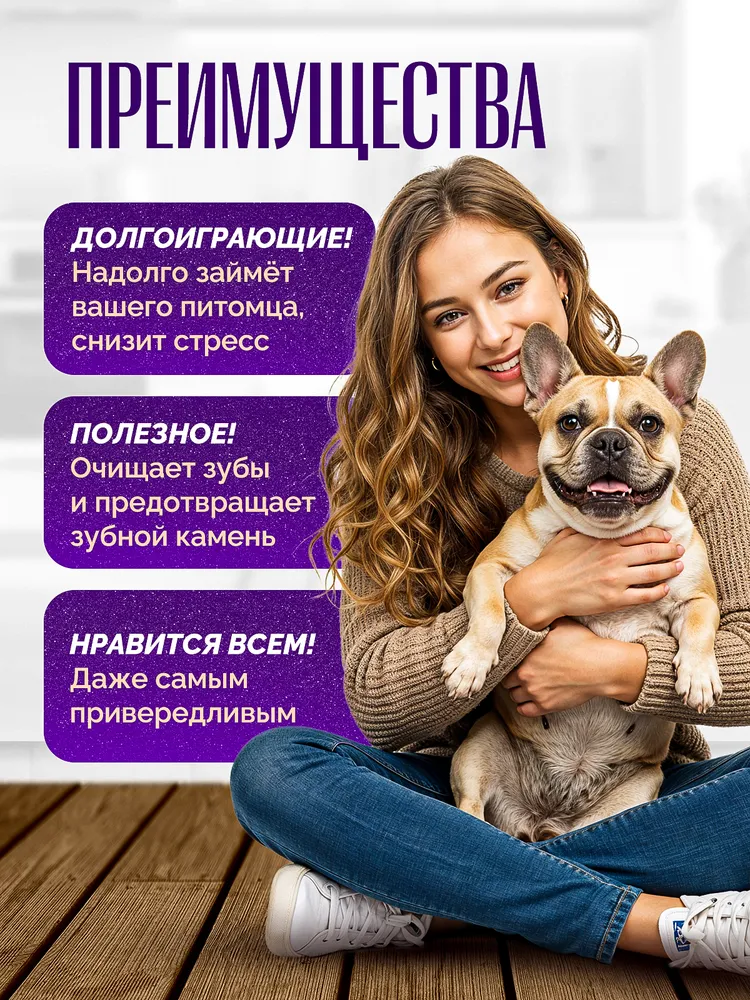 Лакомство заменит игрушки для чистки зубов и игрушки погрызышки. Можно сделать чистку увлекательной и интересной, а также отвлечь вашего любимца от грызения вещей и мебели, заменив опасные мягкие игрушки на безопасные антигрызуны! Кроме того, лакомства помогут удержать питомца внимания во время вашего отсутствия. Вкусняшки займут щенка или взрослую собаку на долгое время. Съедобная игрушка погрузушка поможет отучить щенка грызь ваши вещи.Рекомендуем давать каждый день