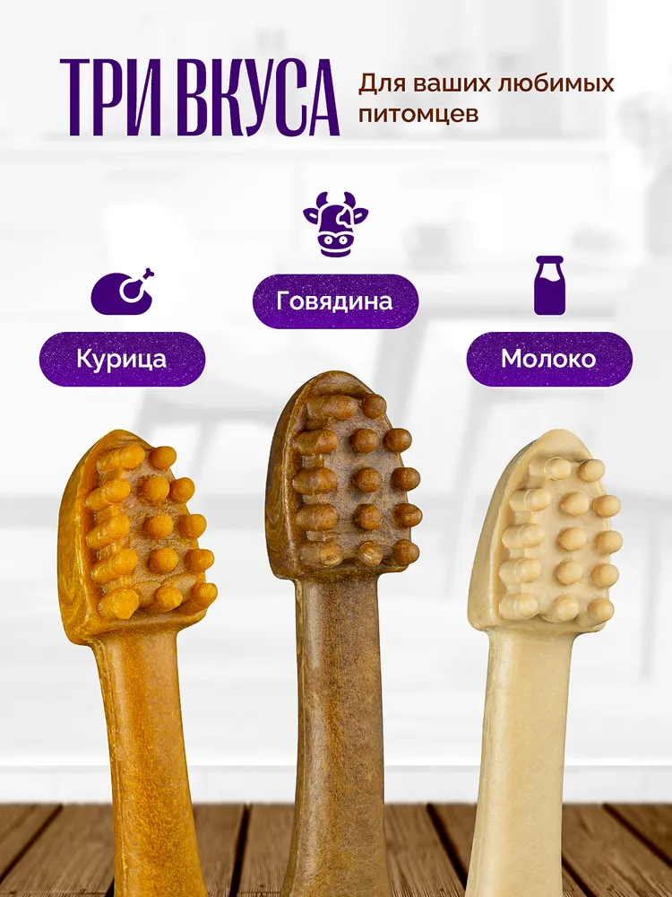 В наборе 34 косточки щеточки разных вкусов. Хватит на долго!Форма щетки для зубов