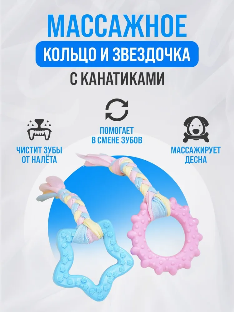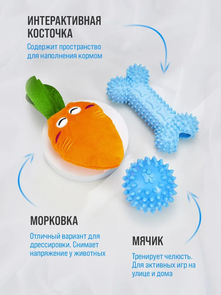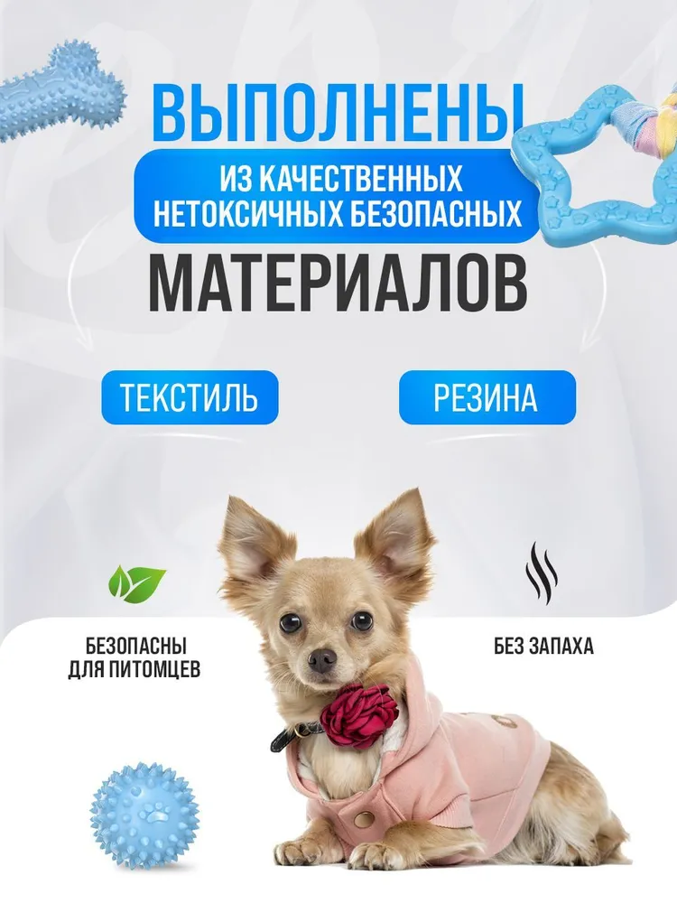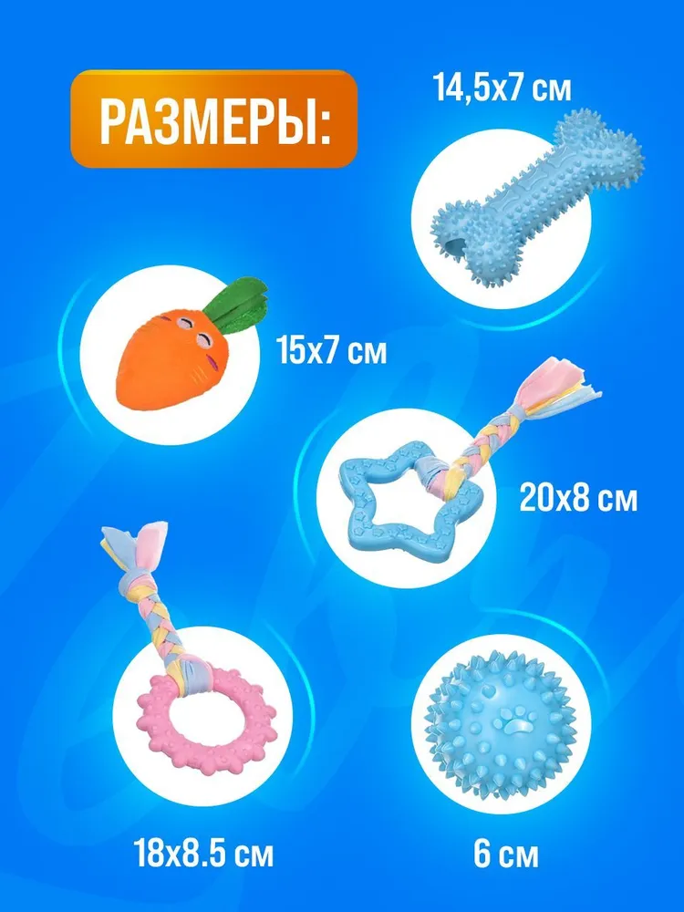 Игрушки для собак мелких пород и щенков. В набор входят самые популярные развивающие игрушки: резиновый мяч с пищалкой; интерактивная косточка, которая содержит пространство для наполнения кормом; массажное кольцо с канатом; массажная звездочка с канатом; мягкая игрушка - пищалка. Игрушки подходят по размеру именно щенкам и маленьким породам собак. Интерактивная косточка развивает интеллект и охотничьи инстинкты питомца. Для активной игры прекрасно подойдет резиновый мячик для бросков. Массажное кольцо и звездочка с канатиками, косточка помогают в смене зубов, чистит зубы от налета, массажирует десна. В наборе прочные и крепкие игрушки, для того чтобы собаки могли специально грызть и кусать. Яркие занимательные игрушки, их можно использовать и для дрессировки собак и как собачий антистресс или просто как полезные подарки и радость для домашних животных. Будьте спокойны за вещи и интерьер вашего дома, игрушки надолго займут вашего питомца. Игрушки прекрасно подойдут для собак таких пород как: чихуахуа, корги, мопс, такса, шпиц, бульдог, йорк, лабрадор, овчарка, долматинец, хаски, джек рассел, терьер, доберман. Берите их с собой на улицу, на веселую прогулку, в дорогу, на активный отдых, площадку, в поездку, идеальны для дома, комнатных игр или на лежанке.