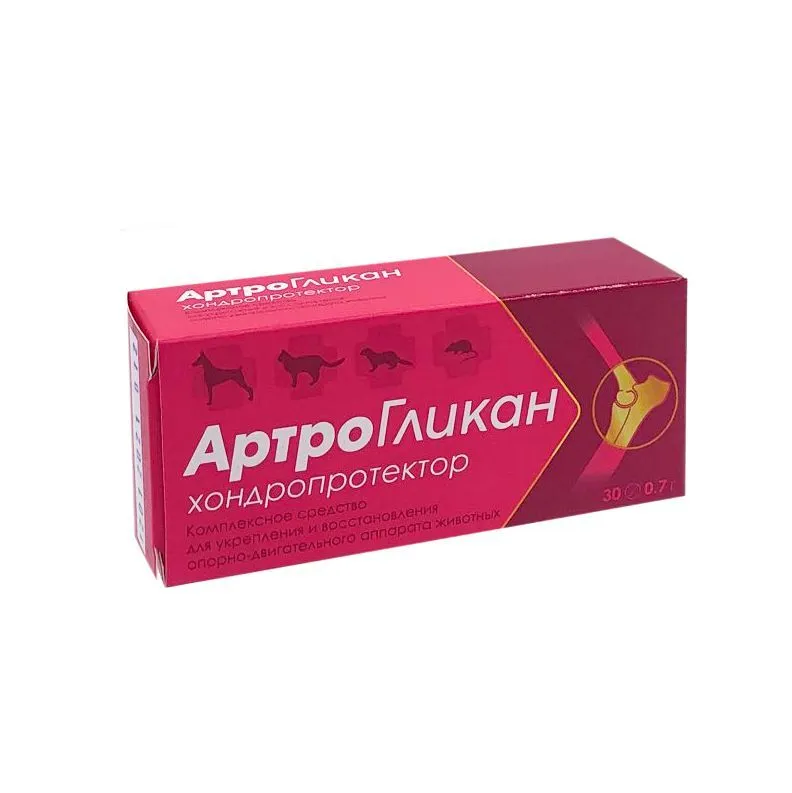 Перед применением препарата Артрогликан необходимо проконсультироваться с ветеринаром.Артрогликан — это кормовая добавка для собак, кошек, лошадей и других животных. В состав препарата входят глюкозамин, хондроитин, кальций, витамин Е и селен. Эти компоненты способствуют восстановлению хрящевой ткани, улучшают подвижность суставов, снимают воспаление и боль.Преимущества препарата Артрогликан:способствует восстановлению хрящевой ткани;улучшает подвижность суставов;снимает воспаление и боль;укрепляет связки и сухожилия;замедляет процесс разрушения хрящей;не имеет побочных эффектов.Способ применения:Собакам и кошкам – по 1 таб. на каждые 10 кг массы тела животного два раза в день.Собакам массой более 40 кг – по 4 таб. 2 раза в день независимо от массы тела.Крысам, хорям – по 1/2 таб. 2 раза в день.Минимальный курс лечения составляет 30 дней.Препарат можно давать животным во время еды или после неё. Перед применением рекомендуется проконсультироваться с ветеринарным врачом.Артрогликан — это эффективное средство для профилактики и лечения заболеваний опорно-двигательного аппарата у животных. Препарат помогает восстановить хрящевую ткань, улучшить подвижность суставов и снять боль.