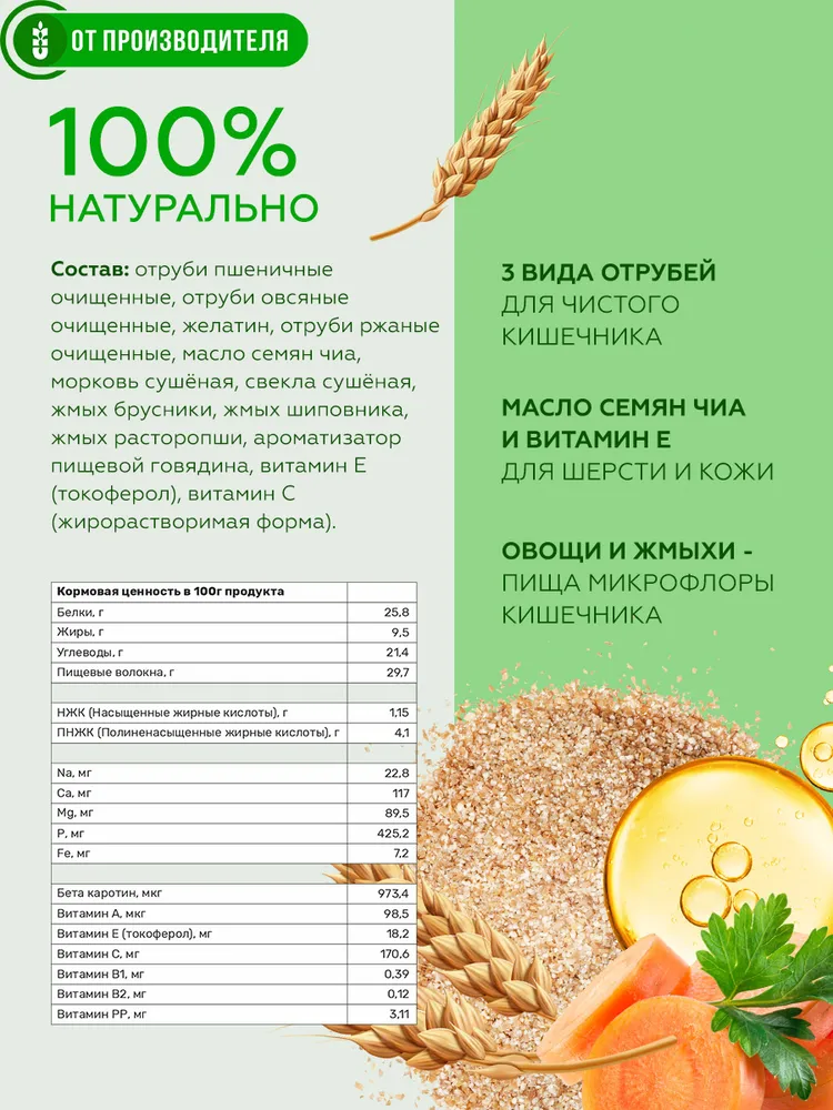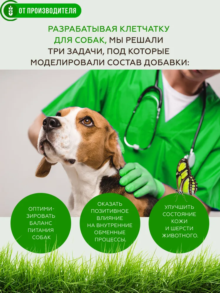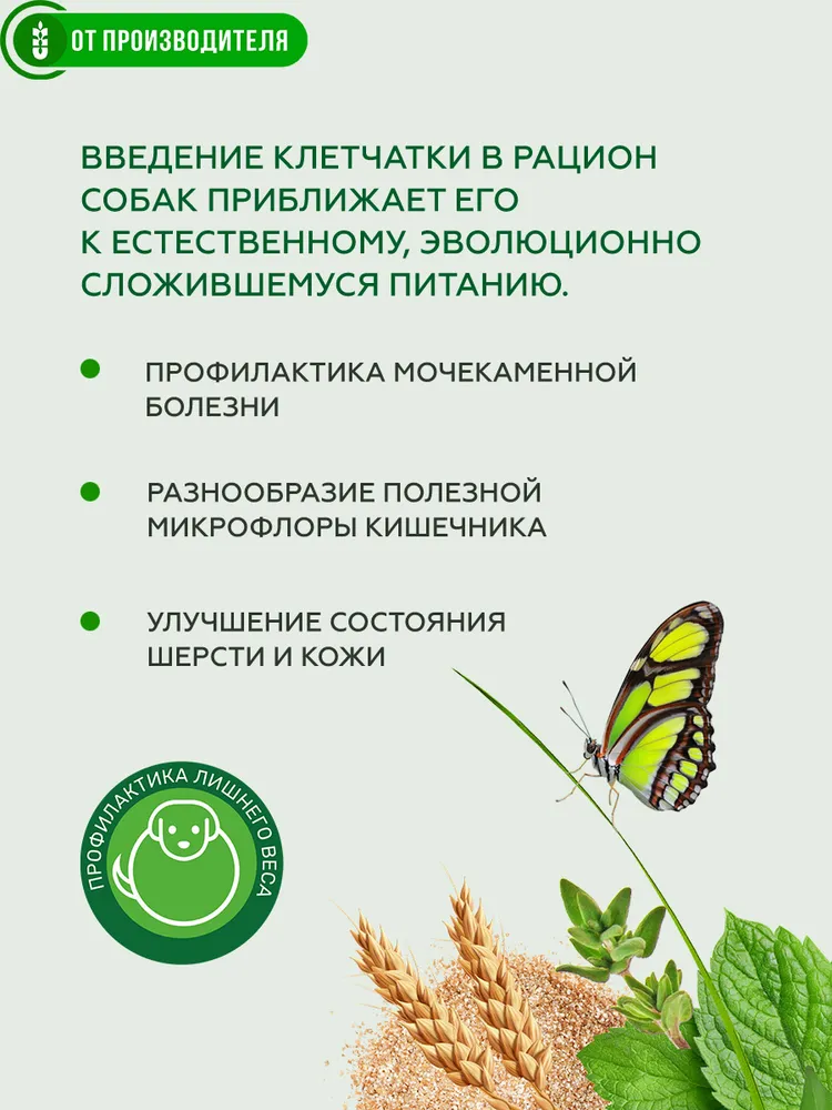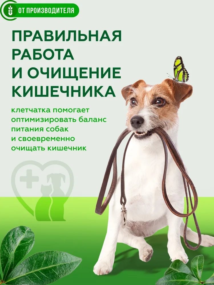 Клетчатка для собак.Для профилактики ожирения и улучшения работы кишечника.Физиология собак во многом похожи на физиологию человека. Поэтому здоровье собак, как и людей страдает от лишнего веса и не сбалансированного питания. Избыточный вес серьезно отражается на здоровье, настроение, активности и внешнем виде наших питомцев.Как для человека, так и для собак эффективным природным средством для правильной работы желудочно-кишечного тракта и поддержания оптимального веса является компонент растительной пищи - клетчатка.Несмотря на то, что собака является плотоядным хищником для поддержания хорошей формы и полноценного обмена веществ ей ежедневно необходимо съедать определенное (порядка 20%) количество растительной пищи и соответственно клетчатки.Специальный растительный комплекс «Кора» полностью закрывает ежедневную потребность собаки в различной клетчатке.При регулярном добавлении в пищу растительный комплекс «Кора»:• нормализует вес• препятствует перееданию• улучшает работу и самоочищение пищеварительного тракта• повышает разнообразие кишечной микрофлоры.Полезные компоненты, входящие в комплекс «Кора» улучшают состояние шёрстного покрова. Способствуют повышению настроения и активности животного.Рекомендации по приему: Для регулярного приема. При лишнем весе. Для профилактики ожирения. Для нормализации работы желудочно-кишечного тракта.Дозировка: пол чайной ложки на 1 кг. веса животного. Смешивать с влажным и сухим кормом. Добавлять в готовую еду. Следить за постоянным наличием питьевой воды.