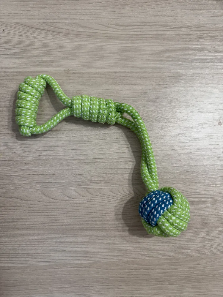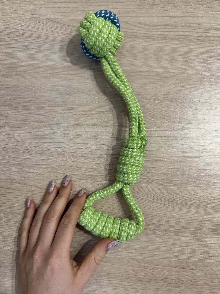 Веревочная игрушка в виде перетяжки с мячом будет и полезна: она очень хорошо очищает зубки от зубного налёта, чешет десна и развивает челюсть! Наша стильная игрушка понравится каждому питомцу и отлично впишется в интерьер каждого дома. Игрушка сделана из хлопка, это ручная работа. Вес игрушки 90 гр, размер 30 см в длину, диаметр мячика 5,5 см
