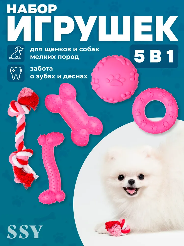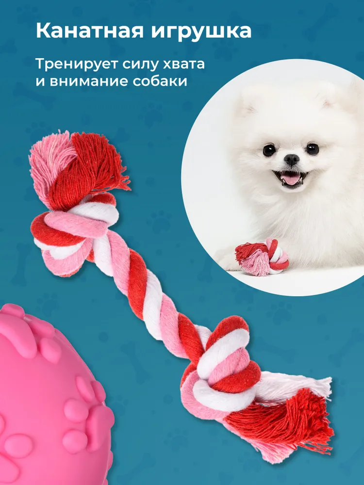 Если вы хотите, чтобы ваша собака перестала грызть обувь и мебель в доме, предложите ей интерактивные игрушки для собак. Они отвлекут питомца от вещей и позаботятся о его зубах и деснах. Набор сделан из хлопка и терморезины, которые не имеют запаха, вкуса и совершенно безопасны для животных.Наши игрушки для щенков средних пород и собак мелких пород — это 5 разных грызунков со своим назначением: мяч для собак с пищалкой поднимает настроение питомцу. Жевалки очищают зубы от налета, массируют десны и развивают подвижность челюсти. Канатная жевалка тренирует силу хвата и внимание собаки, а интерактивная игрушка отлично развивает интеллект. Заполните интерактивную косточку любимым лакомством собаки и она не успокоится, пока не достанет оттуда все. Отличный способ занять питомца, если вам срочно нужно сделать важные дела. Набор можно использовать дома и на улице. Берите его во двор, в парк или на природу. Каждая собака будет в восторге от игры в перетяжки и погони за мячиком! Если вы хотите насладиться отдыхом и думаете, чем занять собаку, предложите ей косточку. Наш набор для зубов для щенков — это отличный способ навсегда отучить собаку грызть то, что нельзя. Отлично подойдет для таксы, йорков, чихуахуа, джек рассела и шпицов.Жевательный набор для маленьких собак достаточно крепкий и долго служит. Однако, в процессе игры, он все равно может деформироваться от собачьих зубов — это нормально. Прочная безопасная терморезина и натуральный хлопок являются отличной альтернативой мебельной обивке и обуви. Подарите своей собаке набор веселых и полезных резиновых игрушек, которые не только поднимут ей настроение, но и пойдут на пользу.