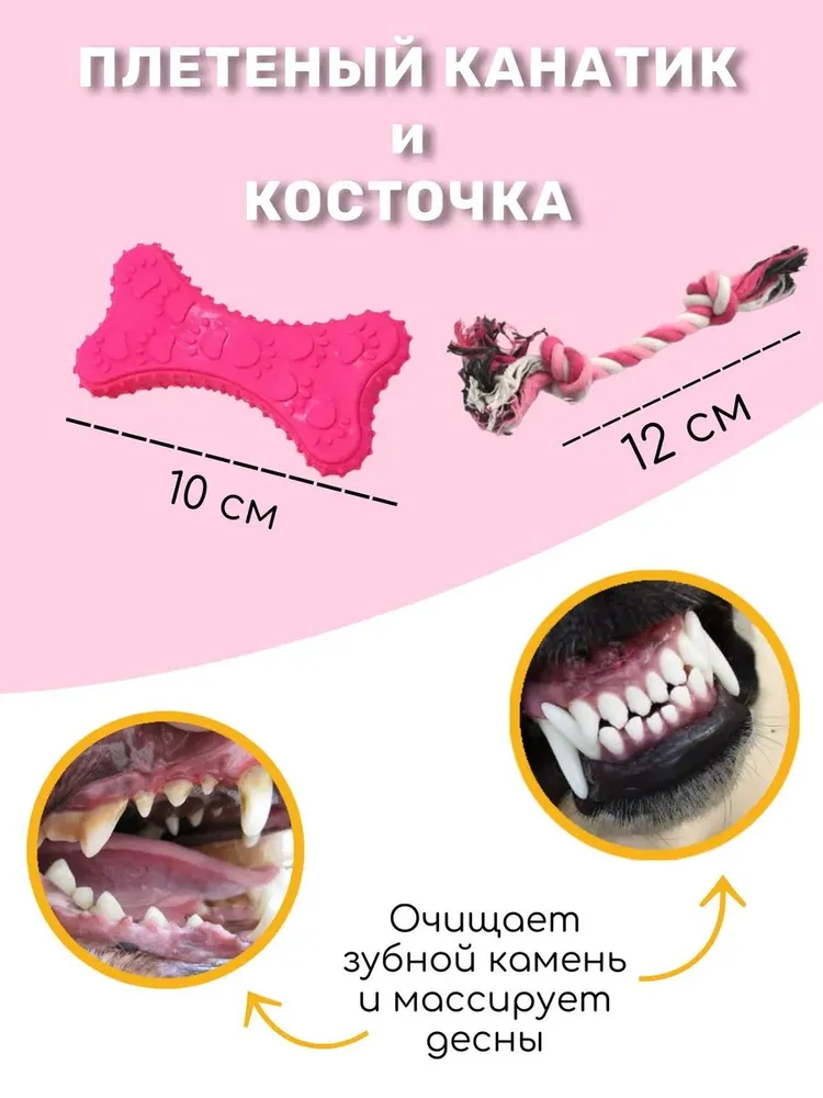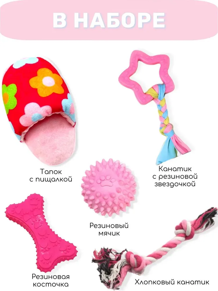 Игрушки для собак мелких пород.Набор игрушек для собак из 5 штук подходит для мелких пород, а также щенков. В наборе представлены: тапок пищалка - топ для вашей собаки, он хлопковый и пищит при нажатии на него, канат хлопковый для очищения зубов и массажа десен, кость резиновая с зубчиками для погрызушек и развития челюсти, мячик с зубчиками, звездочка резиновая с канатиком для массажа десен и игры в перетяжку. Каждая игрушка в наборе уникальна и безопасна для вашего любимца. Питомец будет надолго увлечен умными, прочными, обучающими игрушками. У собаки должны быть свои зоотовары, а именно грызаки, дразнилки, игрушки для собак с пищалкой, погремушкой, чтобы они не рушали квартиру и не игрались всем, что попадет под лапки. У всех, без исключения собак, присутствует охотничий инстинкт. Берите их с собой на улицу, на веселую прогулку, в дорогу, на активный отдых, идеальны для дома, комнатных игр или на лежанке. Игрушки для собак и щенков - отличное веселье и развлечение для вашей собаки. С уважением, команда FREEDSY ! Игрушки для собак мелких пород и щенков