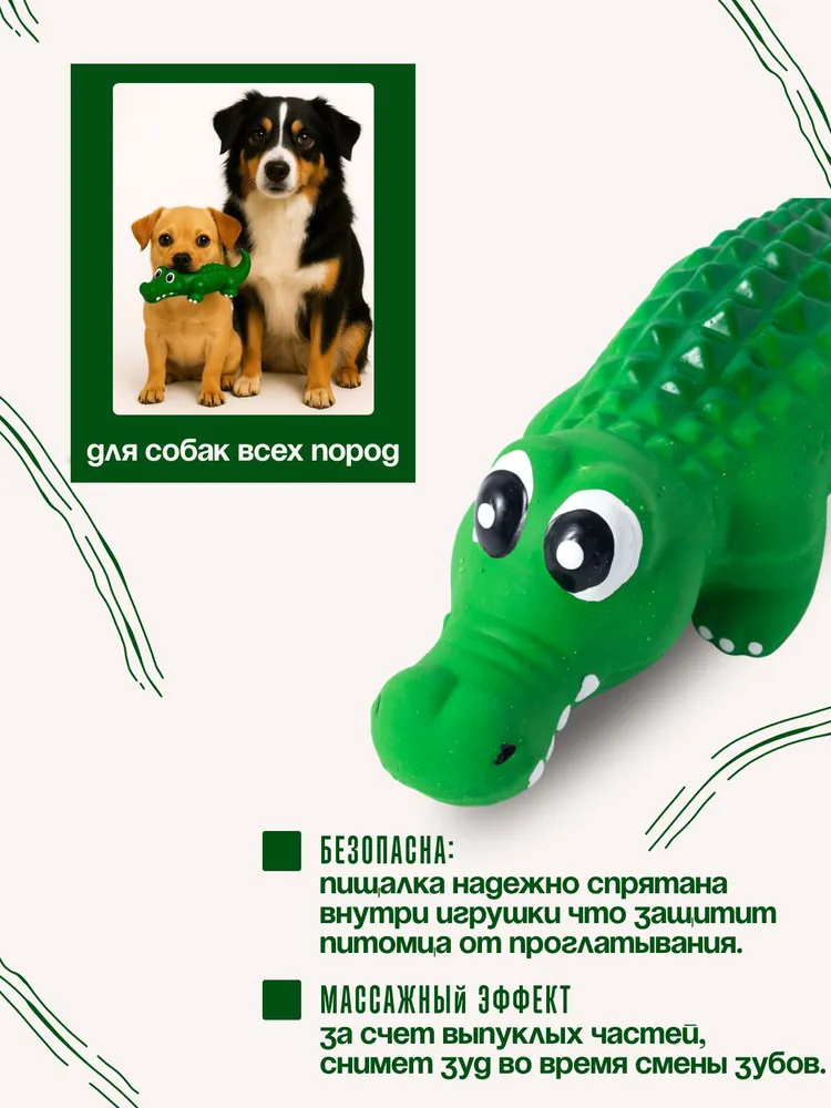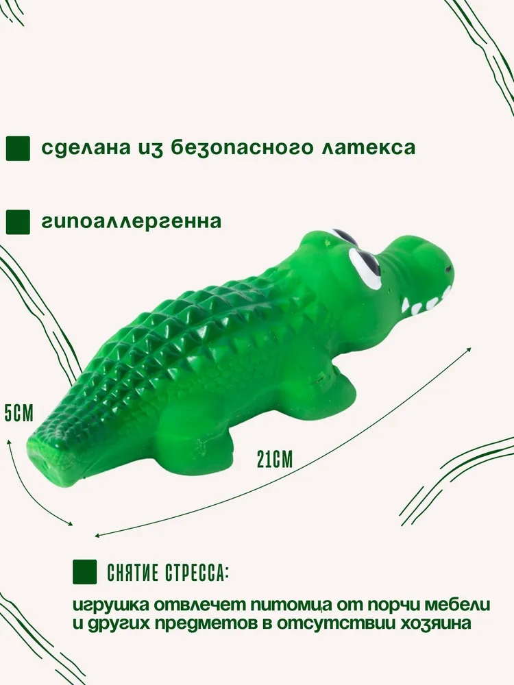 Игрушка пищалка для собак «Крокодильчик» разбудит в питомце азарт охотника! Яркая латексная игрушка для собаки – это не просто игрушка, а самая настоящая "добыча".Это идеальная игрушка для собак, так как удовлетворяет жевательный инстинкт и стимулирует природные инстинкты во время активной игры! При каждом укусе крокодильчик громко и заливисто пищит, имитируя добычу и вызывая у собаки бурю восторга.Это самый настоящий антистресс для собак. Латексная игрушка для собак – это отличный выбор для тех, кто хочет порадовать своего питомца. Игрушка пищалка не только позволяет собаке удовлетворить потребность в жевании, но и помогает снять стресс и предотвратить порчу мебели. Наш грызунок для собак яркого цвета и удобной формы, что привлекает внимание питомца и быстро затягивает в игру. Игрушка для щенка безусловно станет фаворитом вашего питомца.Игрушка для питомца имеет удобный размер и подходит для игр в апорт и жевания. Забавная игрушка пищалка выполнена из безопасного гипоаллергенного материала латекса, который не травмирует десны и подходит щенкам и собакам с чувствительными зубами. Ко всему прочему собачья игрушка хорошо моется.Латексная игрушка для собак станет постоянным спутником вашего любимца. Порадуйте своего питомца ярким крокодильчиком, ведь игрушки для собак важны для физического и умственного развития, развлечения, снятия стресса и укрепления связи с хозяином!Приятных и важных покупок!