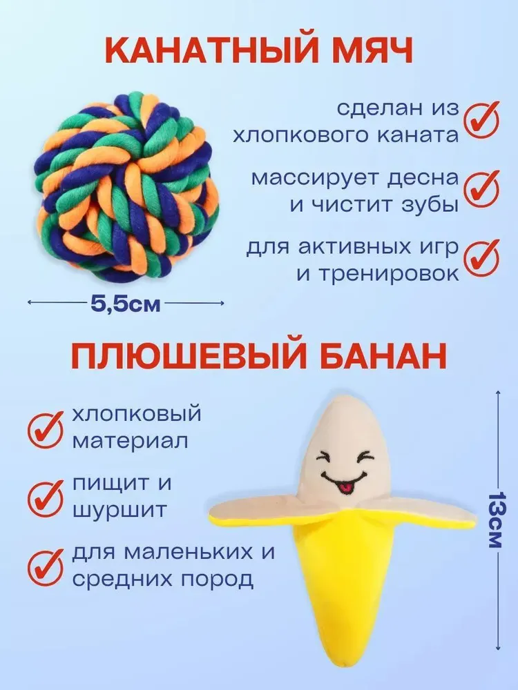 Отличный набор игрушек для собак включающий 5 игрушек!Наши игрушки предназначены для собак мелких и средних пород и щенков до года!Игрушки для собак, это зоотовары, чтобы он не рушил квартиру и не игрался всем, что попадет под лапки. Игрушки собачьи в набор очень разные - мягкие игрушки с пищалкой, а также мячи и канаты. Маленькие игрушки подойдут, как прорезыватель для зубов, массаж для десен. Подойдет для дрессировки, для активных игр на суше и в воде, на улице и в доме.Игрушки для собак