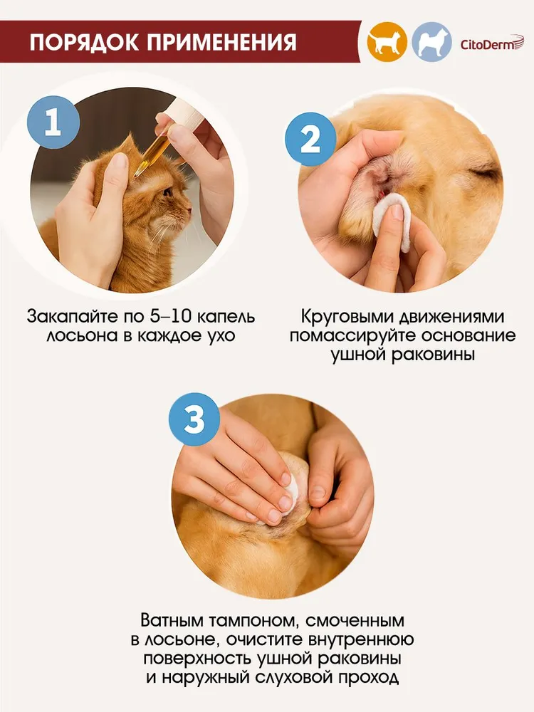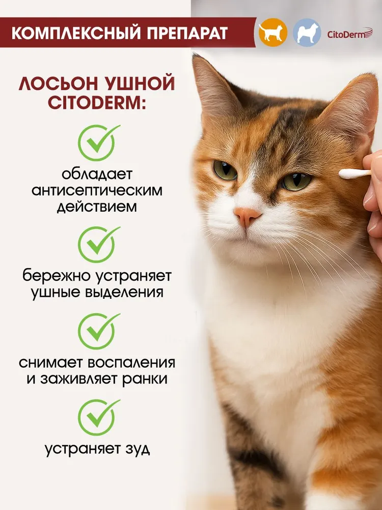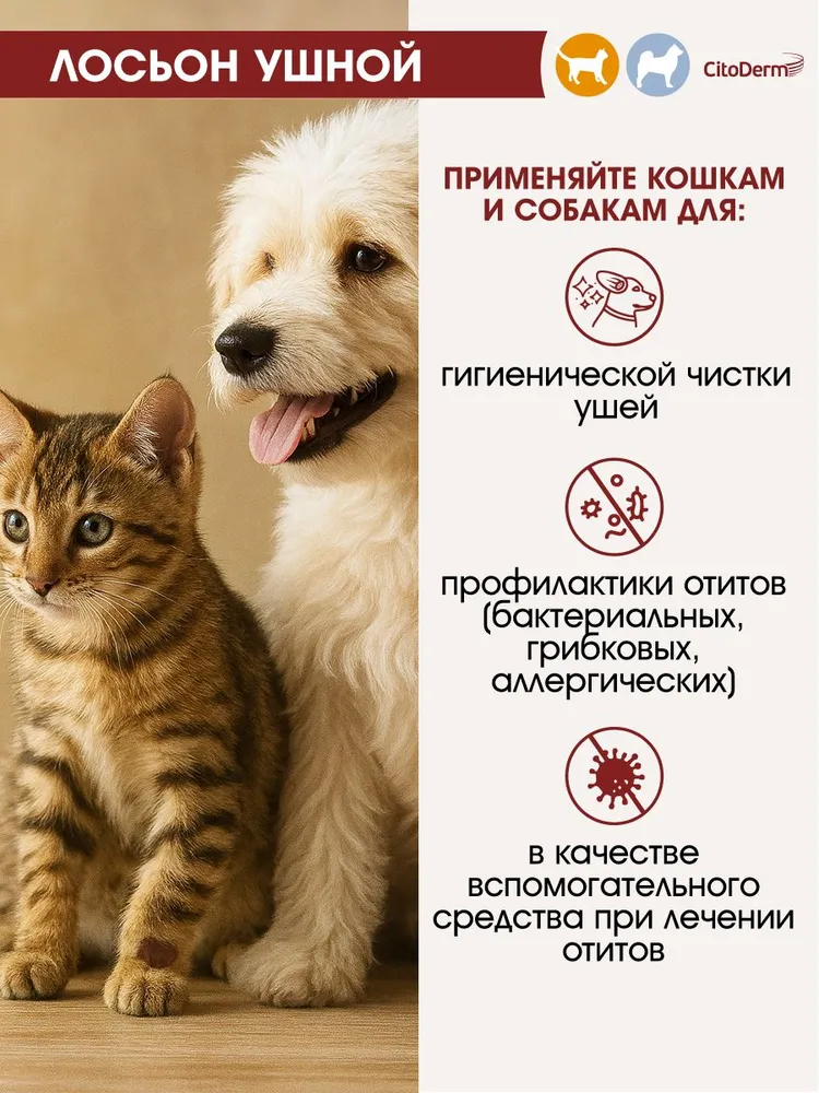 Когда у питомца болят и чешутся уши — нужен специальный уход. Для профилактики болезней и чистки ушей попробуйте CitoDerm лосьон ушной с хлоргексидином! Ушной лосьон капли с хлоргексидином CitoDerm:✔ Обладает выраженным антисептическим действием✔ Бережно устраняет ушные выделения✔ Снимает воспаления и заживляет ранки✔ Устраняет зуд