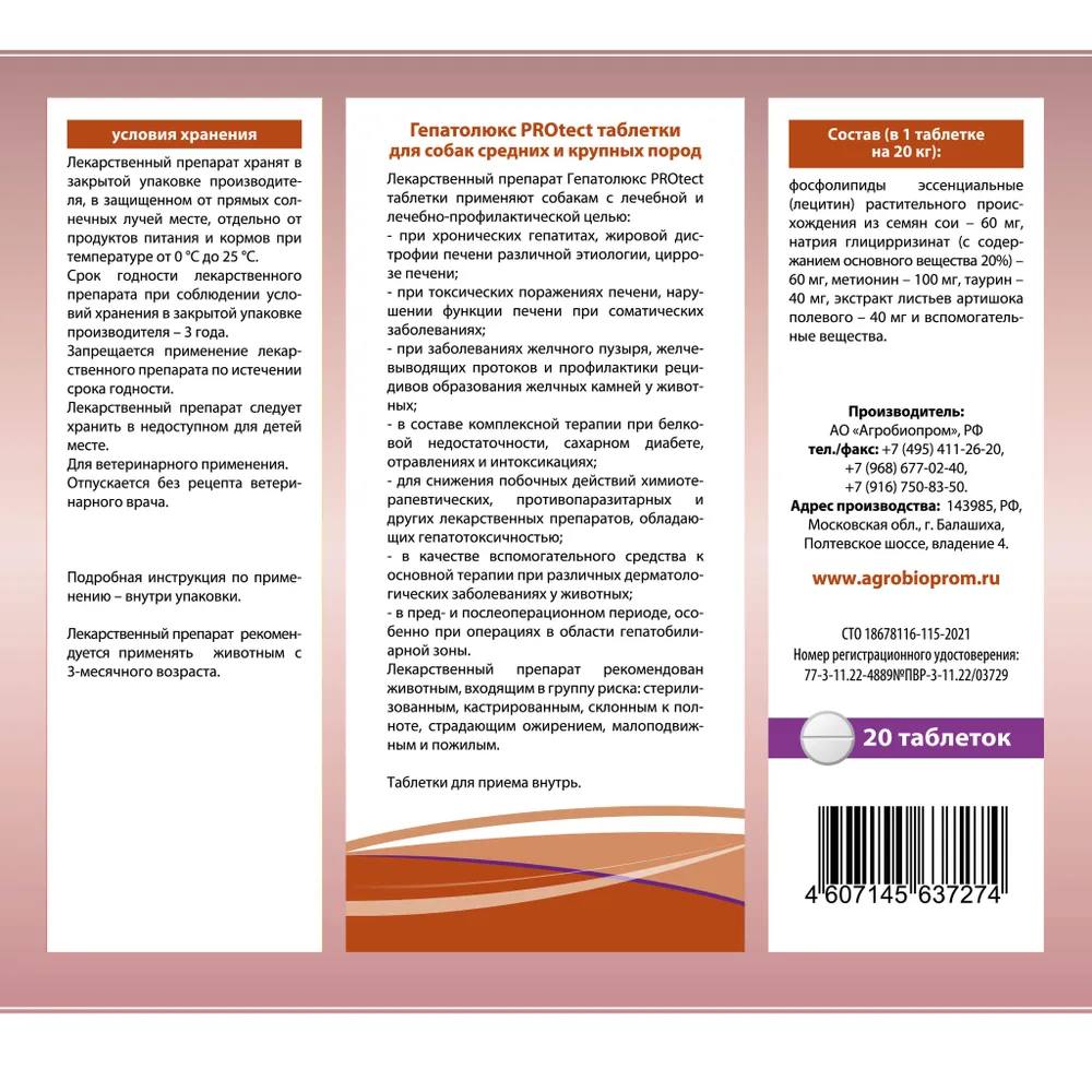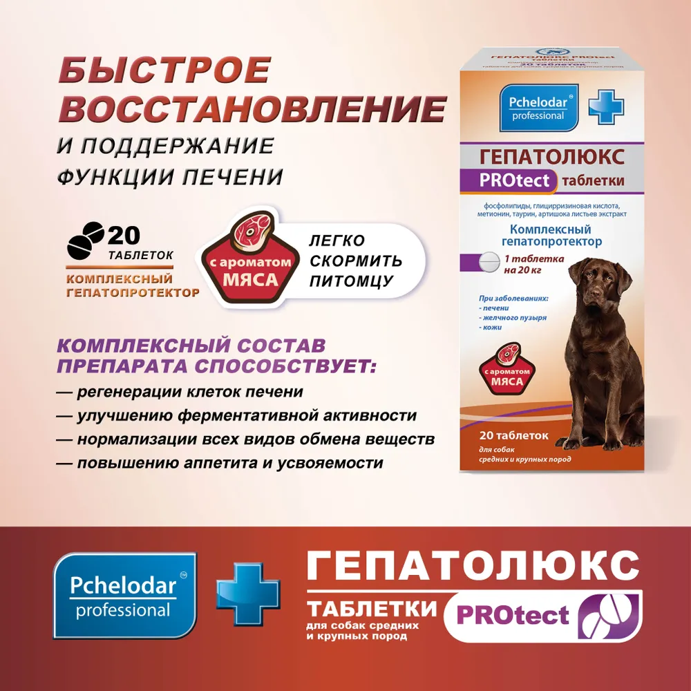 Гепатолюкс PROtect, Средство для лечения заболеваний печени у собак средних пород, Таблетки 20 шт, Пчелодар