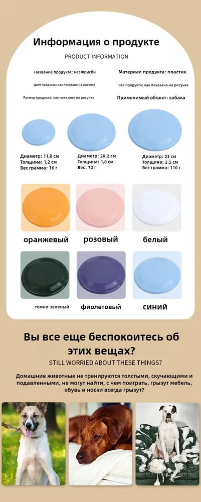 Характеристики:- Материал: безопасный прочный пластик- Доступные размеры:S (диаметр 11.8 см) - для мелких породM (диаметр 20.2 см) - для средних собакL (диаметр 23см) - для крупных пород- Вес: от 16 до 110 г (в зависимости от размера)Почему стоит выбрать наш диск:Развивает физическую активность собаки