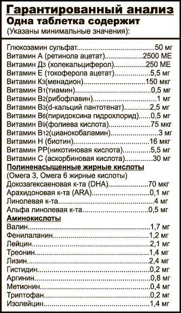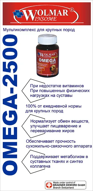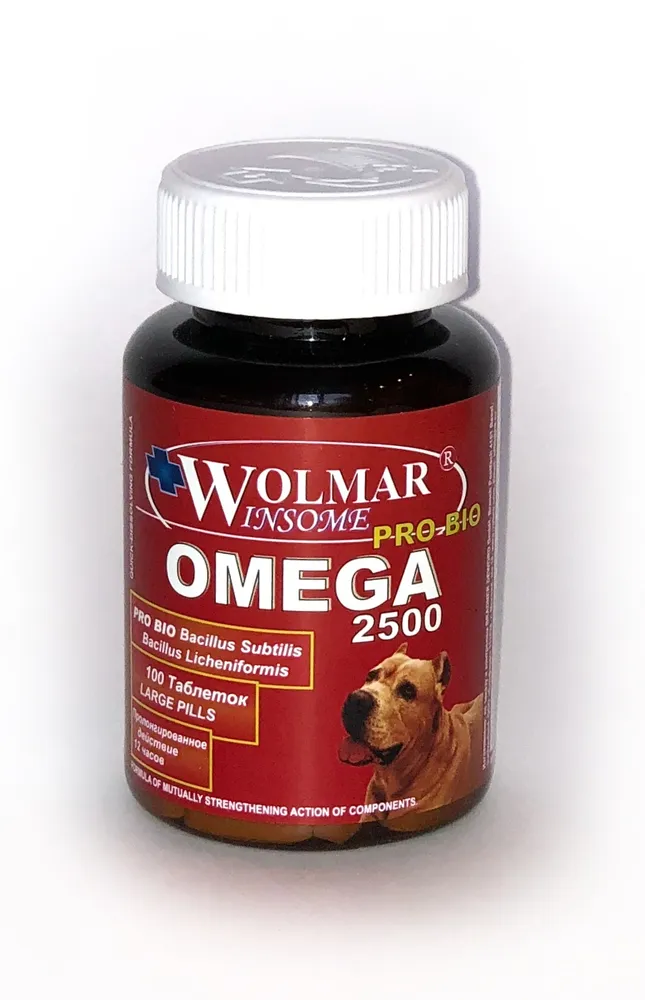 Cинергический мультикомплекс сбалансированный с учетом потребностей и особенностей собак средних и крупных пород, в форме близкой к 100% от ежедневной нормы потребления витаминов.PRO BIO OMEGA 2500Активные компоненты препарата, (витамины, полиненасыщенные жирные кислоты, глюкозамин сульфат, аминокислоты, пробиотики B. Subtilis (CH201) и B.Licheniformis (CP200)), являются важной составной частью в основных метаболических процессах у собак и положительно влияют на все без исключения процессы в организме.Применение препарата - позволяет в минимальные сроки устранить авитаминозы и последствия гиповитаминозов. Нормализует обмен веществ, улучшает пищеварение, переваривание жиров и витаминов, как следствие, улучшается общая кондиция собаки в целом, состояние кожного покрова и шерсти. Содержащиеся в комплексе глюкозамин сульфат и аминокислоты позволяют поддерживать метаболизм в суставных тканях, синтез коллагена, эластичность и прочность сухожильно-связочного аппарата.Показания:Профилактика состояний недостатка витаминов. При повышенных физических нагрузках на суставы.Для улучшения местных процессов обмена веществ в суставных тканях.Способ применения и дозы:Уточните вес собаки- 1 таблетка на 40 кг веса в день, отдельно или в смеси с кормом, растворить таблетку/таблетки в 30/50 мл воды, перемешав добавить в корм или скормить с руки не растворяя, (или половину таблетки на 20 кг веса в день)Состав:витамины в комплексе: ретинола ацетат, холекальциферол, d-альфа токоферола ацетат, тиамин, рибофлавин, пиридоксина гидрохлорид, цианокобаламин, менадион (К3), биотин, никотиновая кислота, d-пантотенат кальция, фолиева кислота, смесь аминокислот стандартизированная, экстракция в комплексе ARA, DHA, глюкозамин сульфат (ст), стандартизированная смесь Bacillus licheniformis (СР 200/DSM5749), Bacillus subtilis (CH 201/DSM5750), ПВП, МКЦ, ароматизатор.