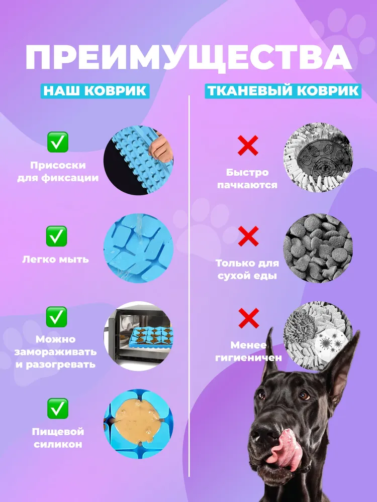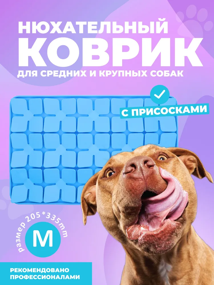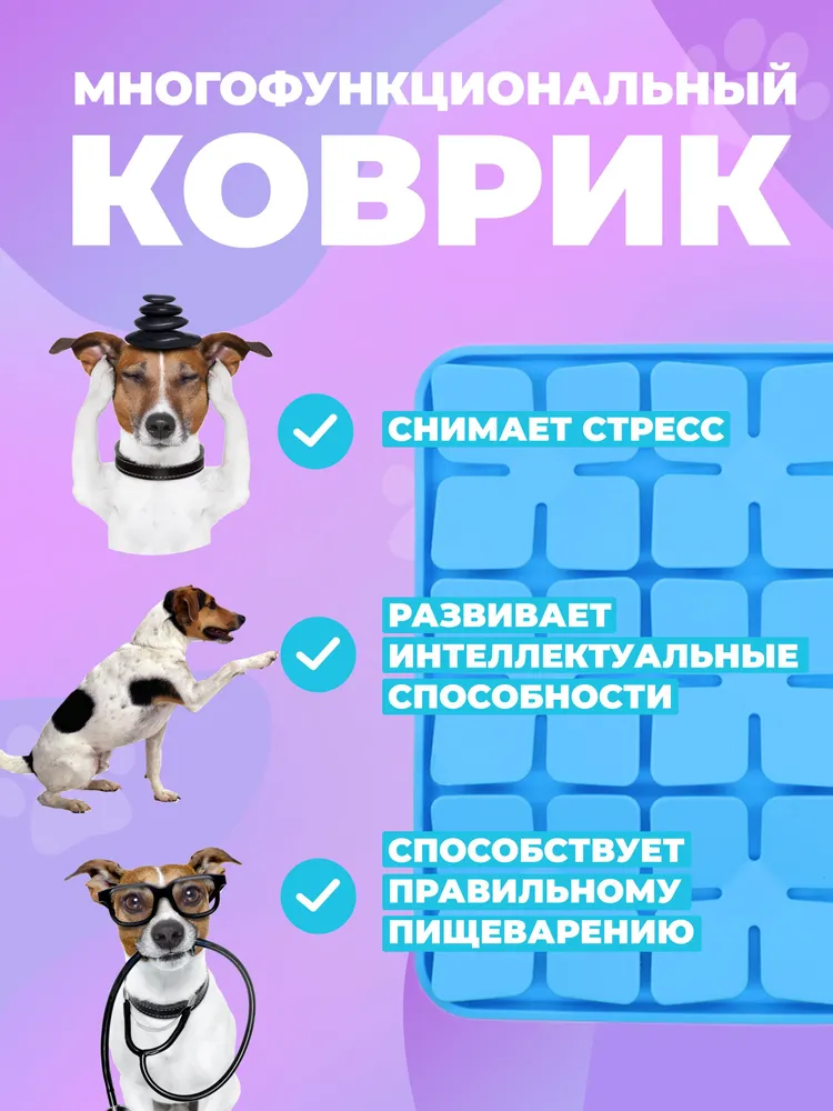 Коврик имеет присоски, которые помогают фиксировать его на любой поверхности, так что ваша собака не сможет перевернуть его или сдвинуть с места. Это позволяет вашей собаке наслаждаться игрой и поиском лакомств, не отвлекаясь на перемещение коврика.Игра "Ищи"Вы можете использовать коврик с различными видами еды, такими как сырые кусочки мяса, кусочки фруктов или овощей, сырые яйца, кусочки сухих кормов, и т.д. Также вы можете использовать коврик для обучения собаки различным командам, например, "Ищи!" или "Найди!".Преимущества использования:1. Развитие интеллектуальных способностей собаки: когда ваша собака ищет лакомства на коврике, она развивает свои интеллектуальные способности и учится решать проблемы.2. Уменьшение стресса: использование коврика может помочь вашей собаке уменьшить стресс и тревожность, особенно если она часто остается одна дома.3. Улучшение пищеварения: когда собака ест слишком быстро, это может привести к проблемам с пищеварением. Использование коврика может помочь замедлить ее еду и улучшить пищеварение.4. Помогает занять: Нюхательный коврик позволяет собаке заняться поиском лакомств, что может служить отличным развлечением, когда у владельца есть важные дела, а также уменьшить вероятность того, что собака станет скучать или проявлять разрушительное поведение.Легко мыть