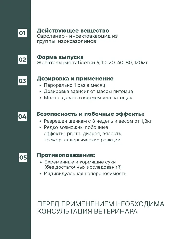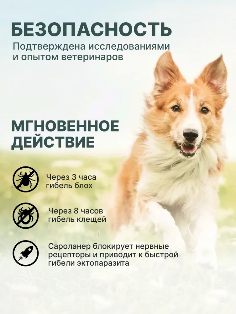 Симпарика относится к группе инсектоакарицидных препаратов системного действия. Входящий в состав препарата сароланер – соединение изоксазолиновой группы, активно в отношении блох, иксодовых, саркоптоидных, псороптоидных и демодекозных клещей, паразитирующих на собаках. Сароланер действует в нервно-мышечных синапсах членистоногих и подавляет функцию рецептора нейромедиатора, гамма-аминомасляной кислоты (ГАМК) и глутаматного рецептора, вызывая неконтролируемую нейромышечную активность, приводящую к гибели насекомых и клещей. После перорального введения сароланер быстро всасывается в желудочно-кишечном тракте (биодоступность составляет >85%), поступает в системный кровоток, достигая максимальной концентрации в плазме менее чем через 3 часа, проникает в большинство органов и тканей, практически не метаболизируется, выводится из организма в неизмененной форме, преимущественно с желчью и фекалиями, период полувыведения составляет 10-12 суток. После перорального введения таблетки действие препарата сохраняется на протяжении не менее 5 недель (35 дней). Препарат вызывает гибель блох, паразитирующих на собаке, не позже, чем через 3 часа, а иксодовых клещей – не позже, чем через 8 часов после введения лекарственного препарата. Гибель блох происходит до откладки яиц, что профилактирует контаминацию помещений яйцами и личинками. Симпарика снижает риск передачи возбудителей бабезиоза (Babesia canis), болезни Лайма (Borrelia burgdorferi) и анаплазмоза (Anaplasma phagocytophilum), вследствие уничтожения иксодовых клещей до передачи возбудителей вышеуказанных болезней. Симпарика по степени воздействия на организм относится к веществам малоопасным (4 класс опасности по ГОСТ 12.1.007) со слабо выраженными кумулятивными свойствами, в рекомендуемой дозе не обладает мутагенной, канцерогенной, эмбриотоксической и тератогенной активностью.\n\nПоказания\n\nНазначают собакам для лечения и профилактики энтомозов, вызываемых блохами, акарозов, вызываемых иксодовыми, саркоптоидными, псороптоидными и демодекозными клещами.\n\nПротивопоказания\n\nПовышенная индивидуальная чувствительность к компонентам препарата, а также выраженные нарушения функции печени и почек. Не подлежат обработке больные инфекционными болезнями и выздоравливающие животные, а также щенки моложе 8-недельного возраста.\n\nВзаимодействие\n\nИнформация о несовместимости Симпарики с лекарственными препаратами других фармакологических групп отсутствует.\n\nСпособ применения и дозы\n\nСимпарику применяют собакам в любое время года индивидуально перорально с руки, или в смеси с кормом, или вводят принудительно в пасть в минимальной дозе 2 мг сароланера на один килограмм массы животного. Прием корма на биодоступность сароланера не влияет. Препарат обладает привлекательным вкусом и, как правило, охотно поедается собаками. Следует убедиться в том, что собака проглотила таблетку с необходимой дозой препарата. При подборе дозы не допускается разламывать и делить таблетки. В сезон активности блох и иксодовых клещей препарат следует применять ежемесячно. При лечении саркоптоза, демодекоза и отодектоза Симпарику применяют двукратно с интервалом 30 дней.