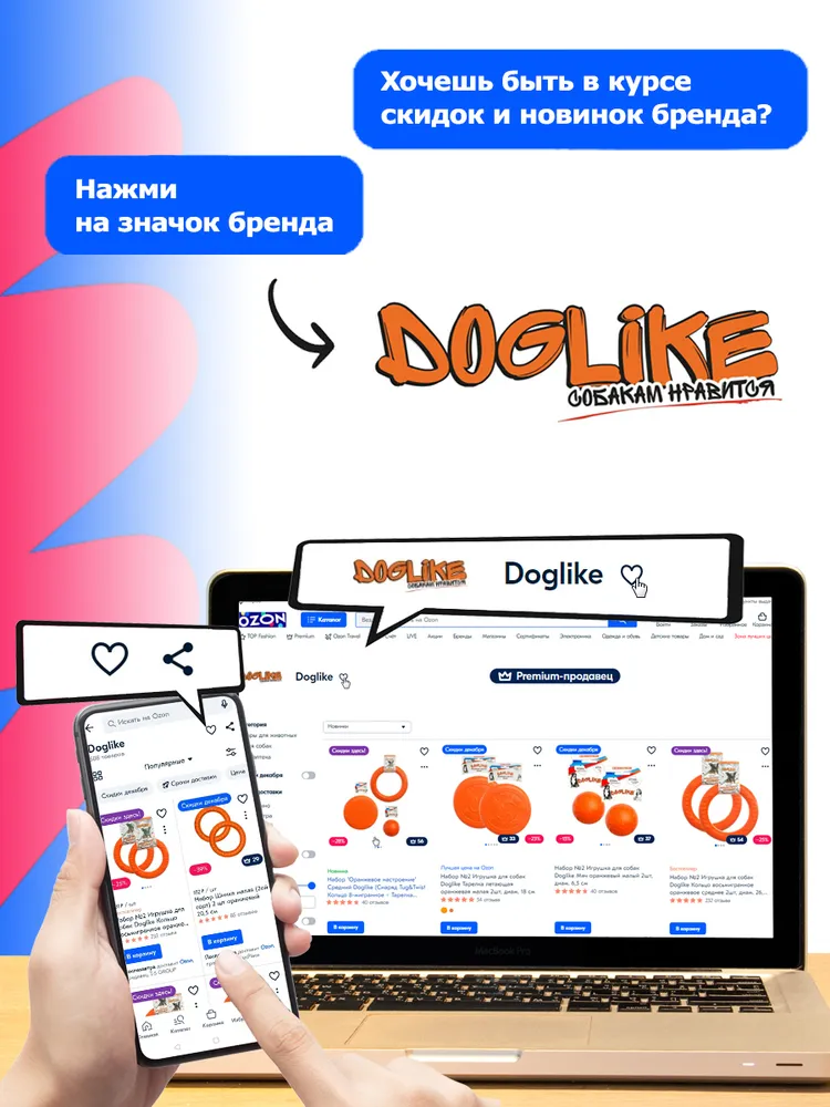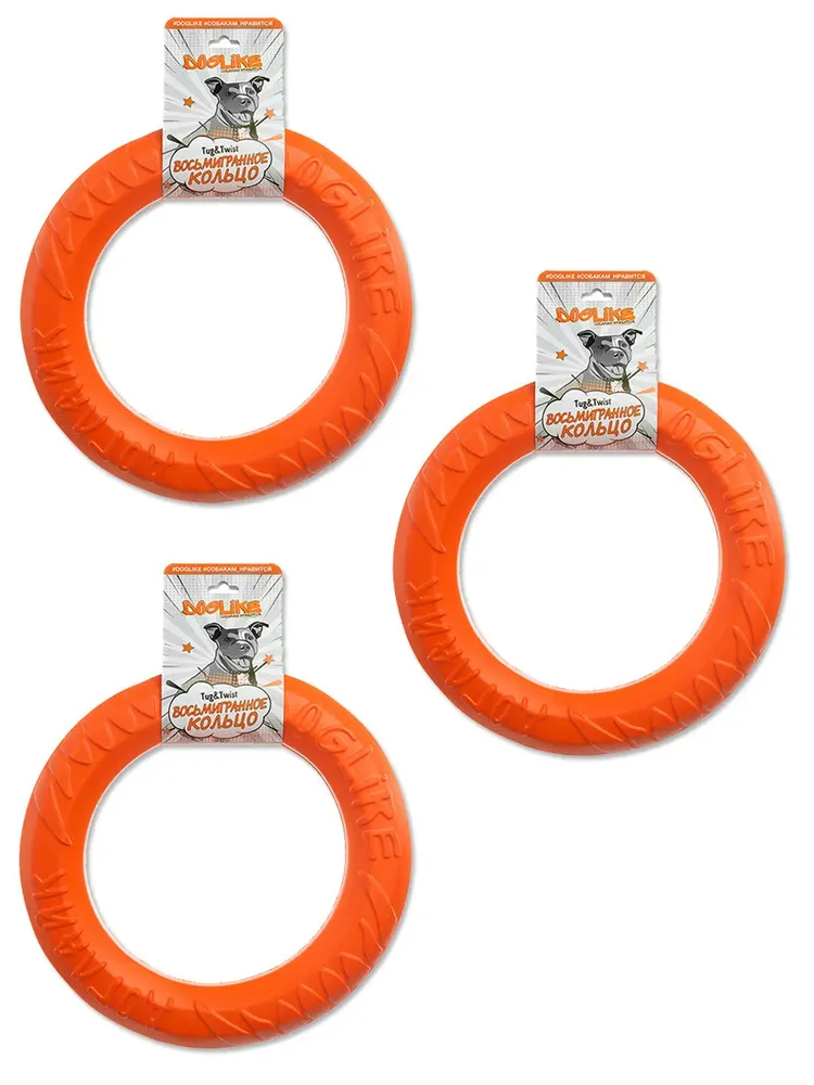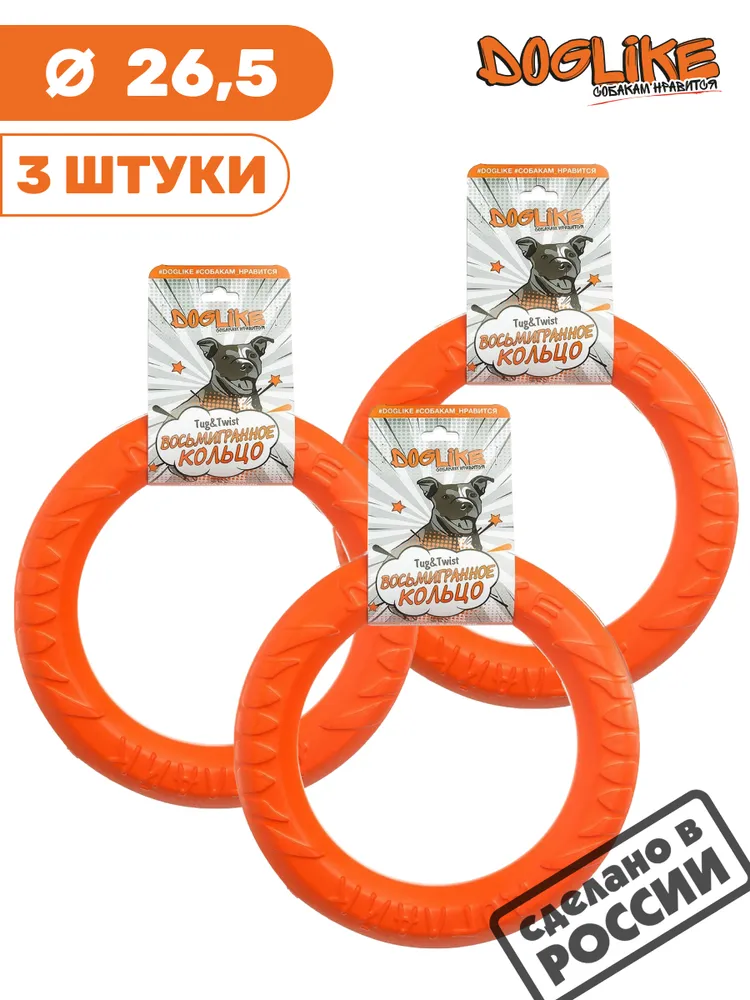 Набор из трех восьмигранных Средних колец Doglike.\n\nВосьмигранное усиленное кольцо - отличный снаряд для аппортировки и игры с собакой. Кольцо изготовлено из композитного материала по усиленной формуле, прочное и износостойкое. Питомец обязательно оценит такую игрушку и ответит любовью, здоровьем и отличным настроением!\n\nВ набор входит 3 кольца 2 сорта, имеющих незначительное отклонение во внешнем виде от колец 1 сорта. Эти отклонения не влияют на физико-технические и эксплуатационные свойства колец, но при этом позволяют существенно сэкономить.\n\nСнаряд не тонет в воде и имеет малый вес - это позволяет Вашему питомцу не только получать удовольствие от плавания, но и обеспечивает нагрузкой все группы мышц.\n\nРазнообразие упражнений: перетягивание кольца, подвешивание на высоте, аппортирока, обучение командам: «дай», «взять» и т.д.\n\nЯркое кольцо хорошо заметно на снегу, воде и в траве.\n\nВосьмигранное сечение не позволяет кольцу прокручиваться в руке.\n\nХарактеристики:\n\nРазмер: диаметр 26,5 см, толщина 4,6 см.\n\nКольцо идеально подходит для собак ростом 40-56 см и весом от 10 до 20 кг. для средних и крупных пород собак.\n\nСохраняет эластичность -50 +50.\n\nЭкологический чистый материал.\n\nМатериал: ЭВА.\n\nПроизводство: Россия.\n\nНабор 3 штуки.