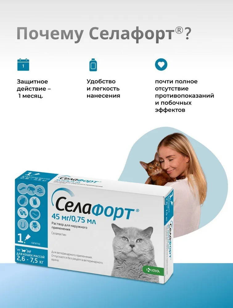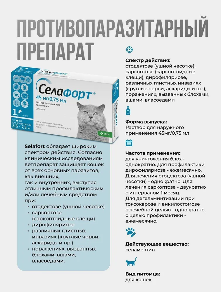 Защитное действие – 1 месяц. Капли на холку для одновременной защиты от внешних и внутренних паразитов для кошек и собак.\n\nПреимущества:\n- Активен против основных паразитов, вызывающих зуд. \n- Применяется для лечения блошиного дерматита, отодектоза, саркоптоза. \n- Действует на основных кишечных гельминтов. \n- Применяется для профилактики заражения сердечными гельминтами (дирофиляриозом) и может использоваться у животных, инвазированных взрослыми формами дирофилярий. \n- Хорошо переносится кошками и собаками разных пород, в том числе колли, шелти, аусси и т.д. \n- Применяется щенкам и котятам с 6-недельного возраста. \n- Препарат активен против чесоточных (саркоптоидных) клещей.\n\nСостав\nСелафорт в форме 6% и 12% раствора в качестве действующего вещества содержит селамектин соответственно 60 мг/мл и 120 мг/мл и вспомогательные вещества: изопропиловый спирт, бутилгидрокситолуол, диметилсульфоксид.\n\nПоказания\nСелафорт назначают собакам и кошкам с лечебной и профилактической целью при энтомозах, вызванных блохами, вшами и власоедами, отодектозе, саркоптозе, анкилостомозе и токсокарозе, а также для профилактики дирофиляриоза.\n\nПротивопоказания\nПротивопоказанием к применению является повышенная индивидуальная чувствительность животного к компонентам препарата (в том числе и в анамнезе). Селафорт не следует наносить на влажную и/или поврежденную кожу.\nБеременным и лактирующим самкам при необходимости Селафорт применяют после консультации с ветеринарным врачом. Селафорт не следует применять щенкам и котятам моложе 6-недельного возраста.\n\nУсловия хранения\nПрепарат хранят в закрытой упаковке производителя, в защищенном от прямых солнечных лучей месте, отдельно от продуктов питания и кормов, вдали от нагревательных приборов и открытого огня при температуре от 0°С до 25°С. Хранить пипетки в оригинальной упаковке до использования.\nСелафорт следует хранить в местах, недоступных для детей.